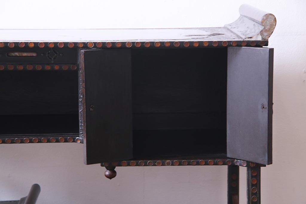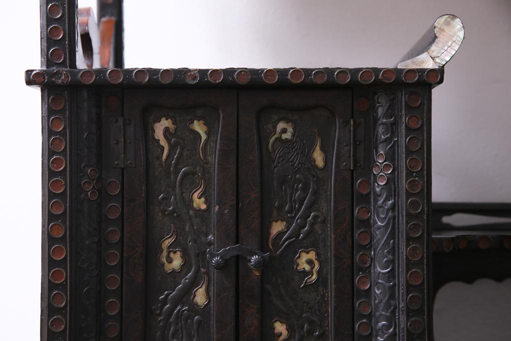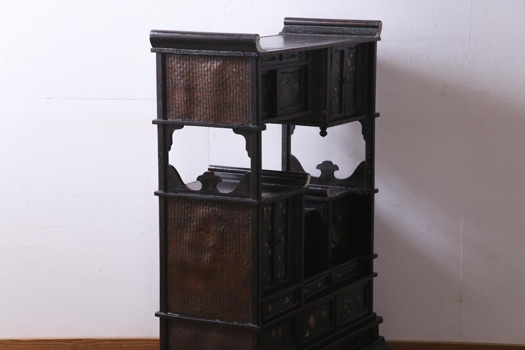 和製アンティーク 漆塗り 布目塗り 螺鈿・象嵌細工 花鳥図の茶棚(飾棚)です。