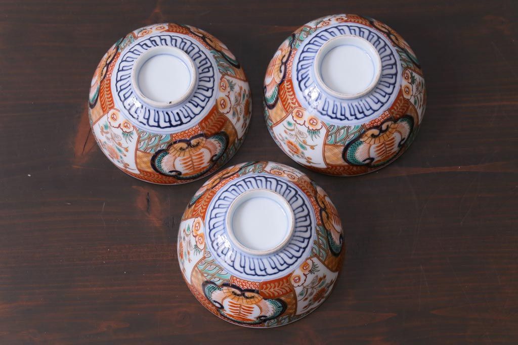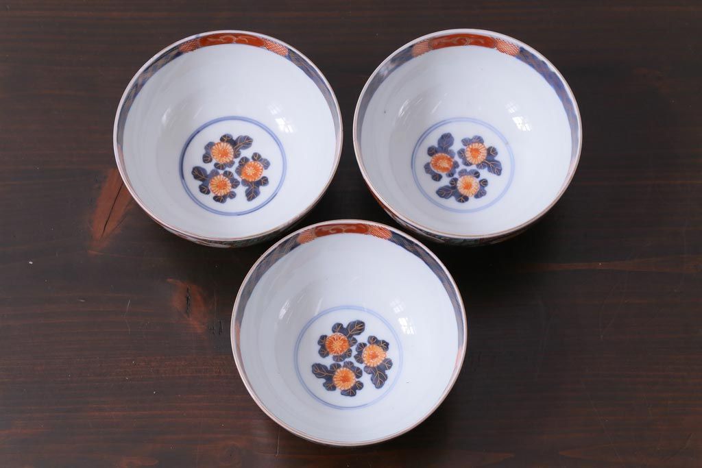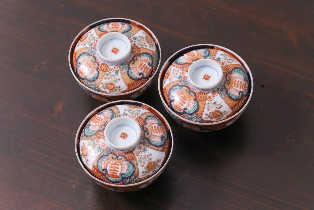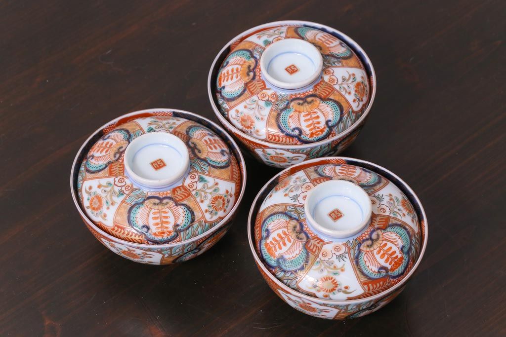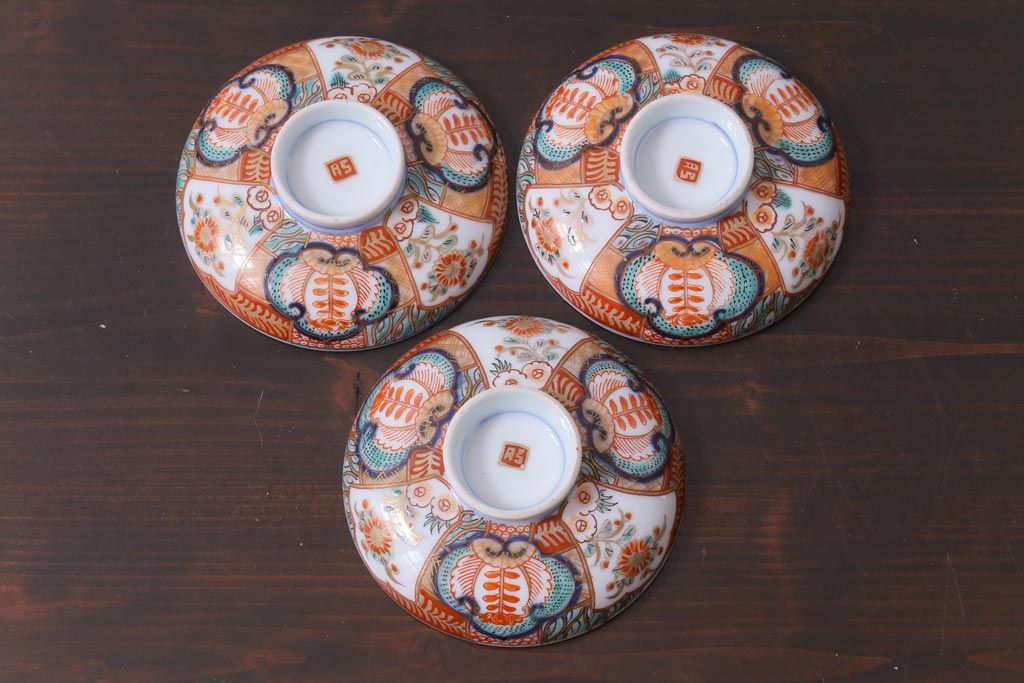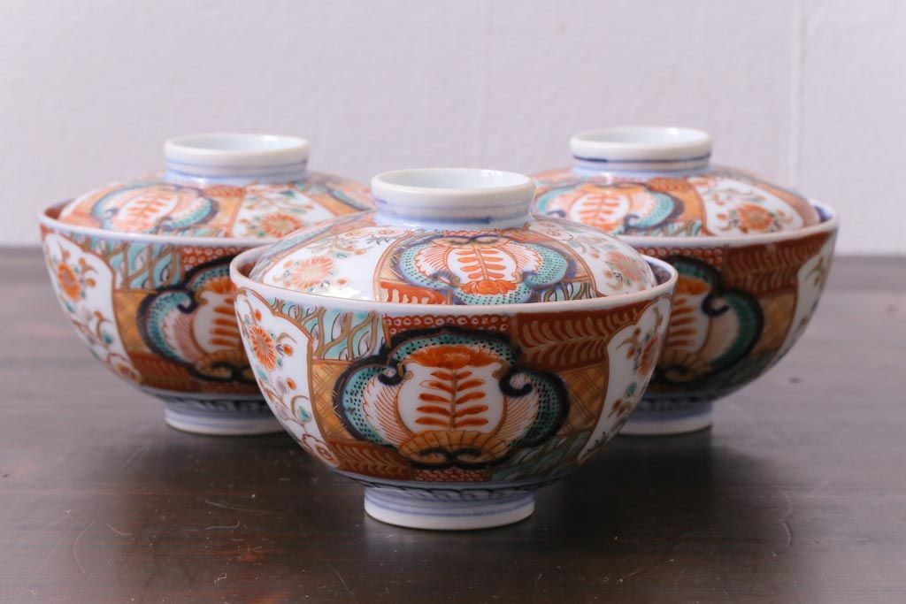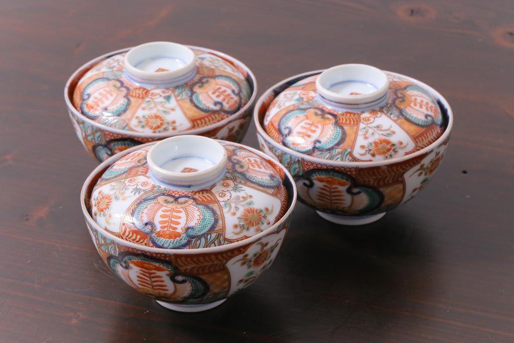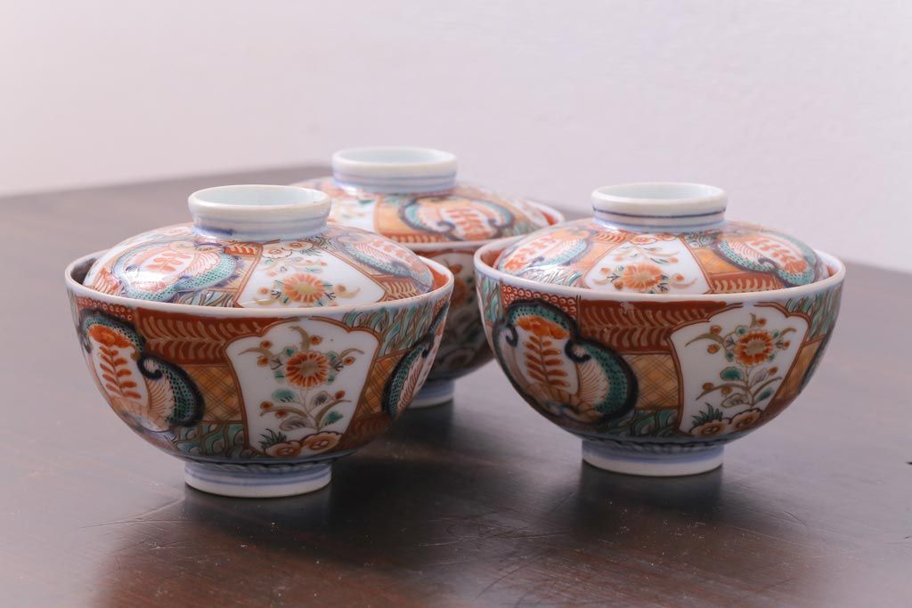 和製アンティーク 伊万里 豊かな彩りを感じる色絵の蓋付き茶碗3客セット(和食器)