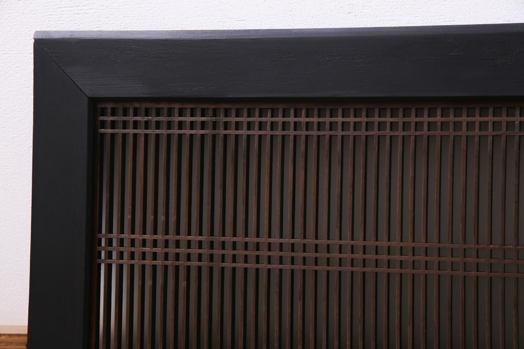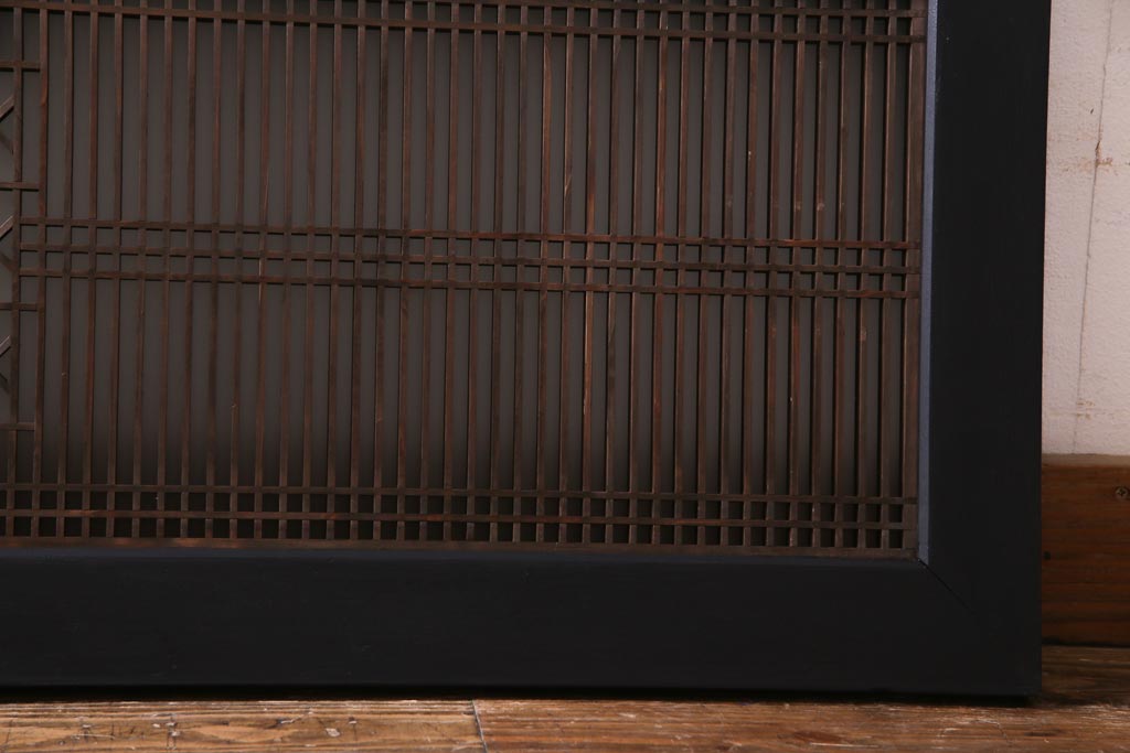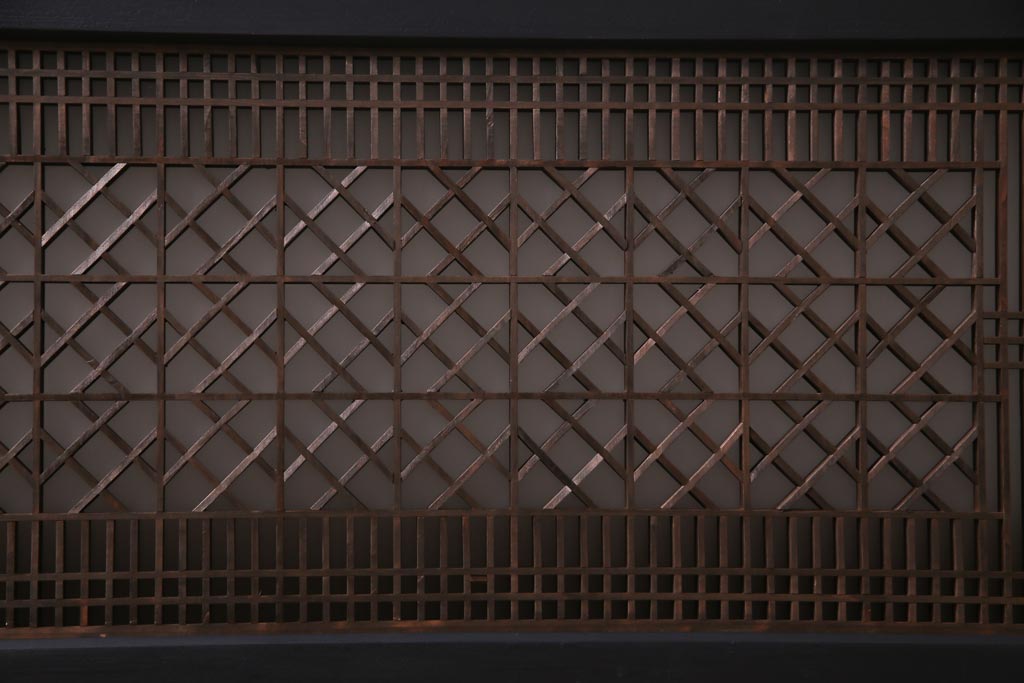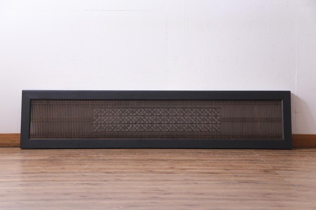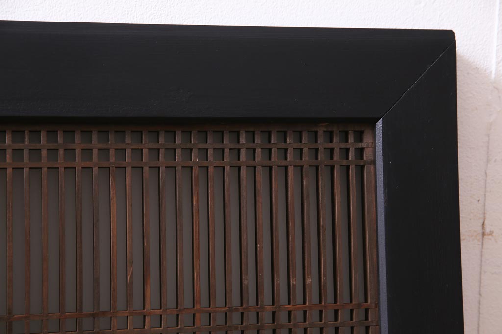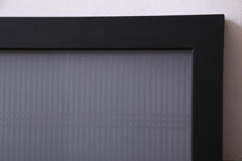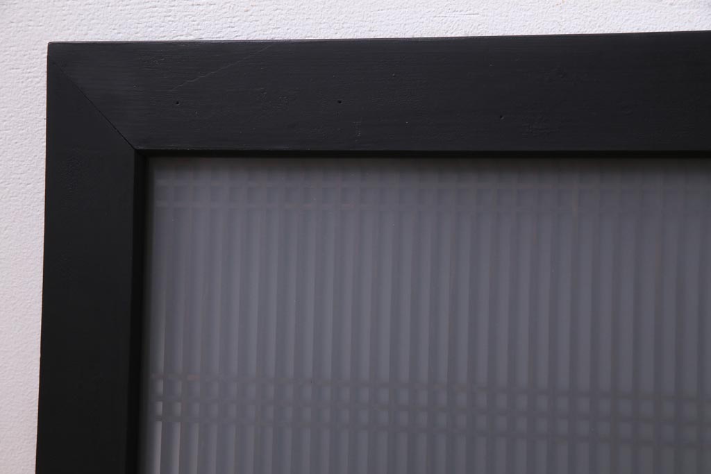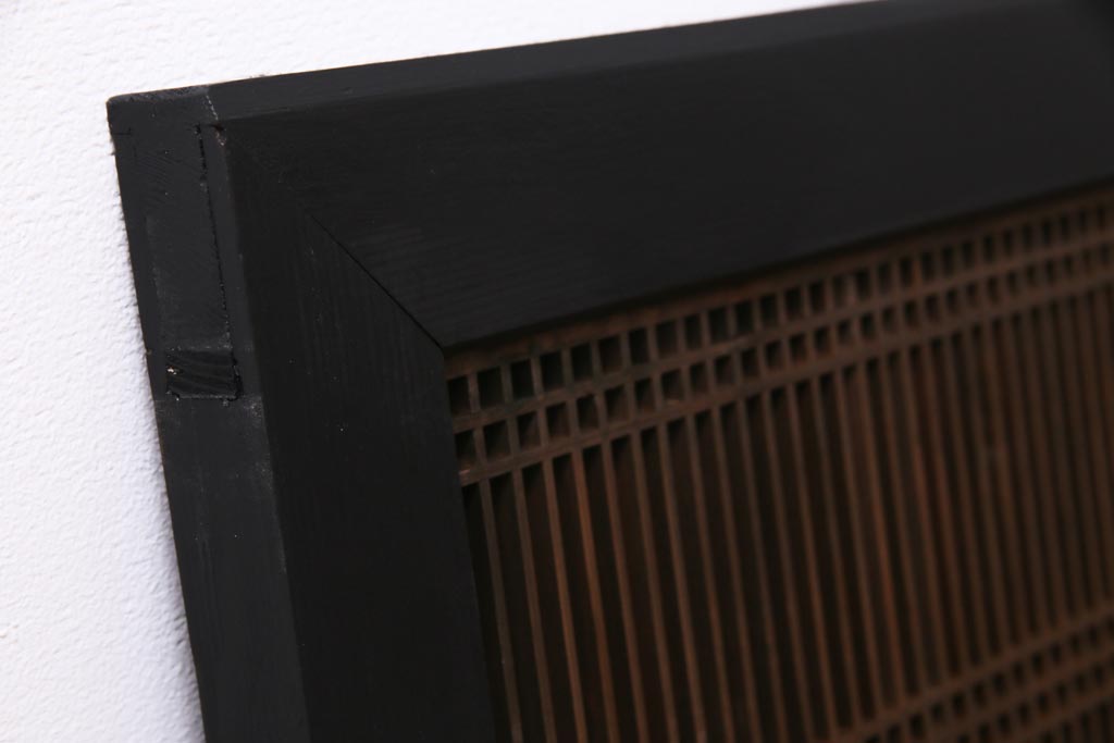 ペイント建具 片面ガラス 格子・枡つなぎ シックな色合いの組子欄間(明り取り、建具)です。 落ち着いた木の色合いの組子が シックな雰囲気を醸し出す欄間です。 当店で枠にツヤのないブラックのペイントを施し、 よりしっとりと大人な印象に仕上がっています。 裏側にすりガラスが入っていますので、 明かりは柔らかく通して視線は遮ってくれますよ。 ペイントカラーはマットブラックです。 画面環境によって実際の商品と多少色味が異なる場合がございます。ご理解の上お願いします。 ダメージが少なく、アンティーク品として高品質なお品です。 使用上問題のあるダメージはありません。 ■框サイズ 上60mm/左50mm/右50mm/下60mm ■重量 約6kg