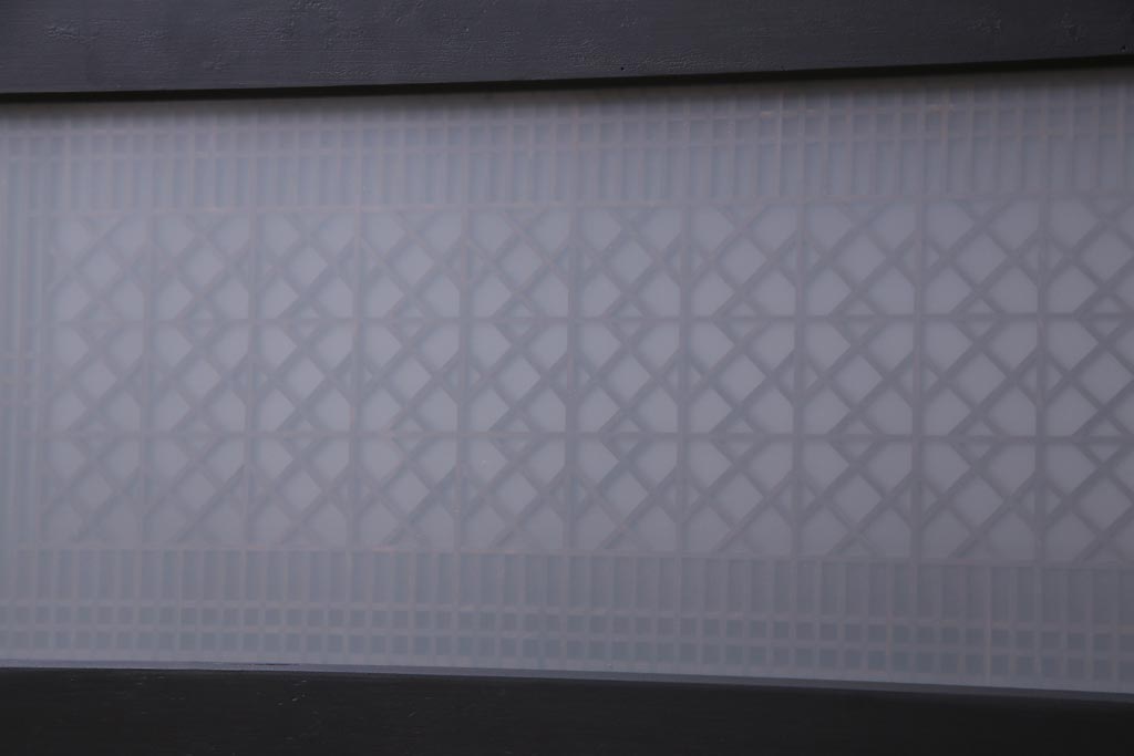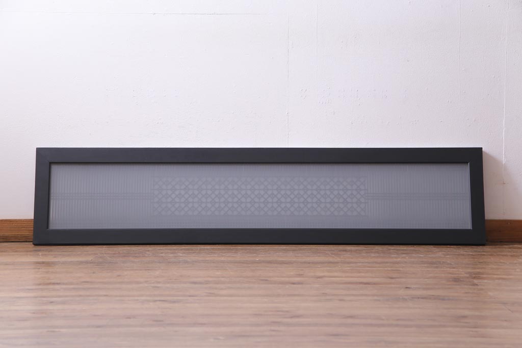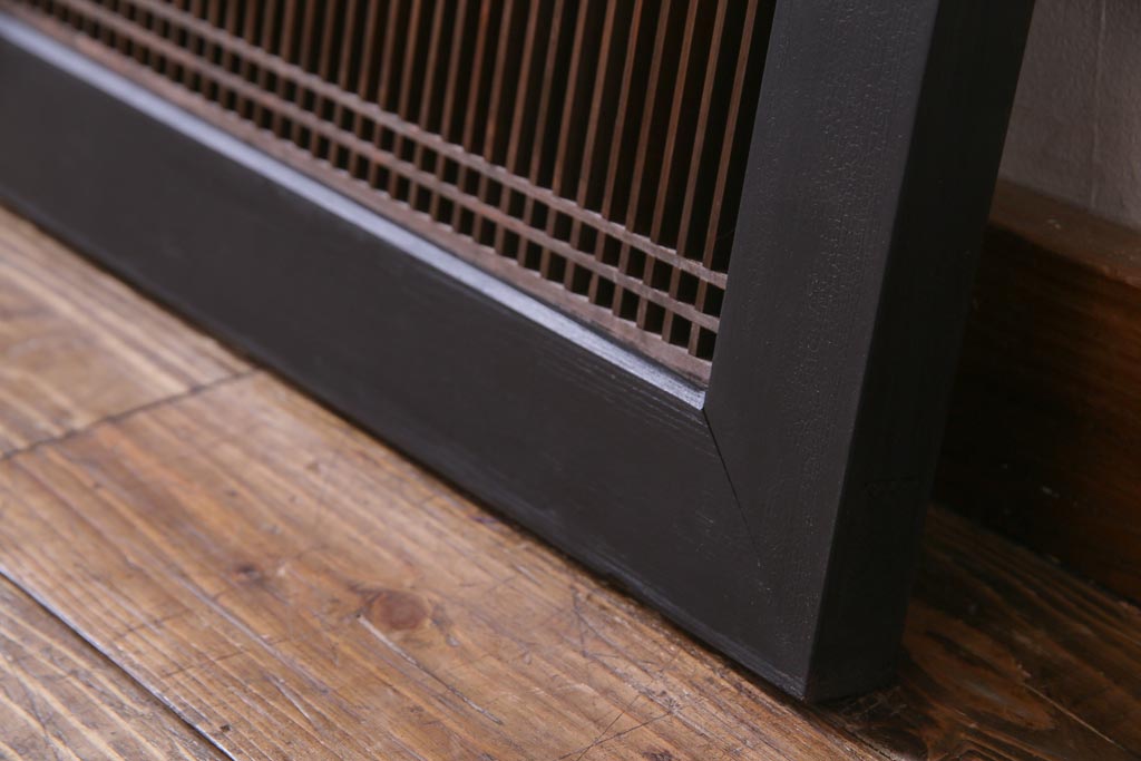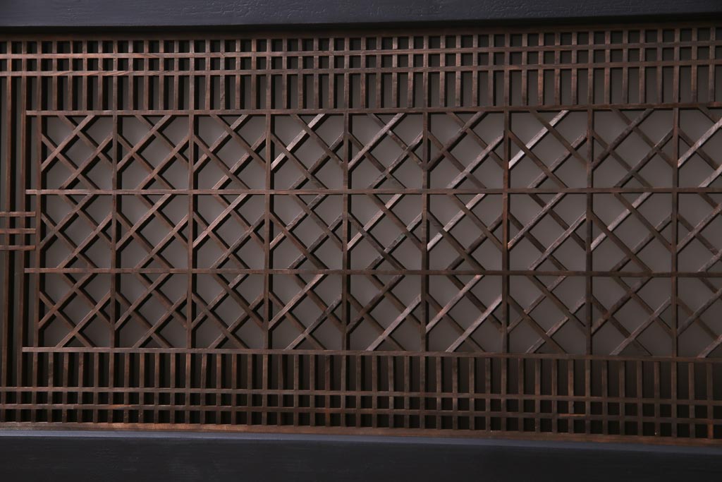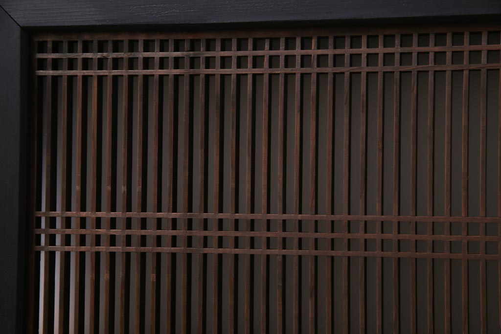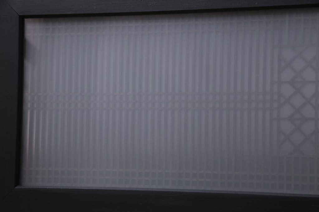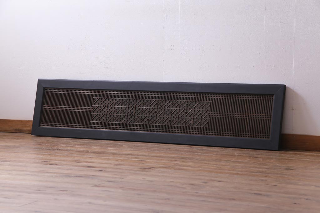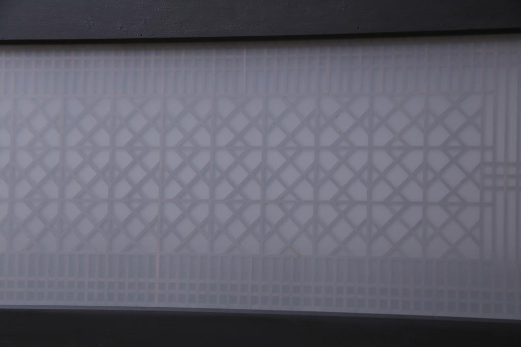 ペイント建具 片面ガラス 格子・枡つなぎ シックな色合いの組子欄間(明り取り、建具)です。 落ち着いた木の色合いの組子が シックな雰囲気を醸し出す欄間です。 当店で枠にツヤのないブラックのペイントを施し、 よりしっとりと大人な印象に仕上がっています。 裏側にすりガラスが入っていますので、 明かりは柔らかく通して視線は遮ってくれますよ。 ペイントカラーはマットブラックです。 画面環境によって実際の商品と多少色味が異なる場合がございます。ご理解の上お願いします。 ダメージが少なく、アンティーク品として高品質なお品です。 使用上問題のあるダメージはありません。 ■框サイズ 上60mm/左50mm/右50mm/下60mm ■重量 約6kg