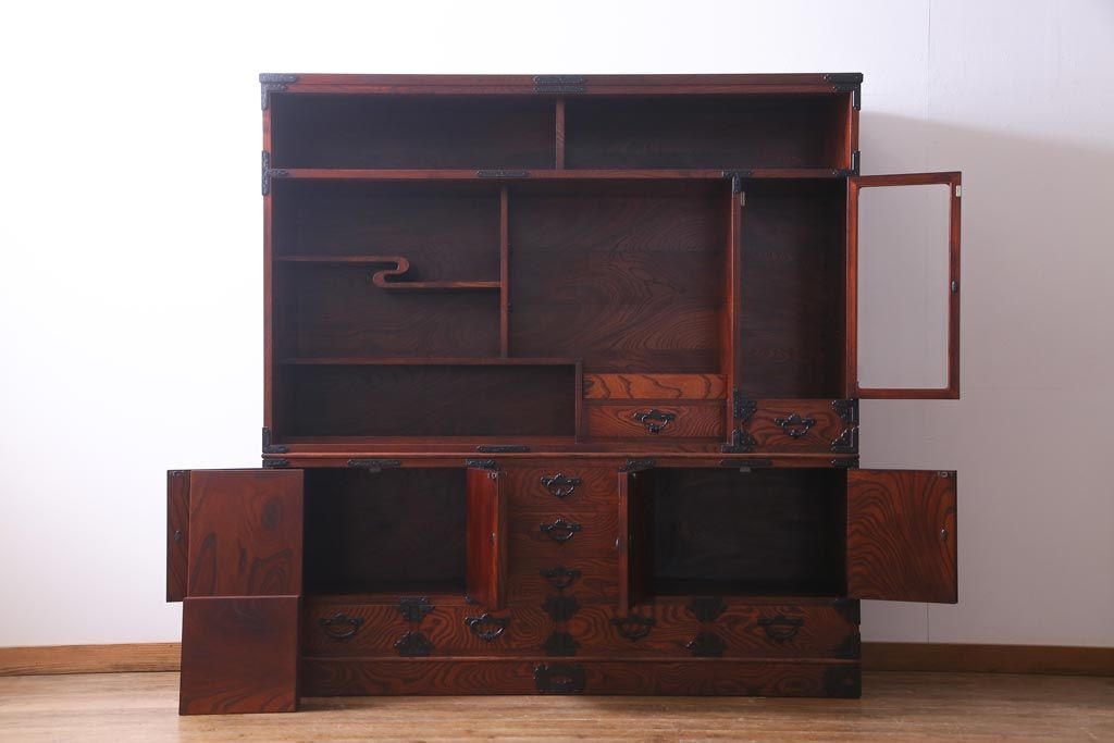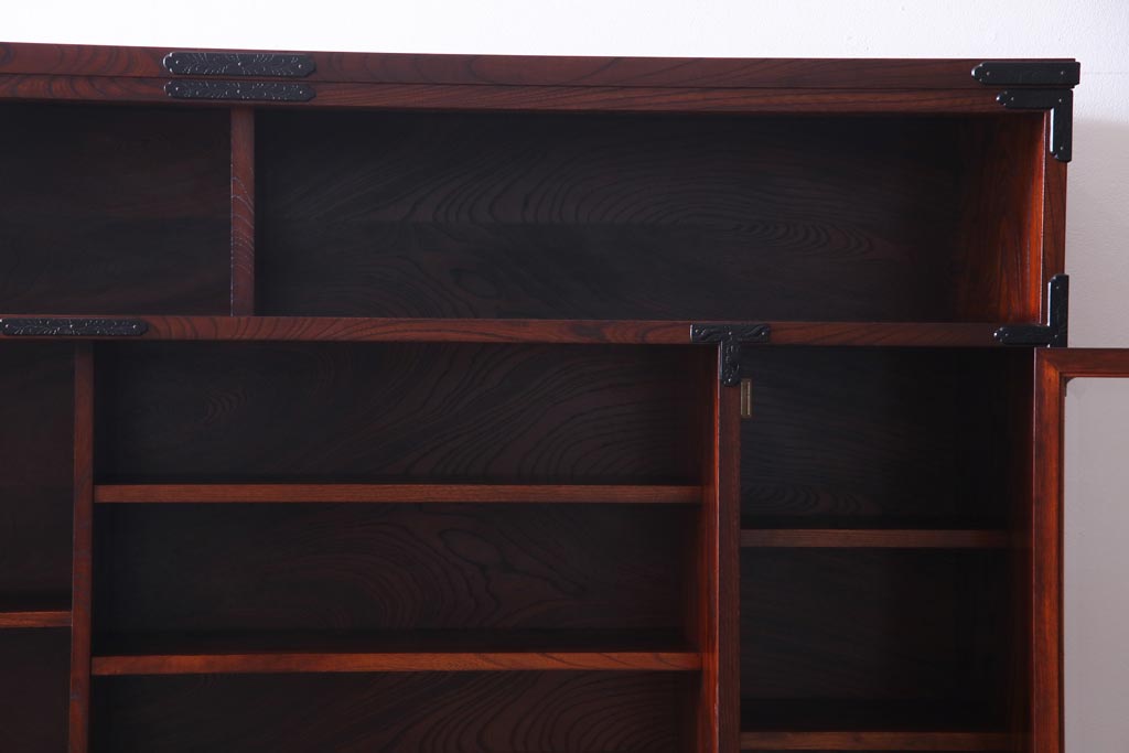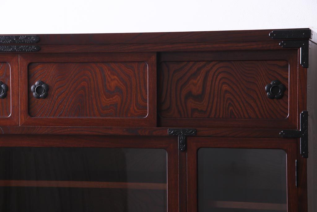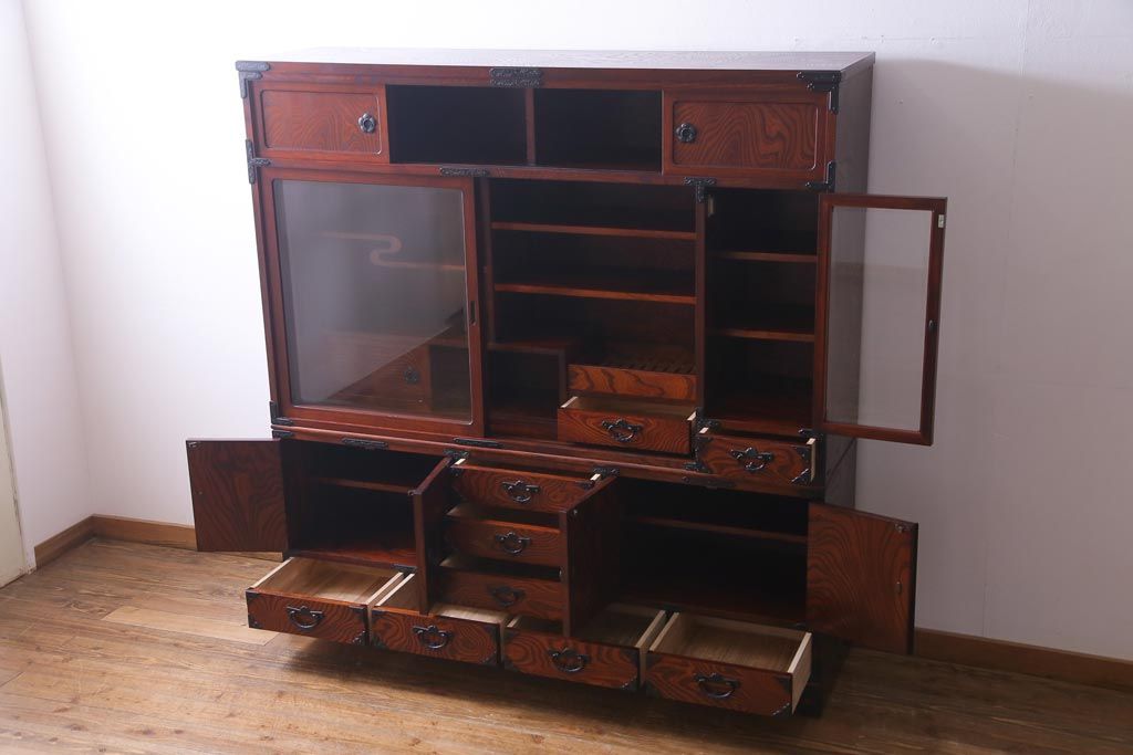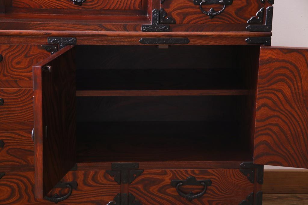 中古 伝統民芸 岩谷堂箪笥 菊幸 欅の杢目と金具が迫力のある61間茶棚(食器棚、収納棚)(定価約146万円)
