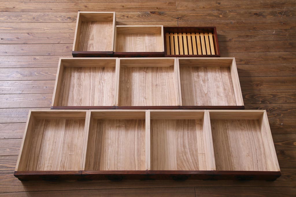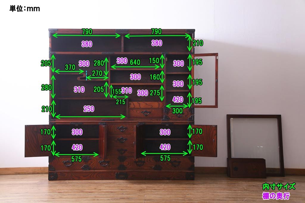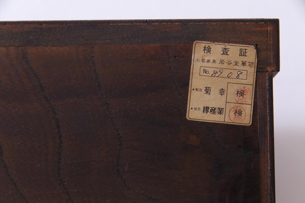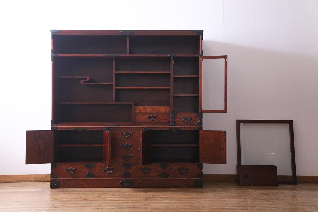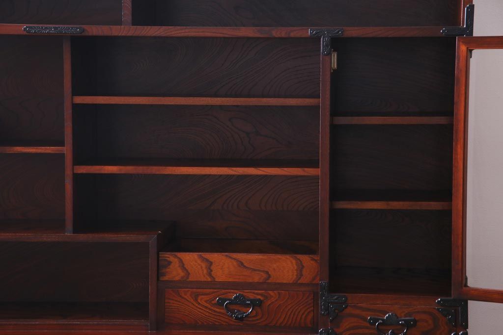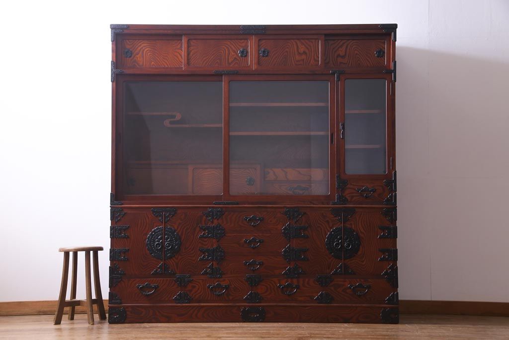 中古 伝統民芸 岩谷堂箪笥 菊幸 欅の杢目と金具が迫力のある61間茶棚(食器棚、収納棚)(定価約146万円)