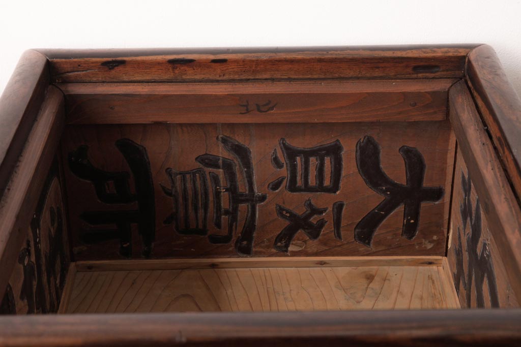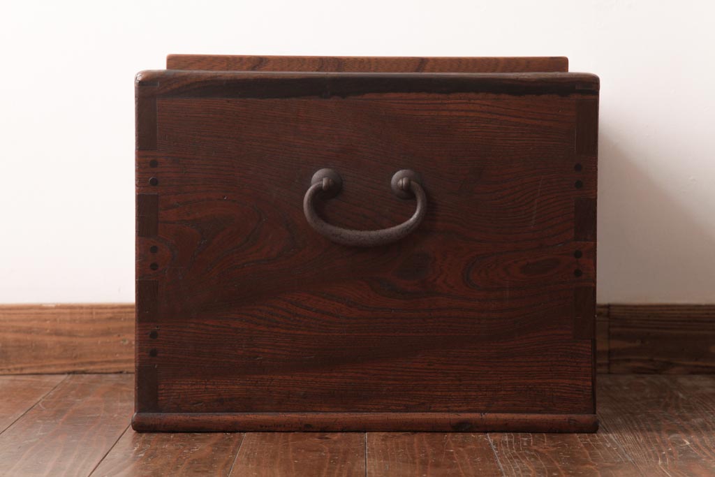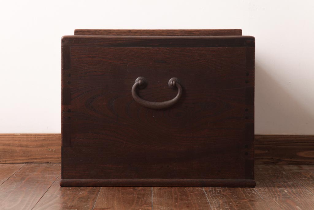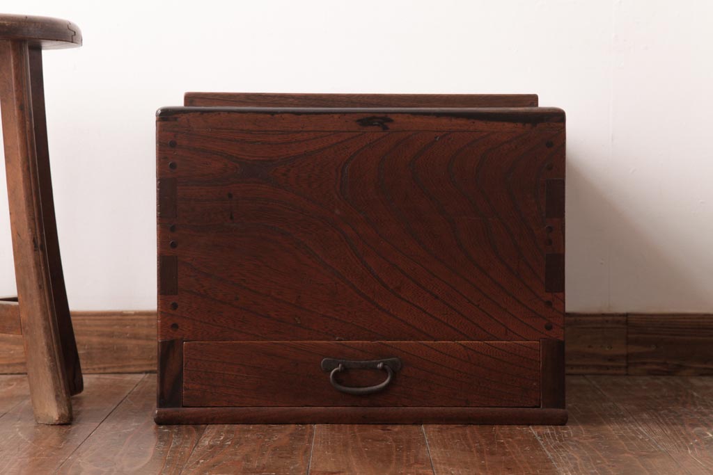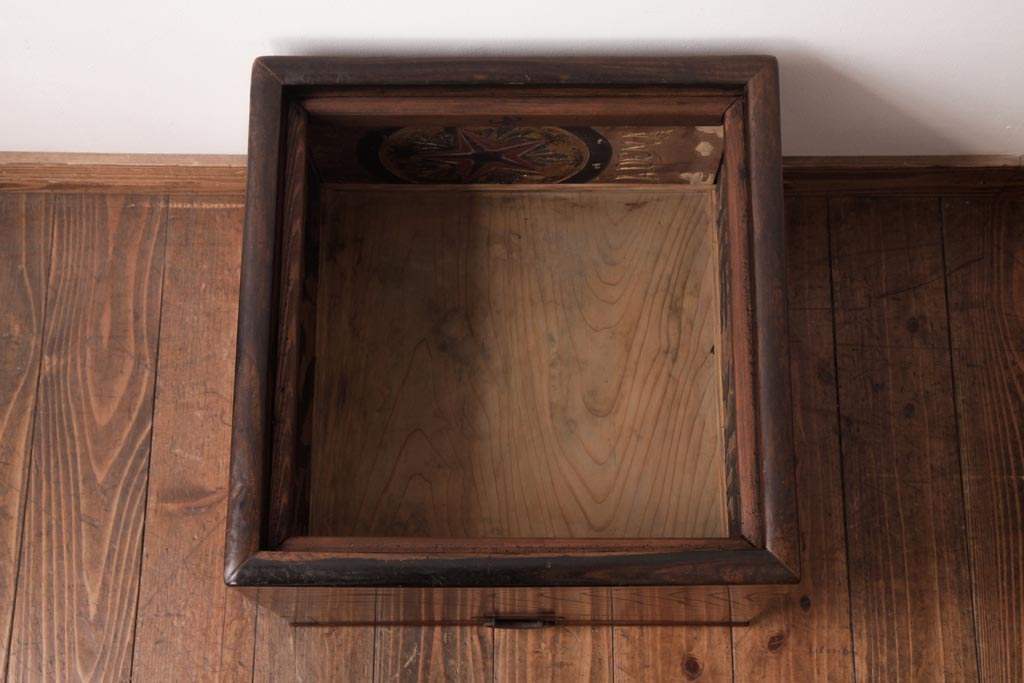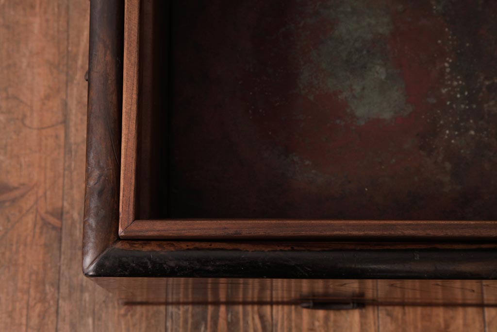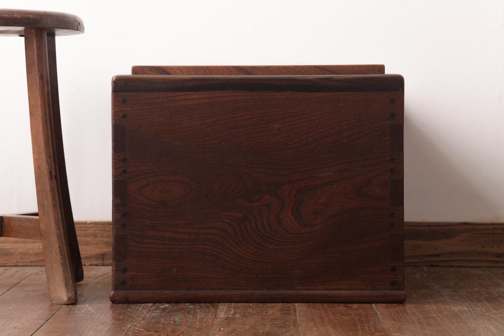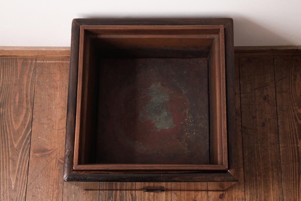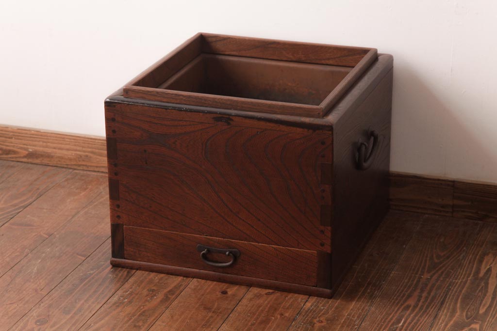 火鉢> 木製火鉢 > アンティーク雑貨 和製アンティーク 引き出し付き 総ケヤキ材 黒柿の縁がポイントの角火鉢(手あぶり、箱火鉢)