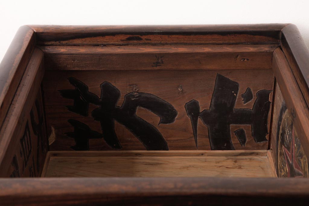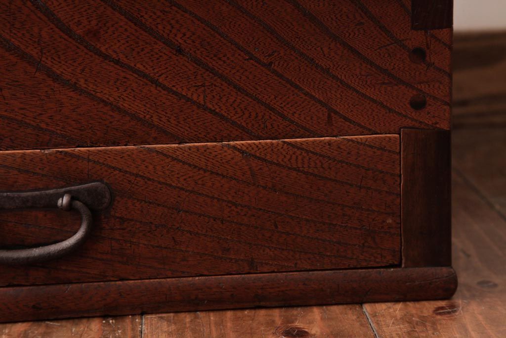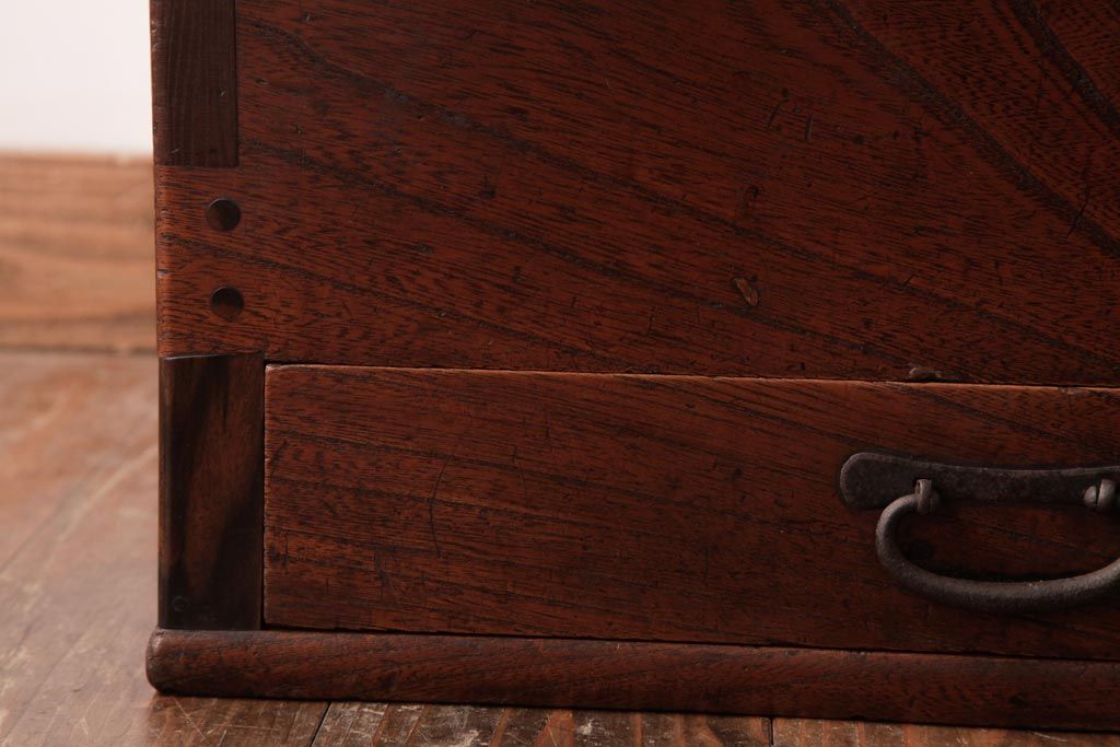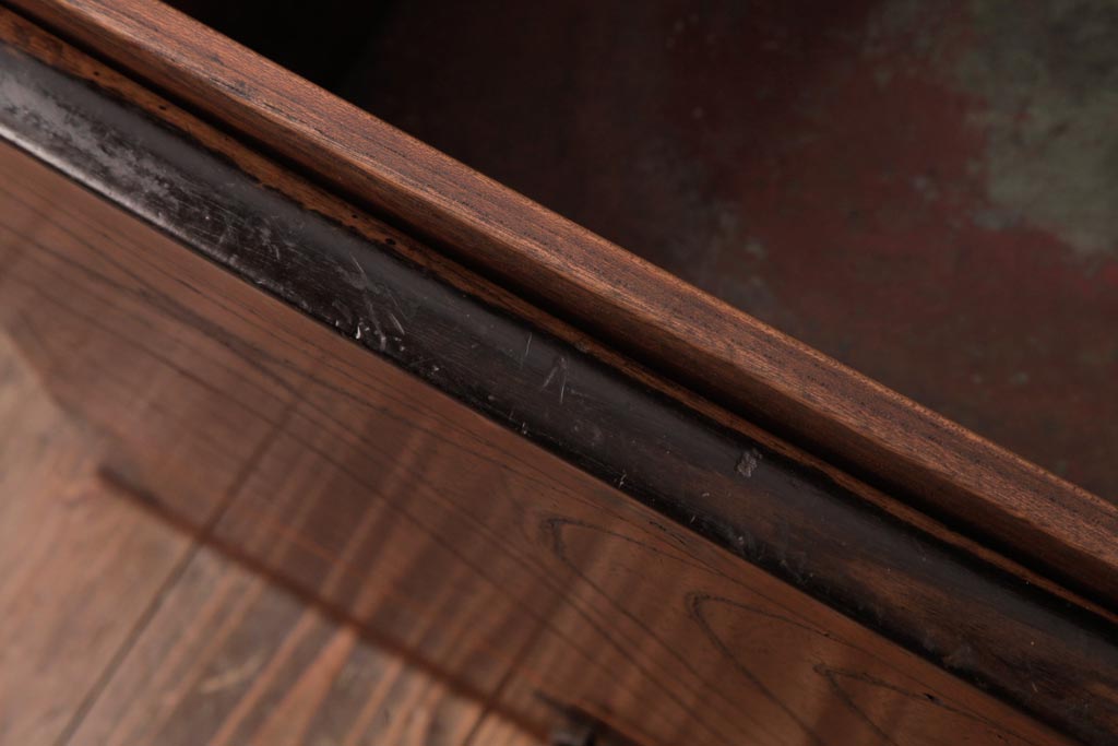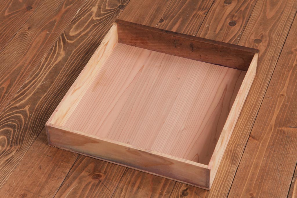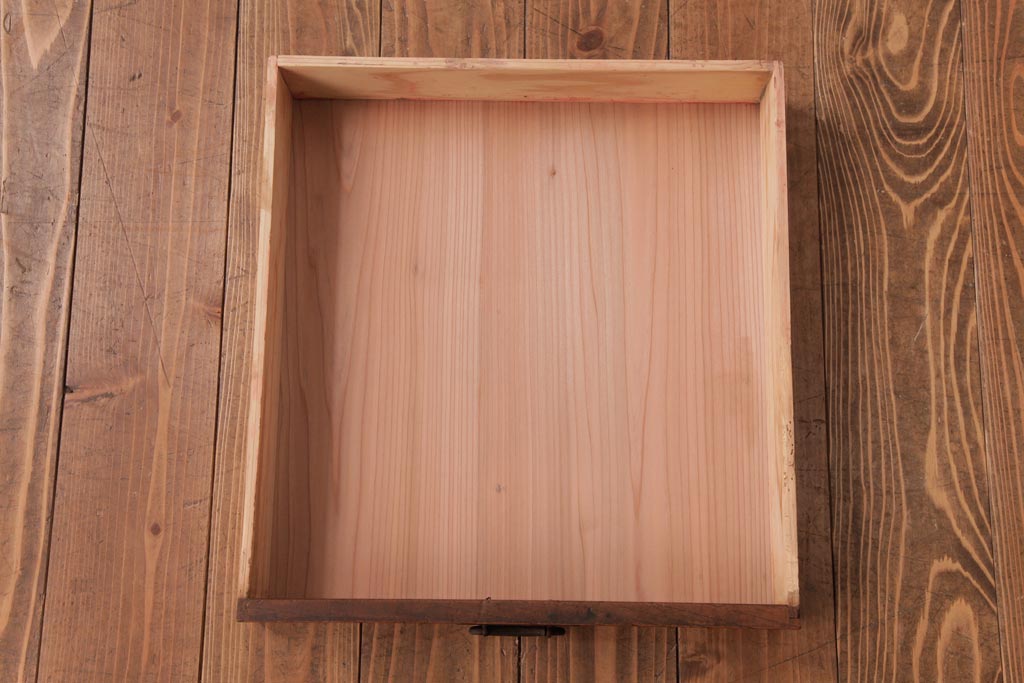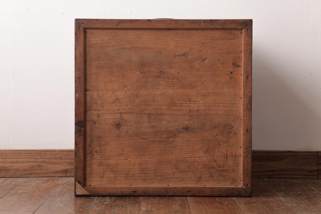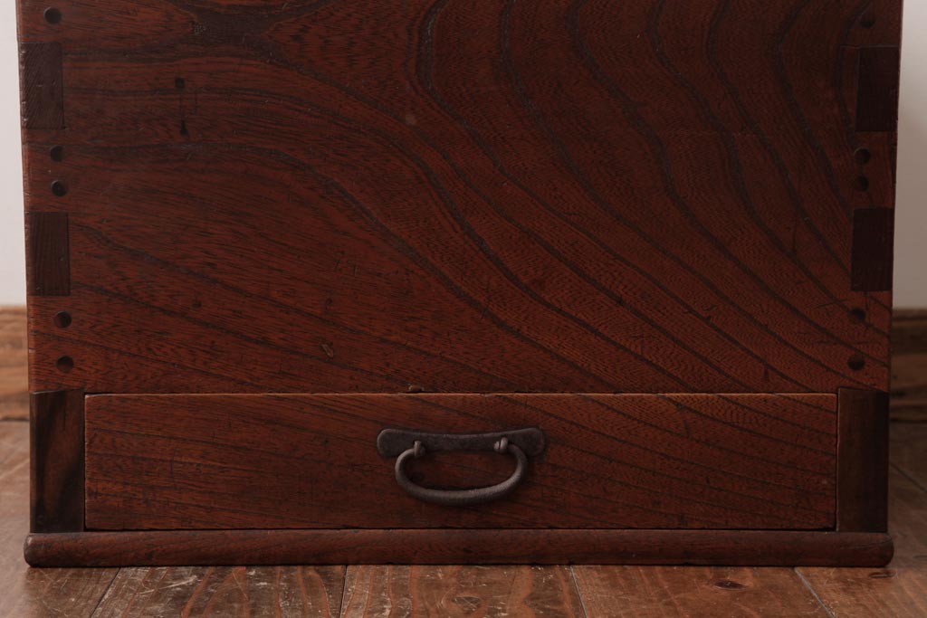 火鉢> 木製火鉢 > アンティーク雑貨 和製アンティーク 引き出し付き 総ケヤキ材 黒柿の縁がポイントの角火鉢(手あぶり、箱火鉢)