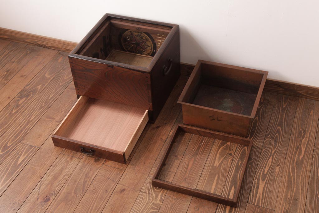 アンティーク雑貨 和製アンティーク 引き出し付き 総ケヤキ材 黒柿の縁がポイントの角火鉢(手あぶり、箱火鉢)