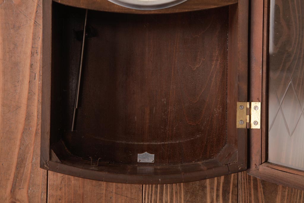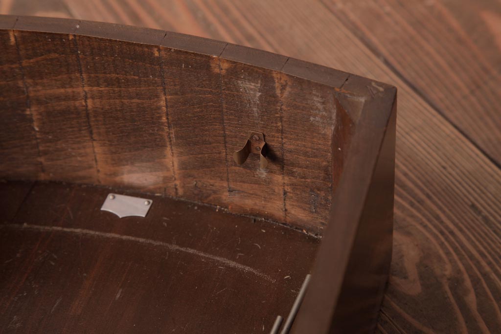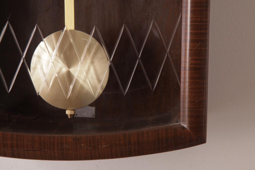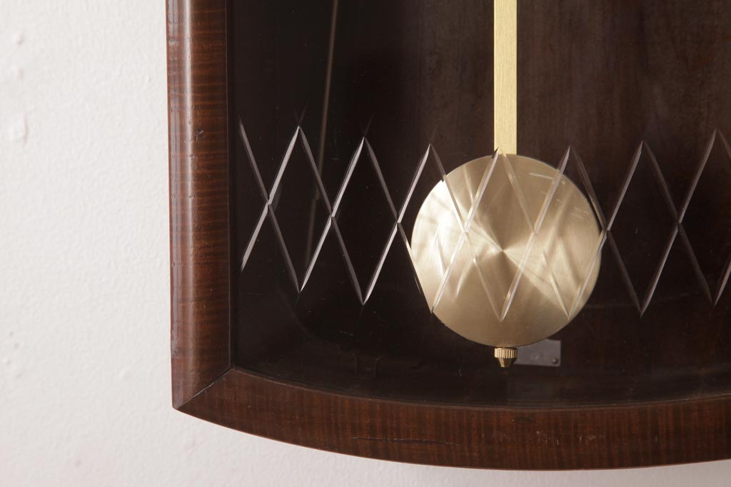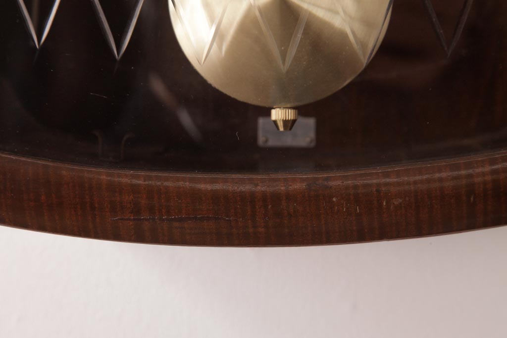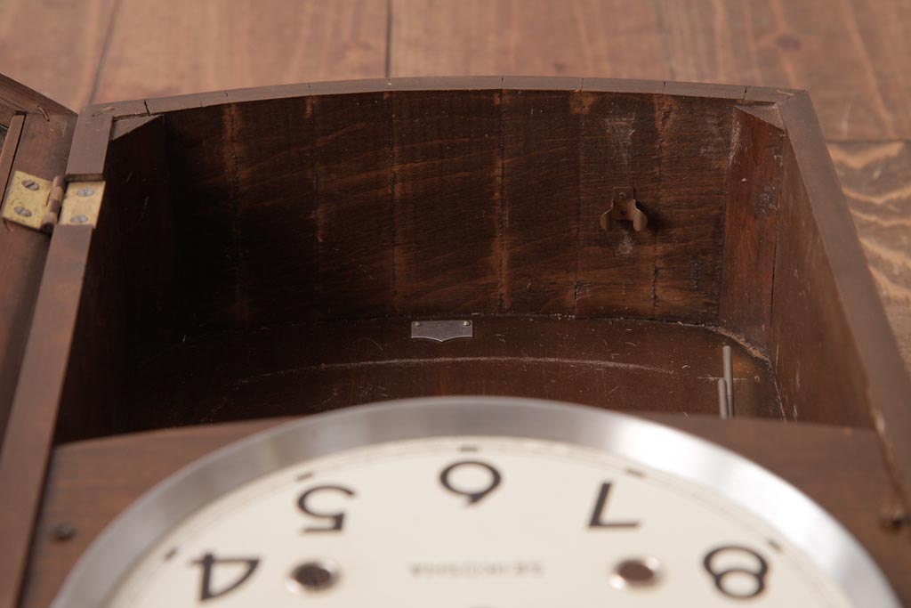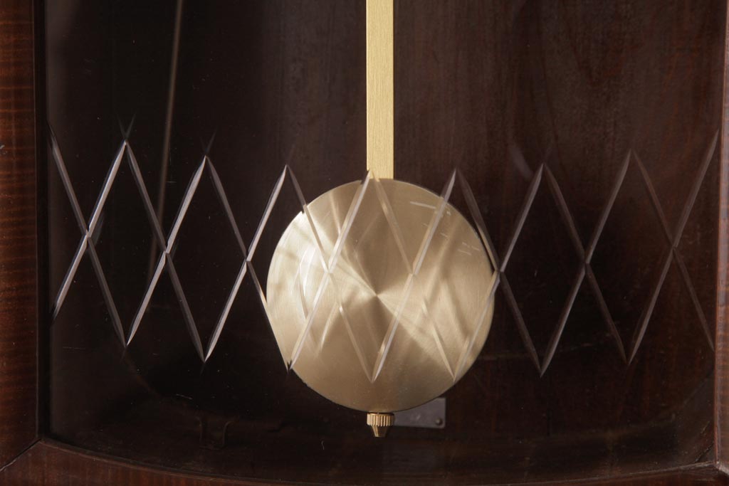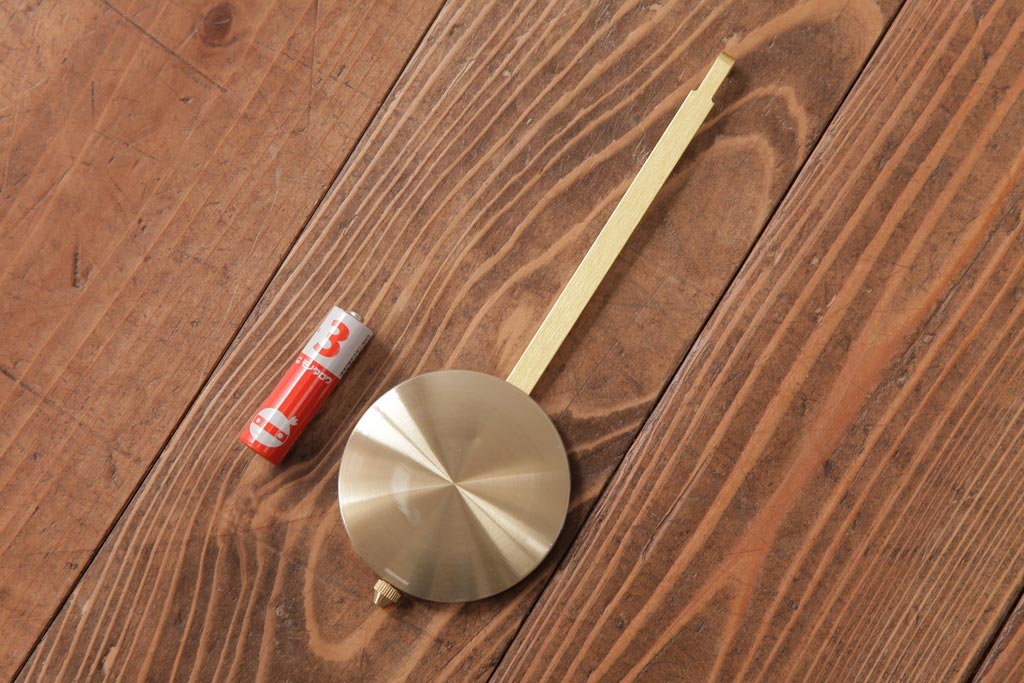ムーブメントは新品の電池式に交換してあります。単三の乾電池が1本付属します。振り子は飾りで、動きますが針と連動はしていません。