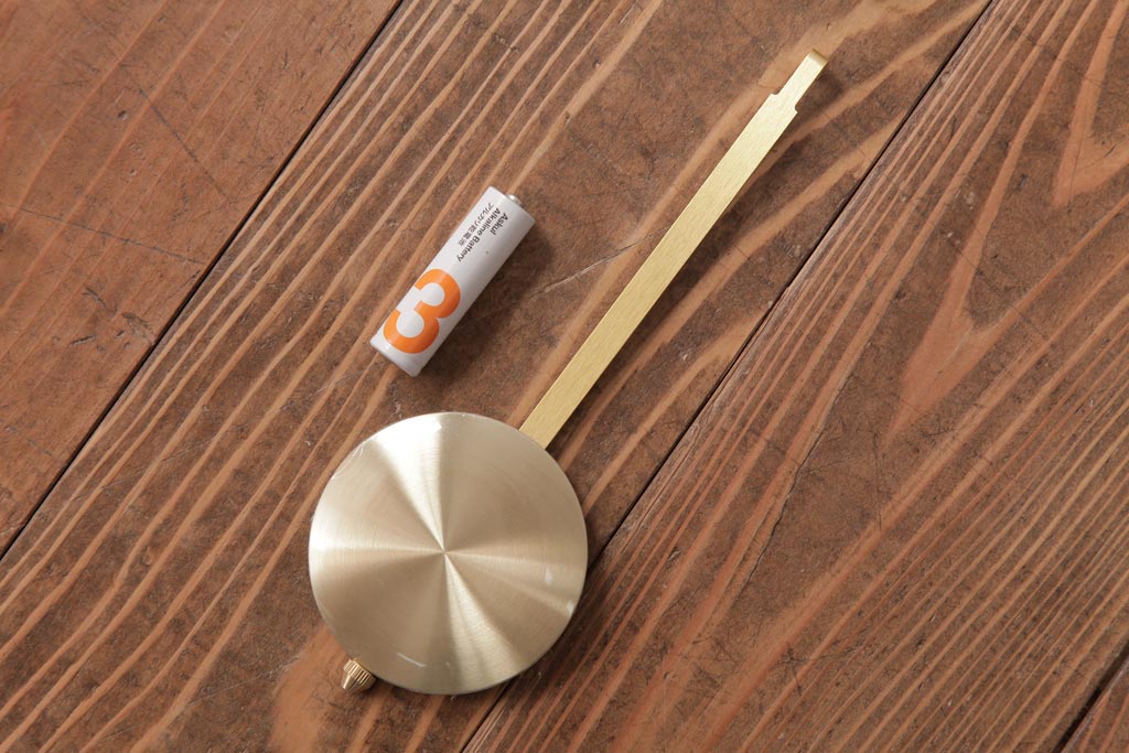 ムーブメントは新品の電池式に交換してあります。単三の乾電池が1本付属します。振り子は飾りで、動きますが針と連動はしていません。