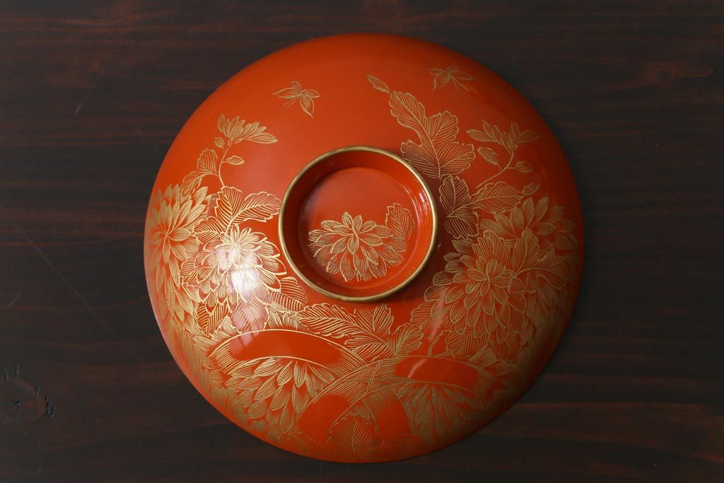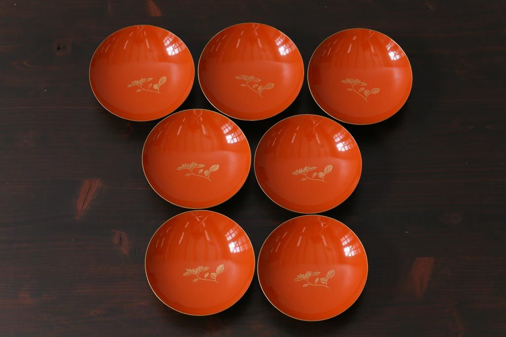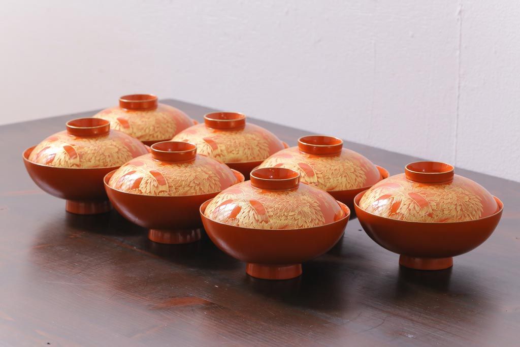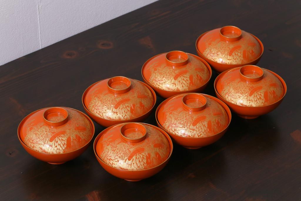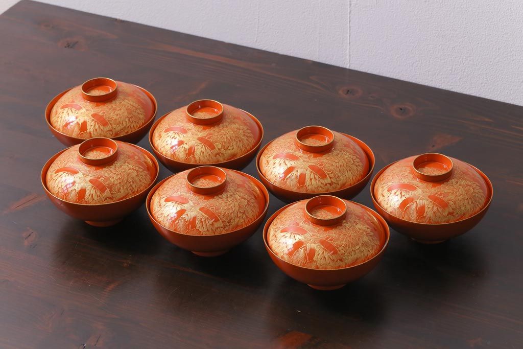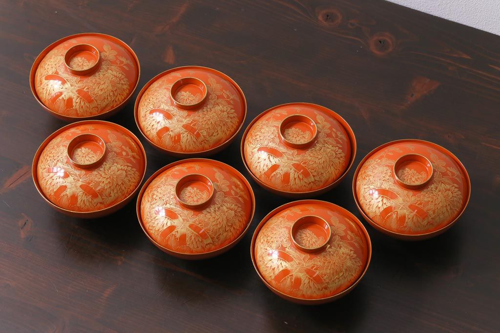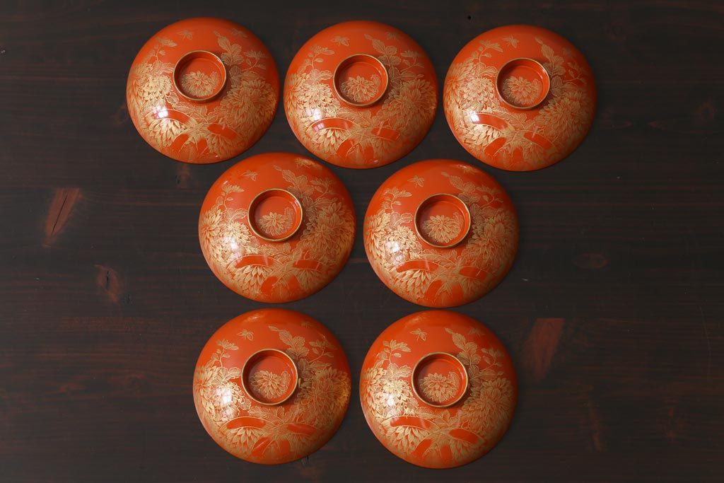 ラフジュ工房> 和食器・茶道具> お椀・茶碗 > 和製アンティーク 仙才型 沈金 蝶と菊 木製 蓋付きお椀7個セット(漆器)