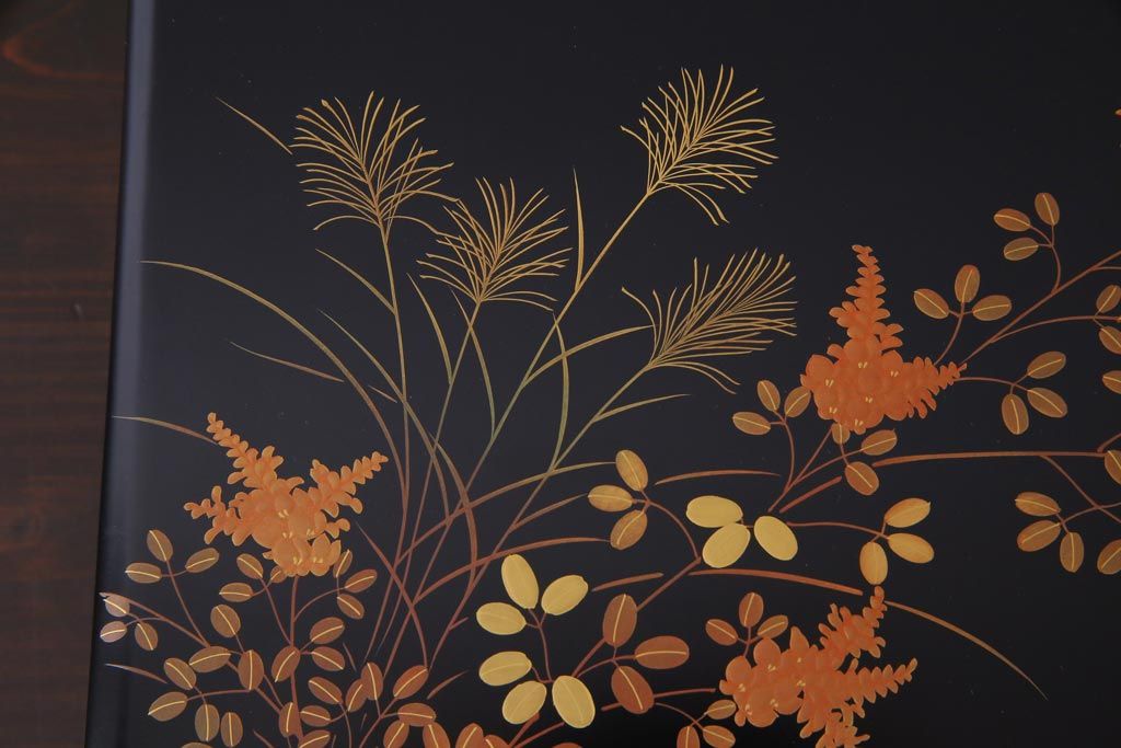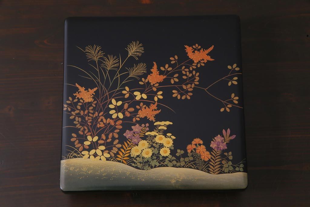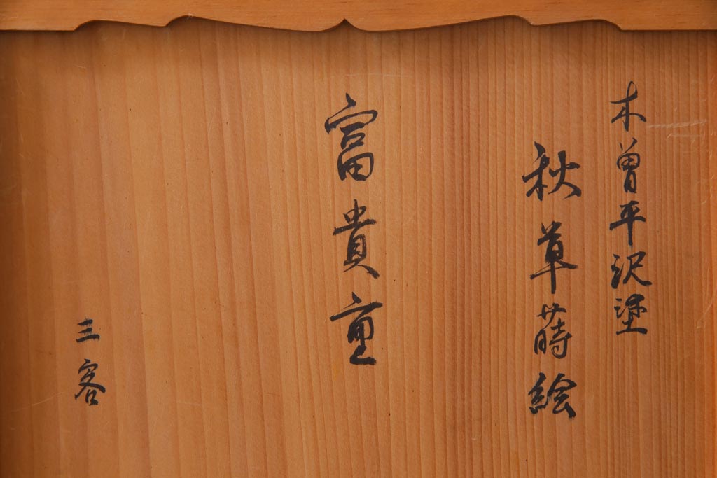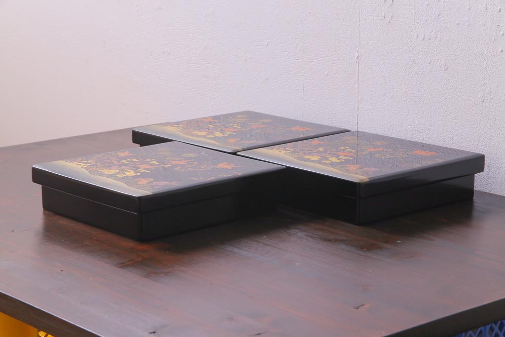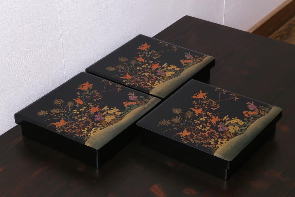 昭和中期 箱付き 木曽平沢塗 木製 秋の七草 秋草蒔絵の富貴重3組(重箱、漆器)(1)