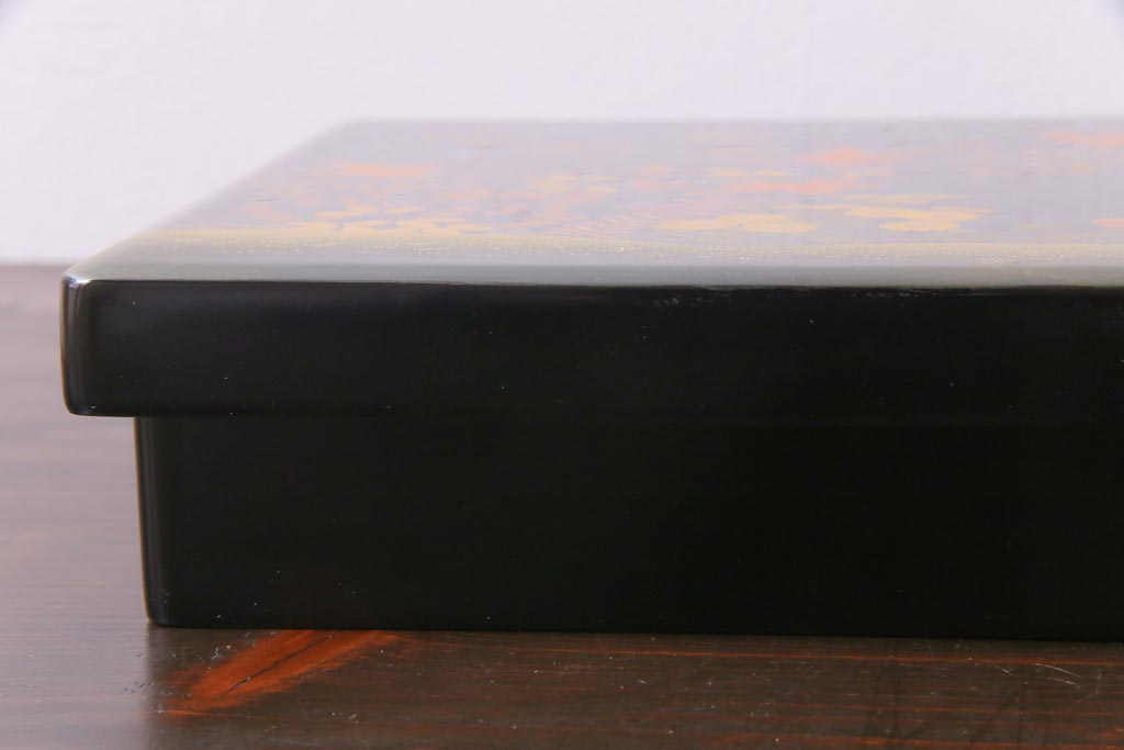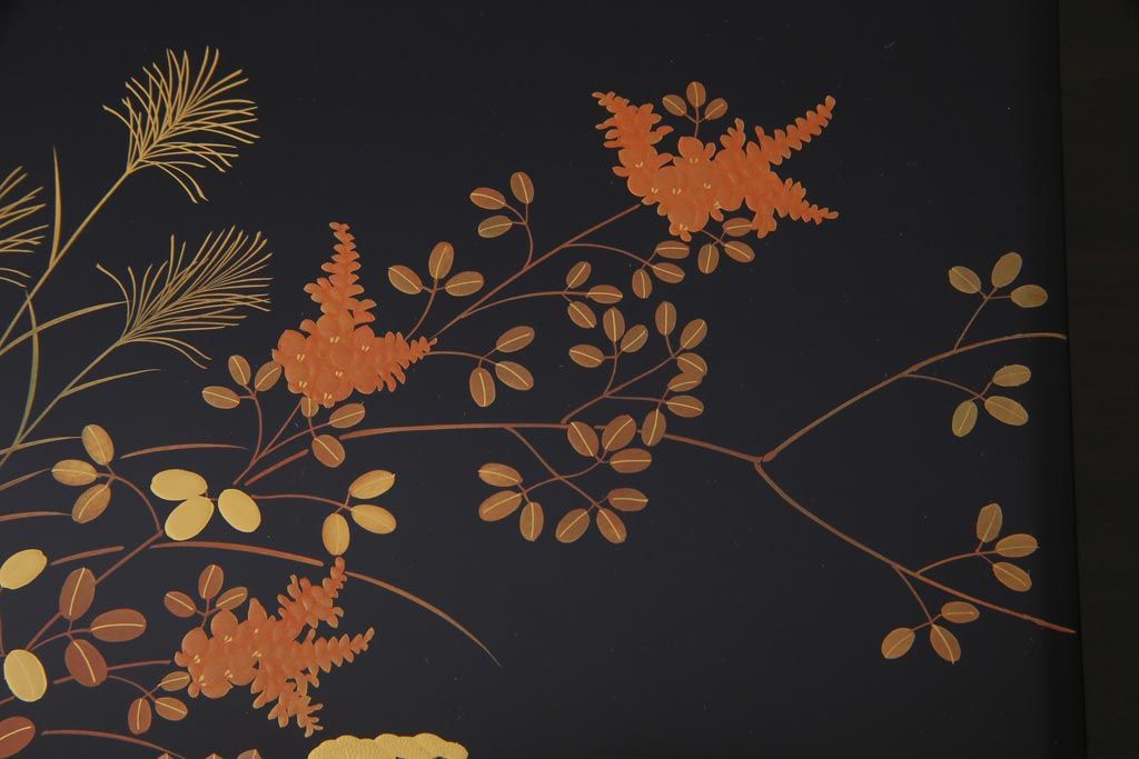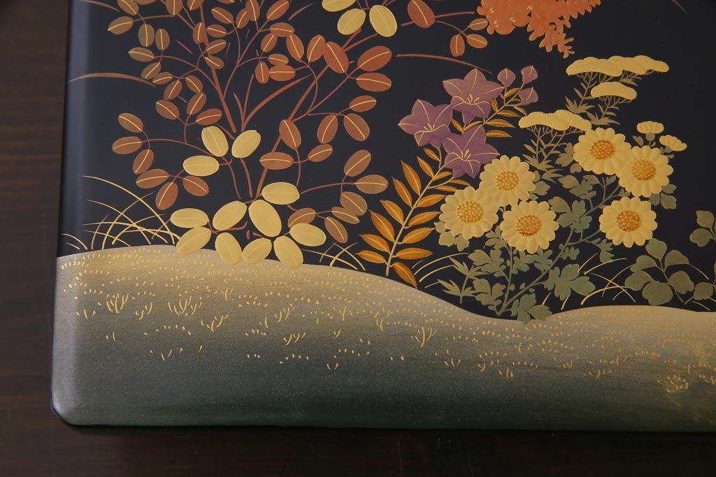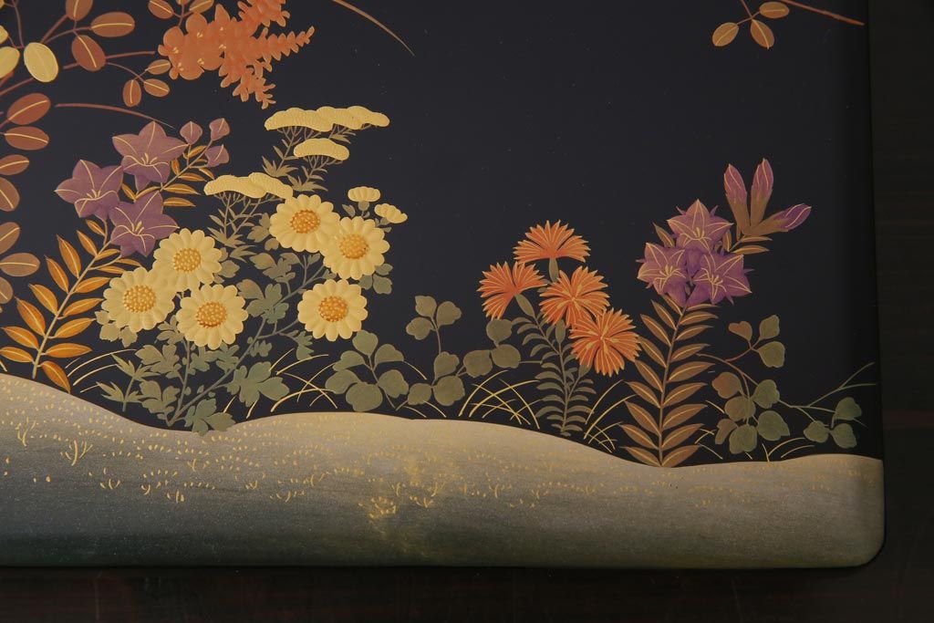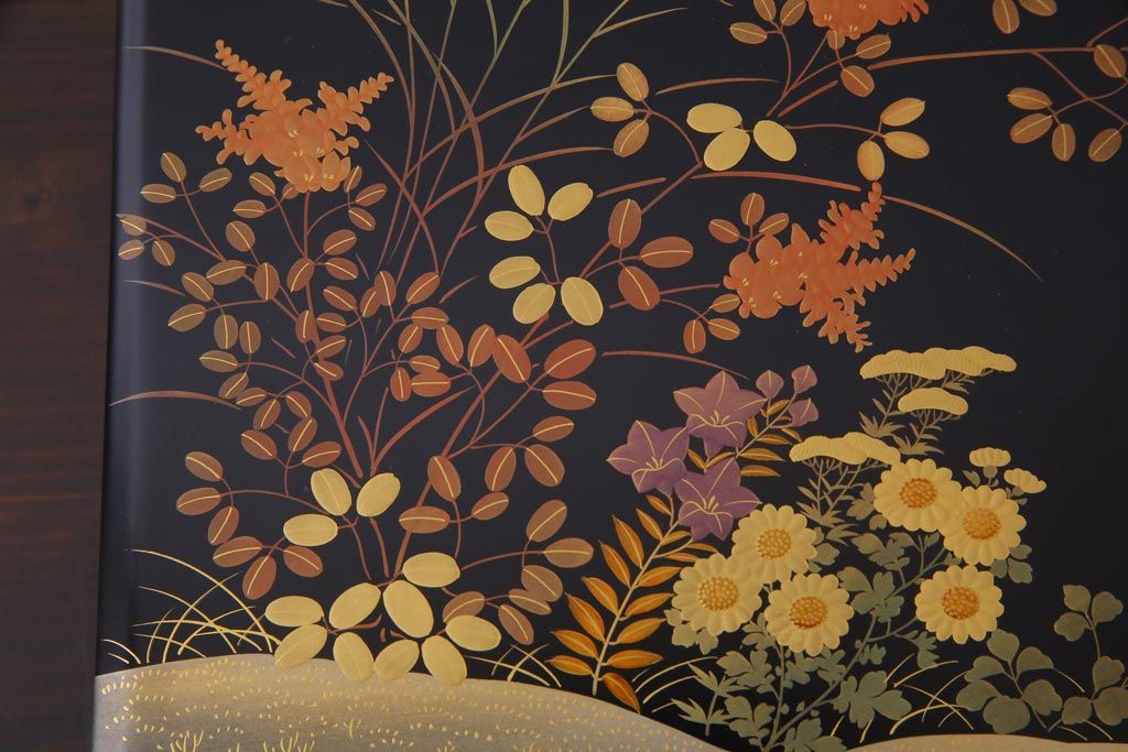 昭和中期 箱付き 木曽平沢塗 木製 秋の七草 秋草蒔絵の富貴重3組(重箱、漆器)(1)