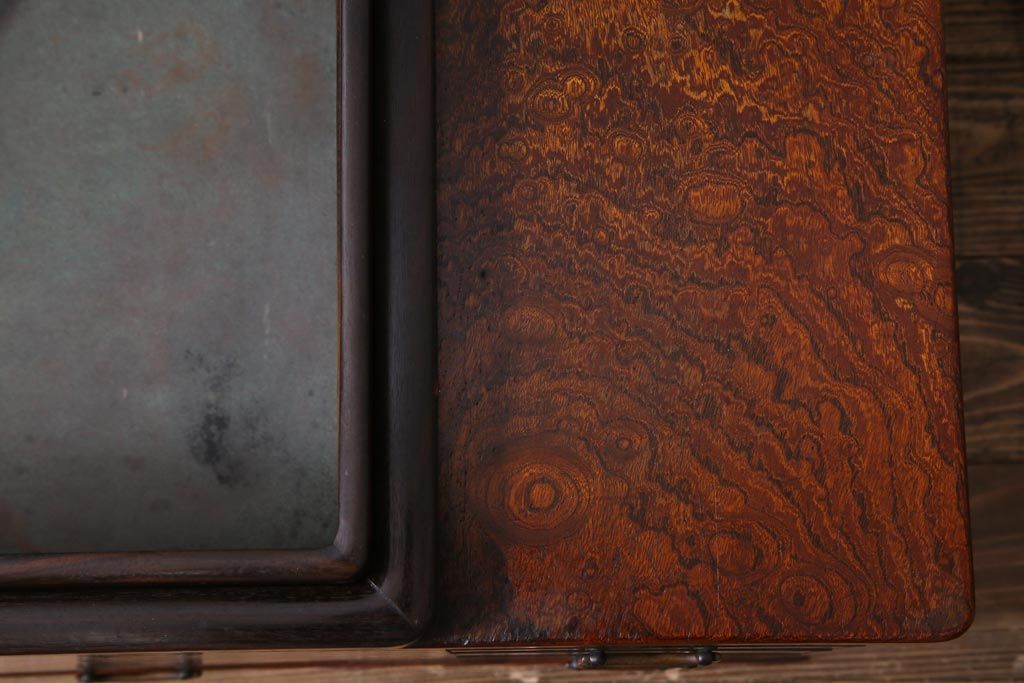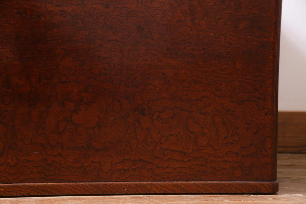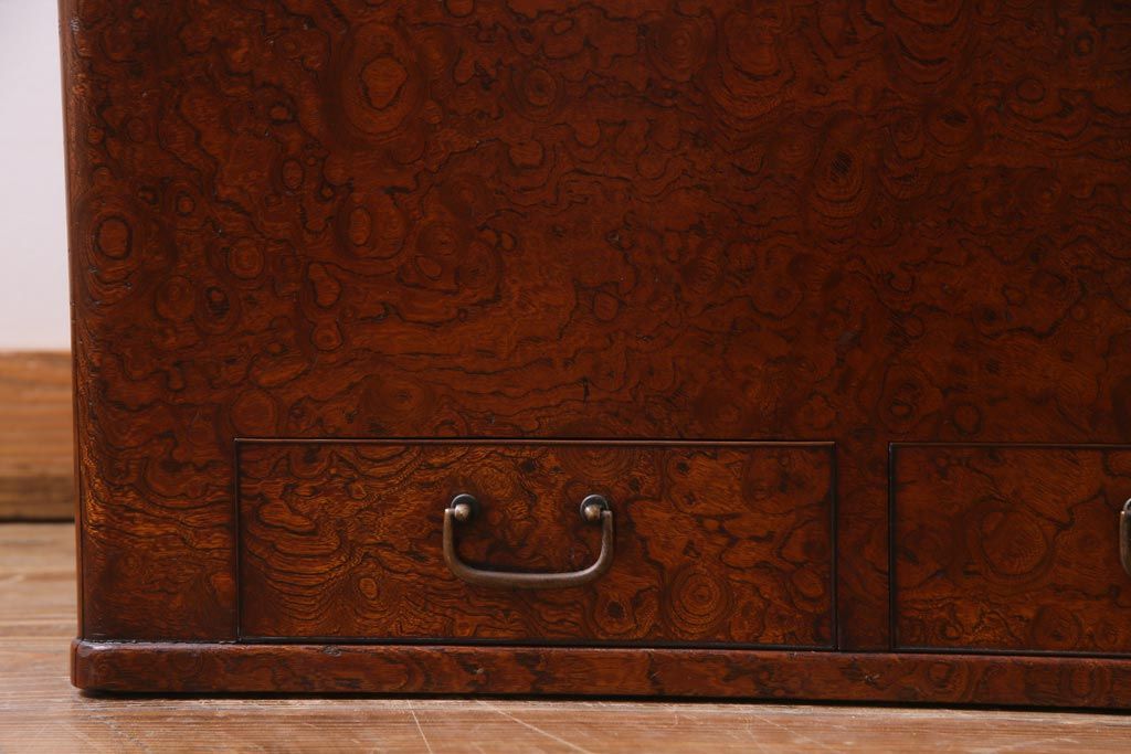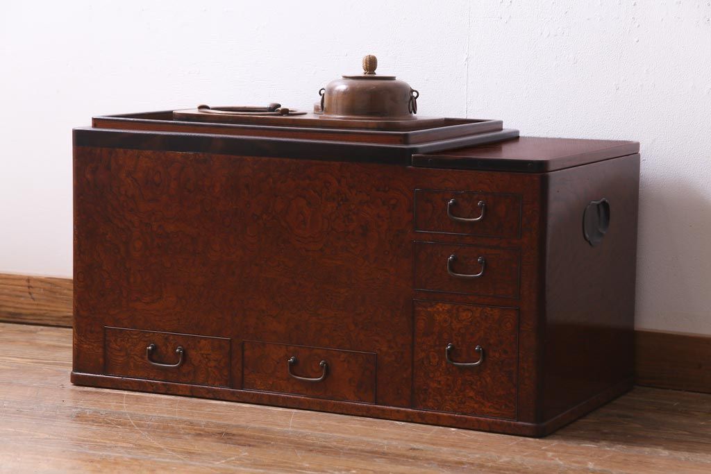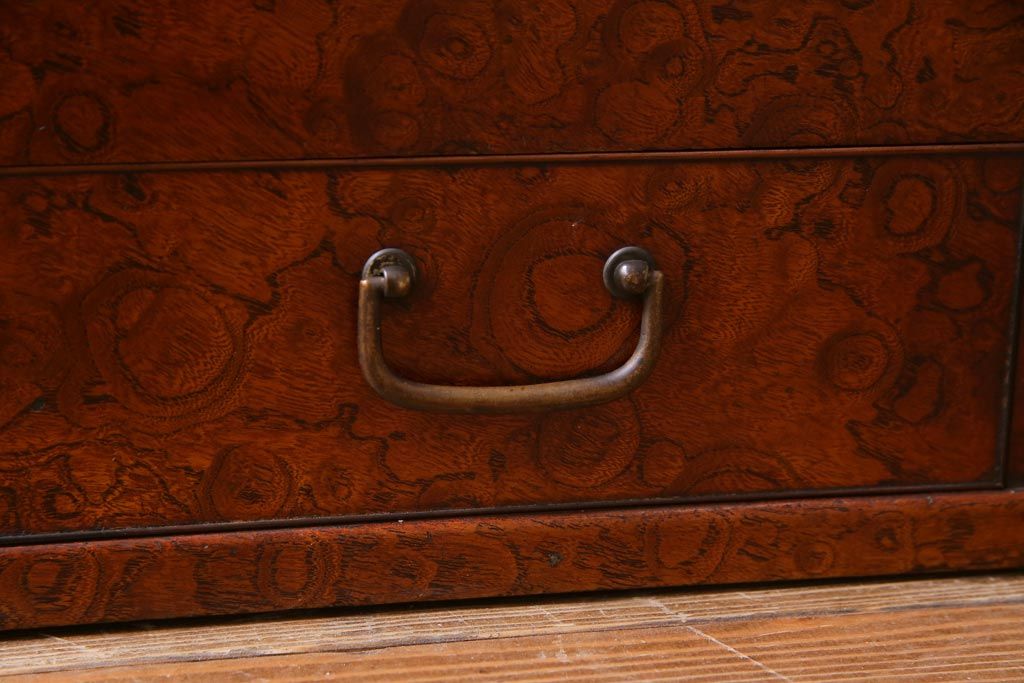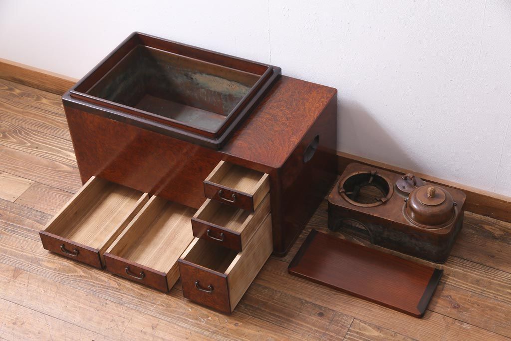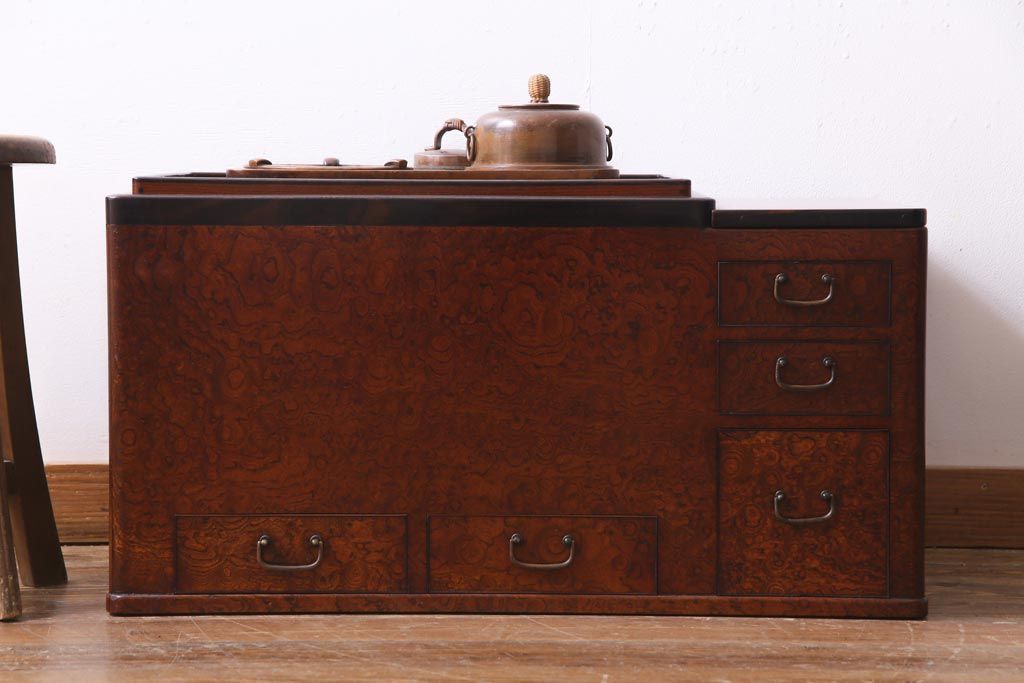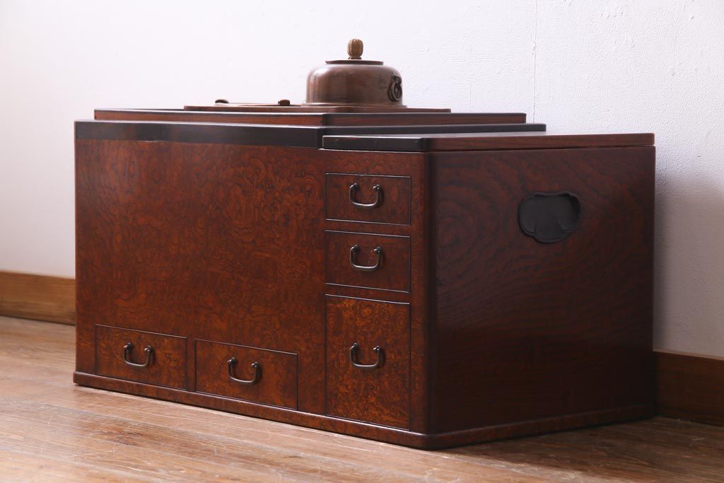 火鉢> 長火鉢 > アンティーク雑貨 和製アンティーク 銅壺付き! ケヤキ玉杢材 漆塗り 存在感のある長火鉢(木製火鉢)