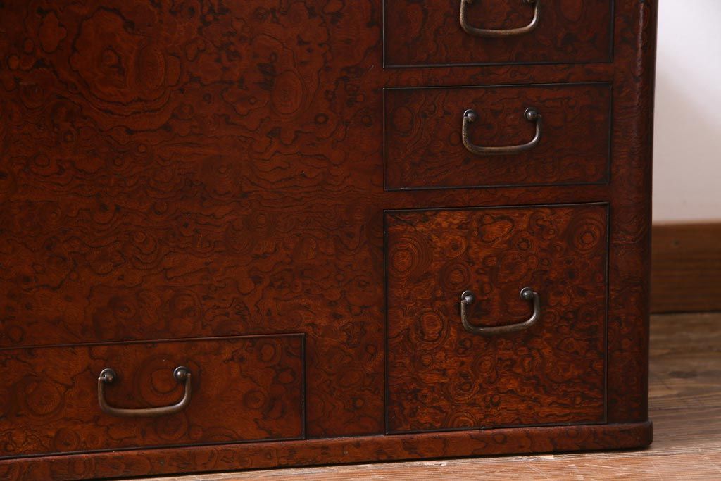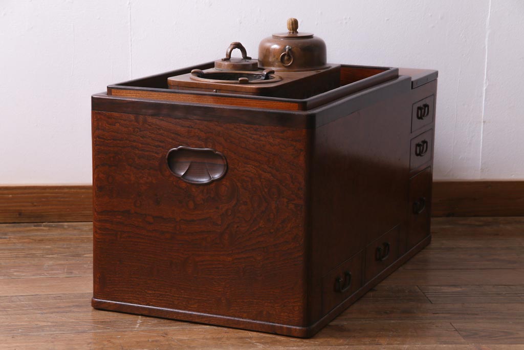和製アンティーク 銅壺付き! ケヤキ玉杢材 漆塗り 存在感のある長火鉢(木製火鉢)です。