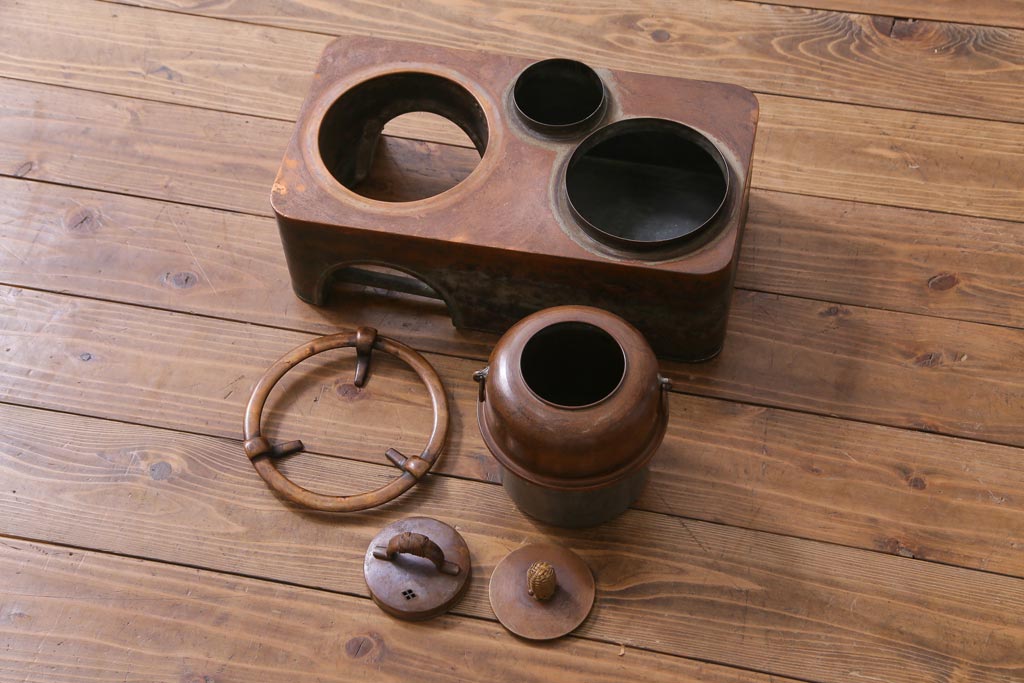 アンティーク雑貨 和製アンティーク 銅壺付き! ケヤキ玉杢材 漆塗り 存在感のある長火鉢(木製火鉢)