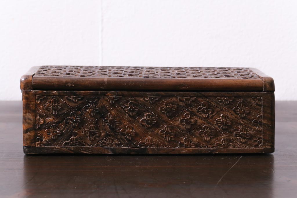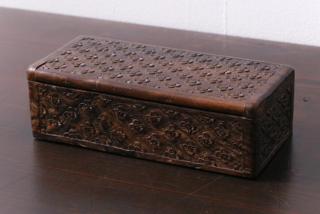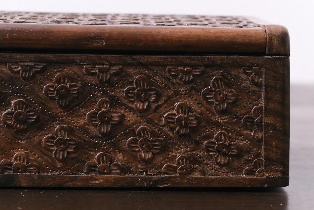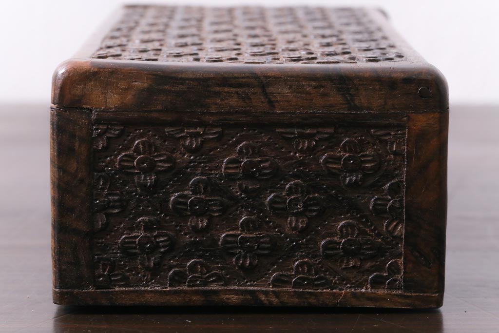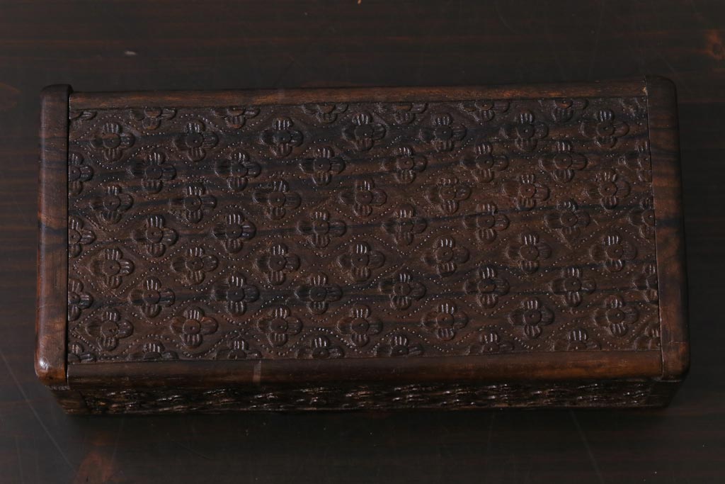 アンティーク雑貨 イギリスアンティーク 小花の彫刻が施された蓋付き木箱(小物入れ)