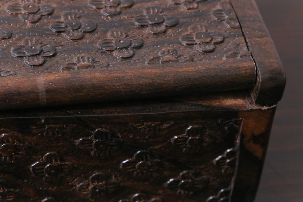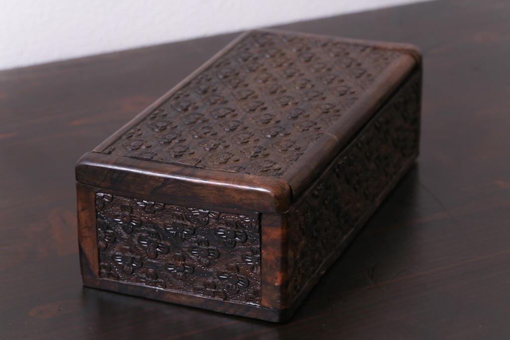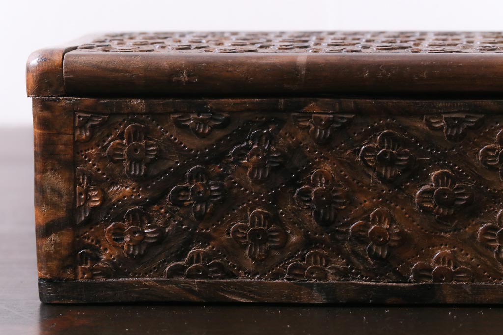 ラフジュ工房> 小物収納・トランク > アンティーク雑貨 イギリスアンティーク 小花の彫刻が施された蓋付き木箱(小物入れ)