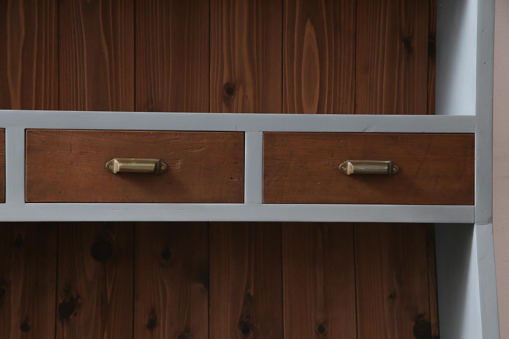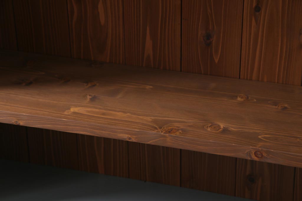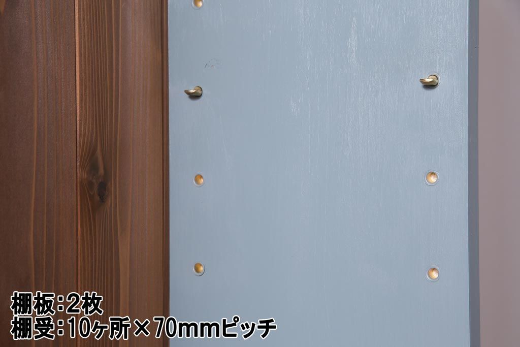 上段の棚板は取り外しできます。棚板は2枚あります。棚受けは10ヶ所、70mmピッチで調整できます。棚幅サイズのものが1枚の作りです。