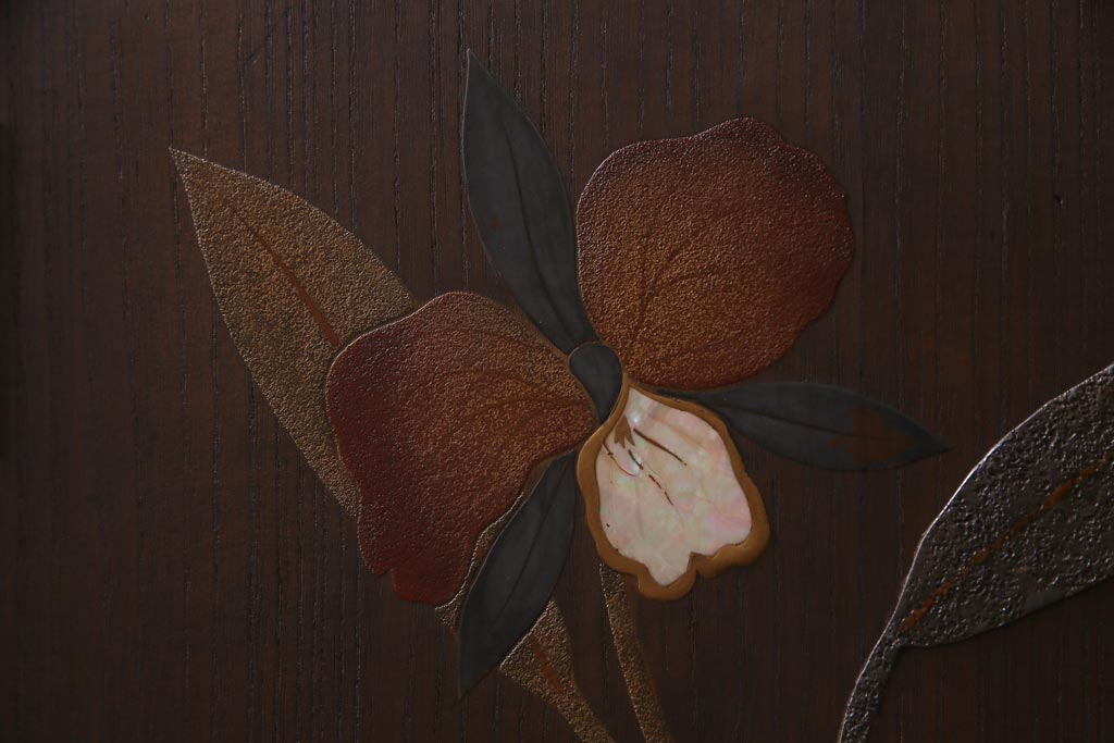 しっとりとした木肌に施された菖蒲の漆絵が