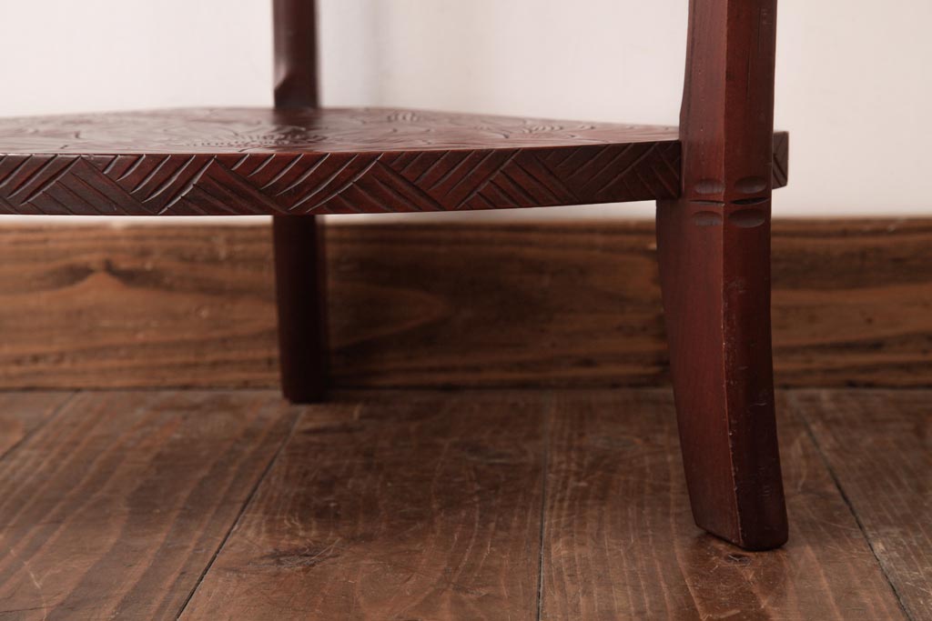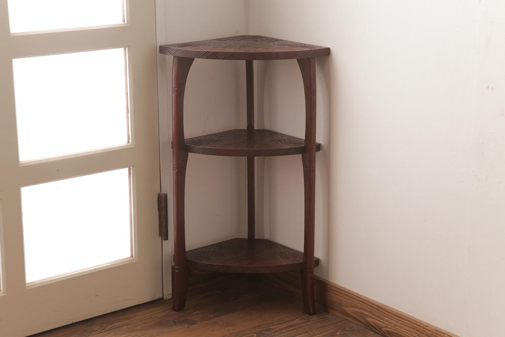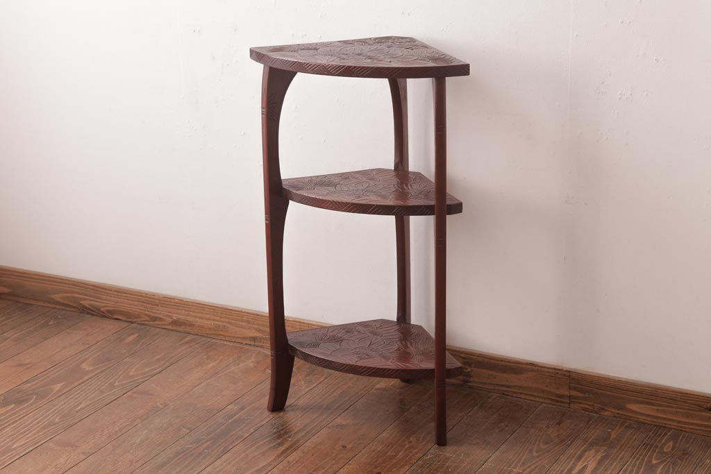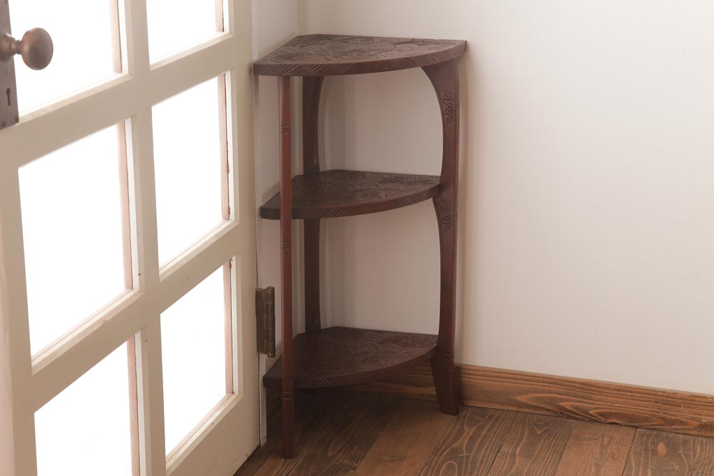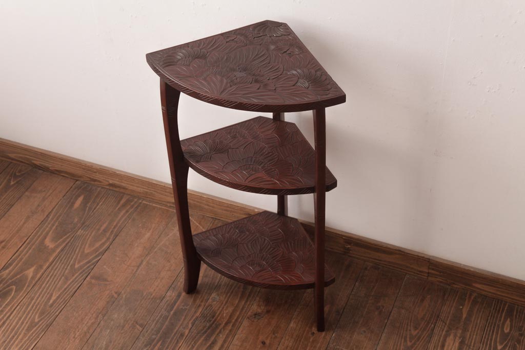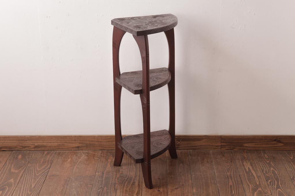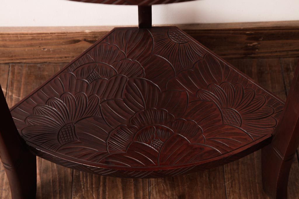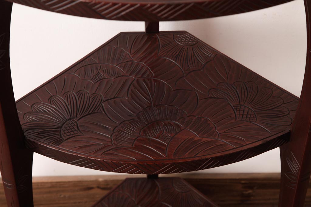 ラフジュ工房> 民芸家具 > 中古 伝統工芸 日光彫り ダイナミックな花の意匠が存在感のあるコーナーラック(飾り台、花台)