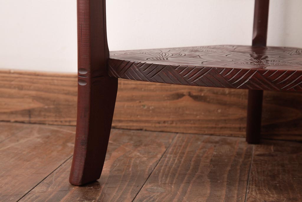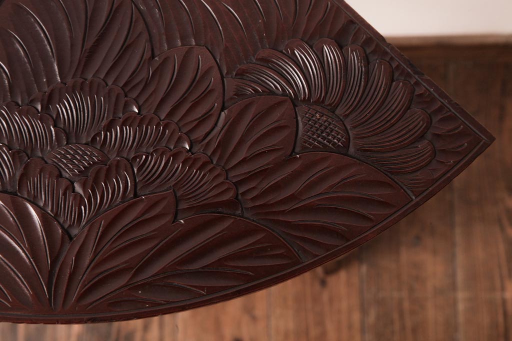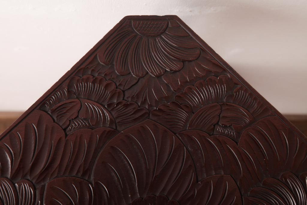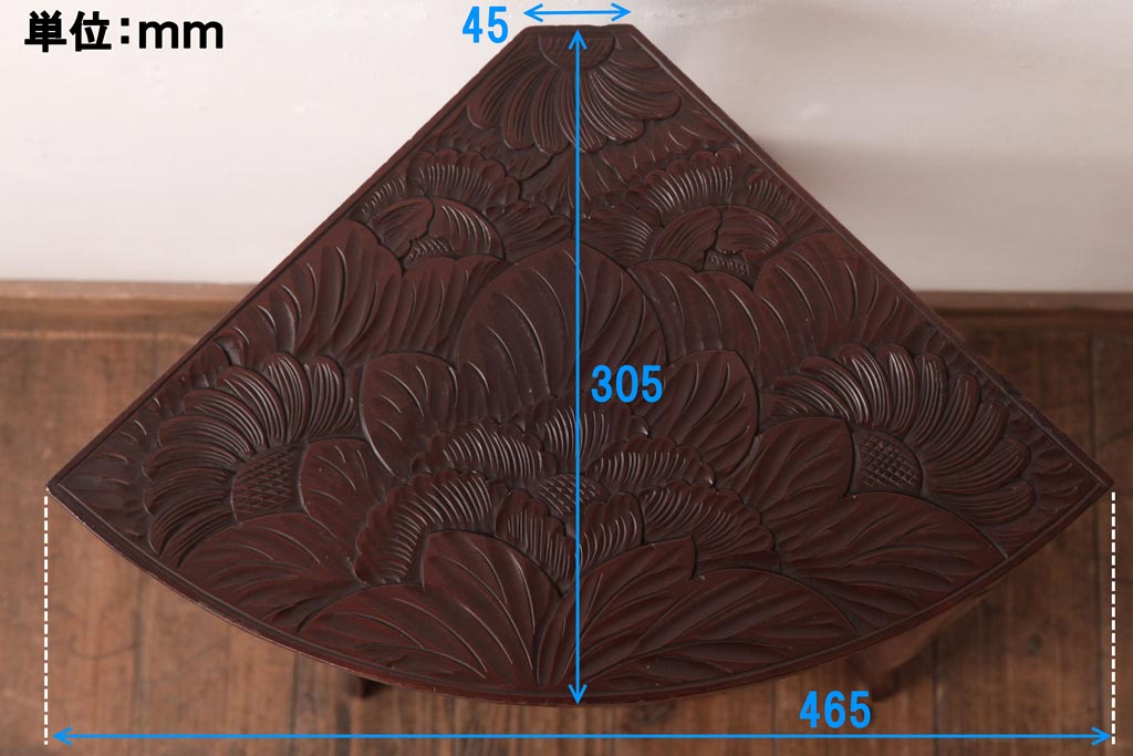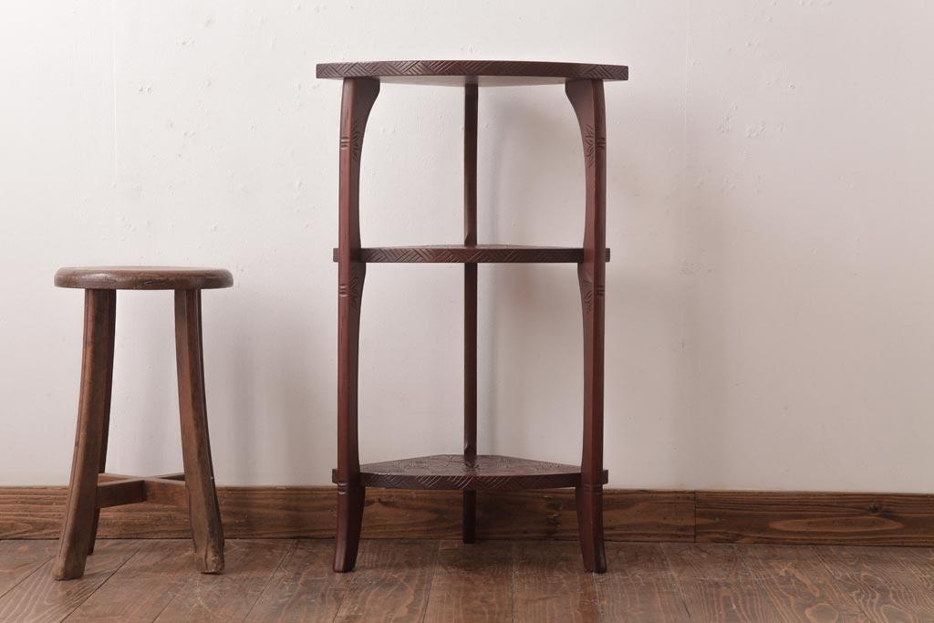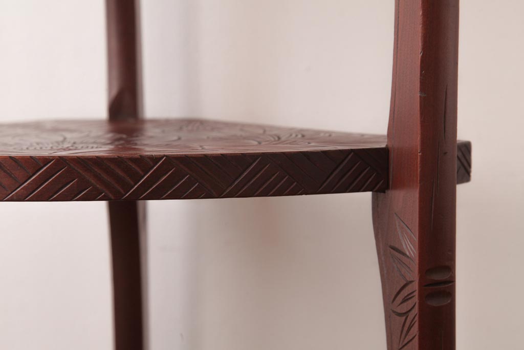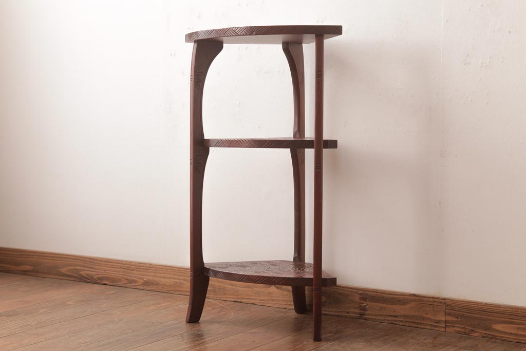 ラフジュ工房> 民芸家具 > 中古 伝統工芸 日光彫り ダイナミックな花の意匠が存在感のあるコーナーラック(飾り台、花台)