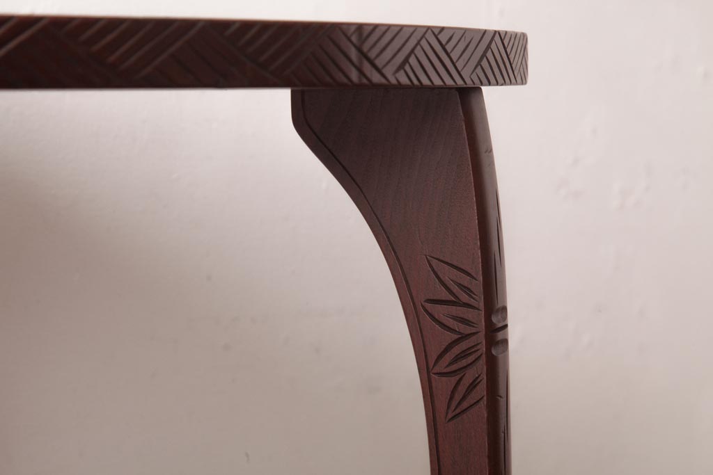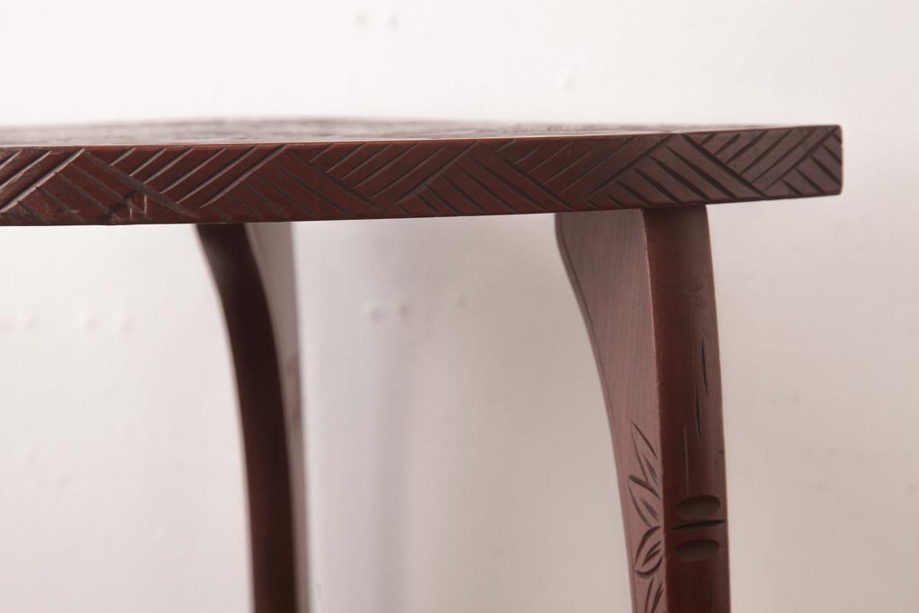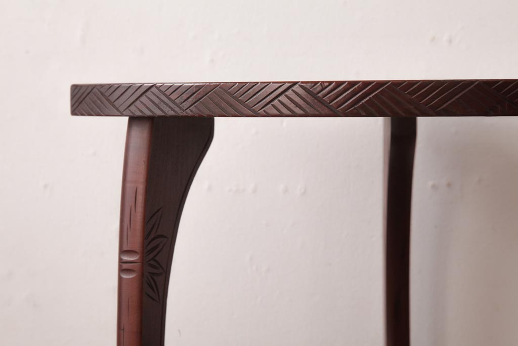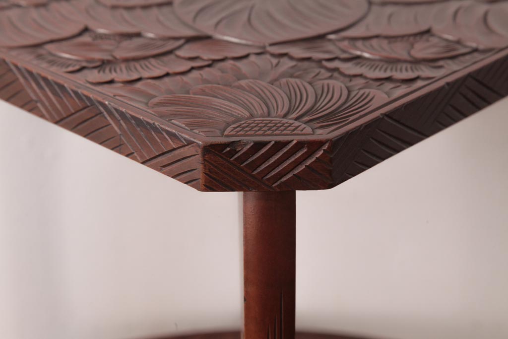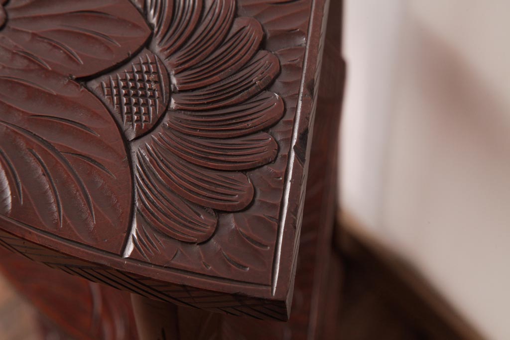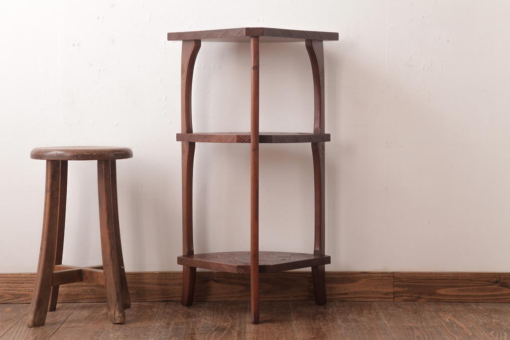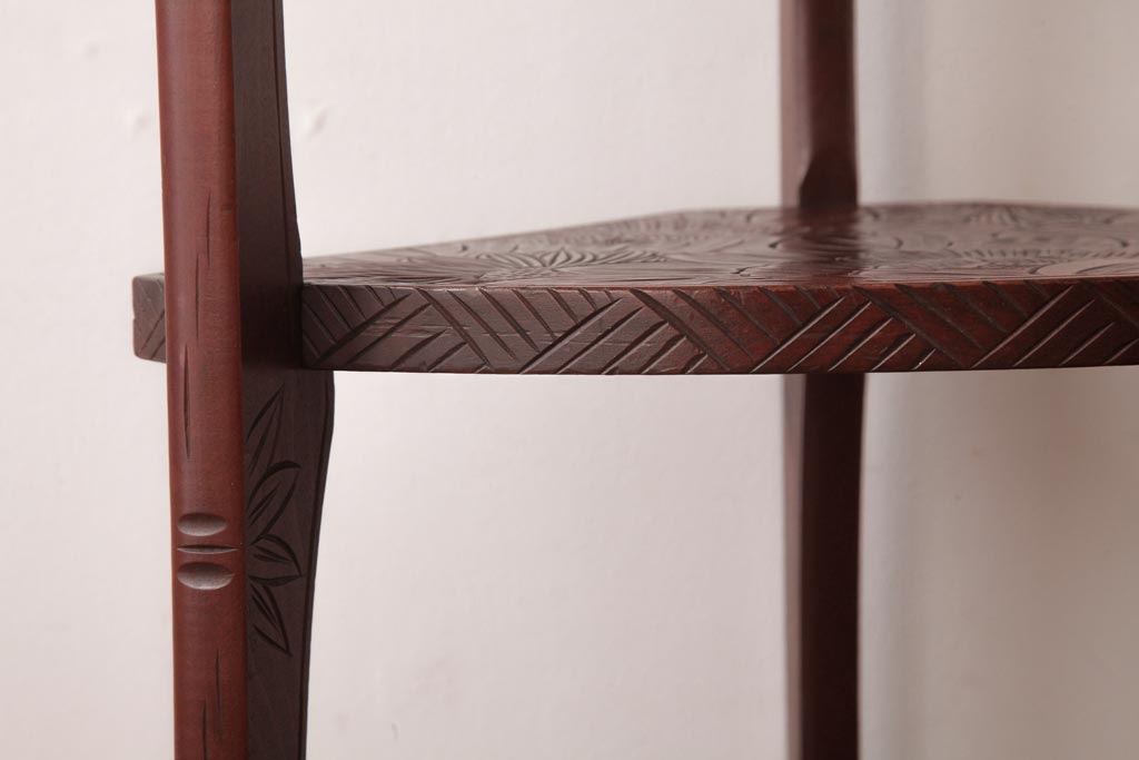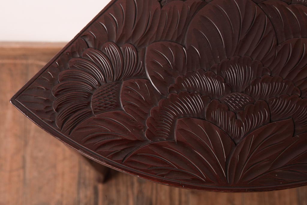 ラフジュ工房> 民芸家具 > 中古 伝統工芸 日光彫り ダイナミックな花の意匠が存在感のあるコーナーラック(飾り台、花台)