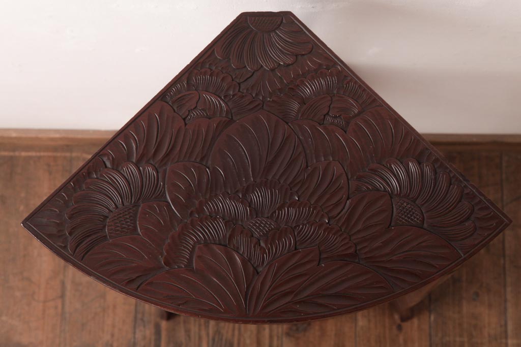 ラフジュ工房> オープンラック・シェルフ> コーナーラック > 中古 伝統工芸 日光彫り ダイナミックな花の意匠が存在感のあるコーナーラック(飾り台、花台)