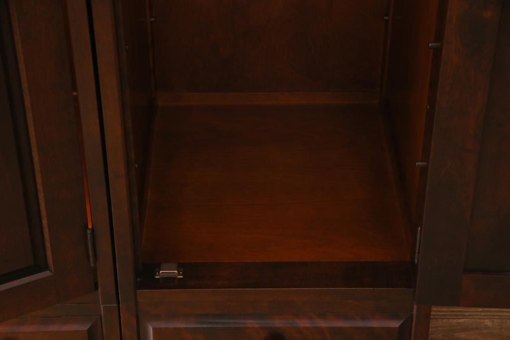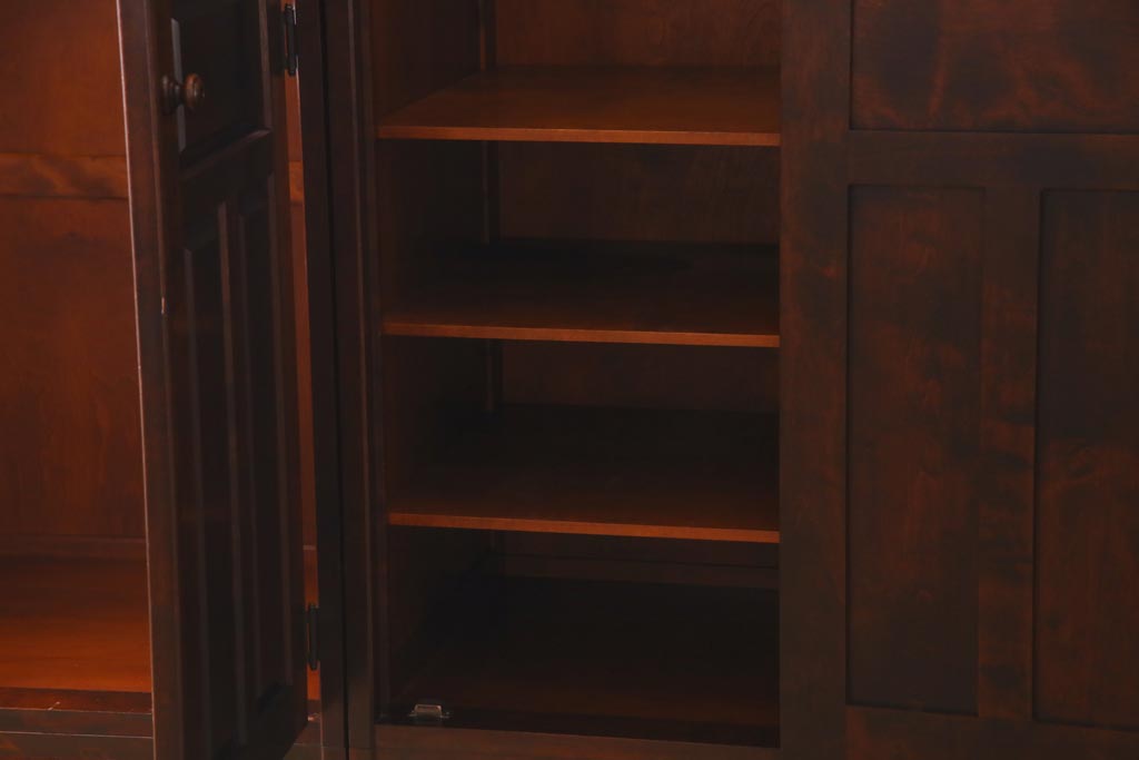 棚板は取り外しできます。棚板は上段に左右各1枚ずつ、中段右側に3枚あります。中段右側のみ棚受けは11ヶ所、100mmピッチで調整できます。棚幅サイズのものが1枚の作りです。