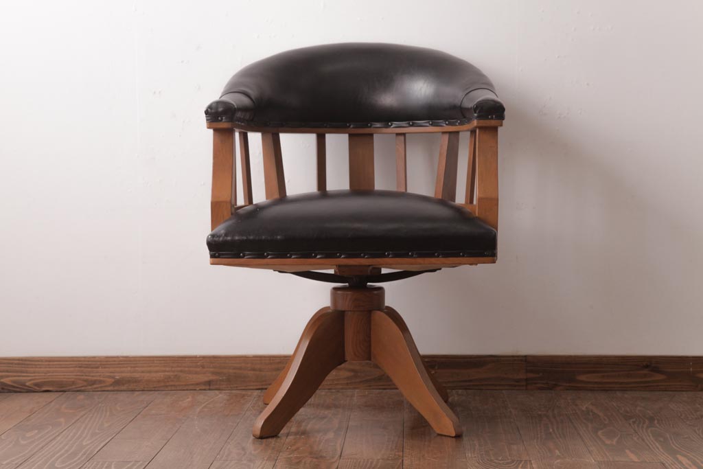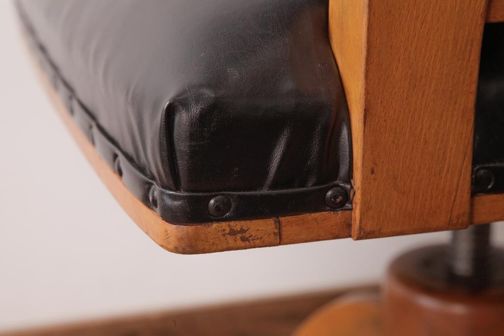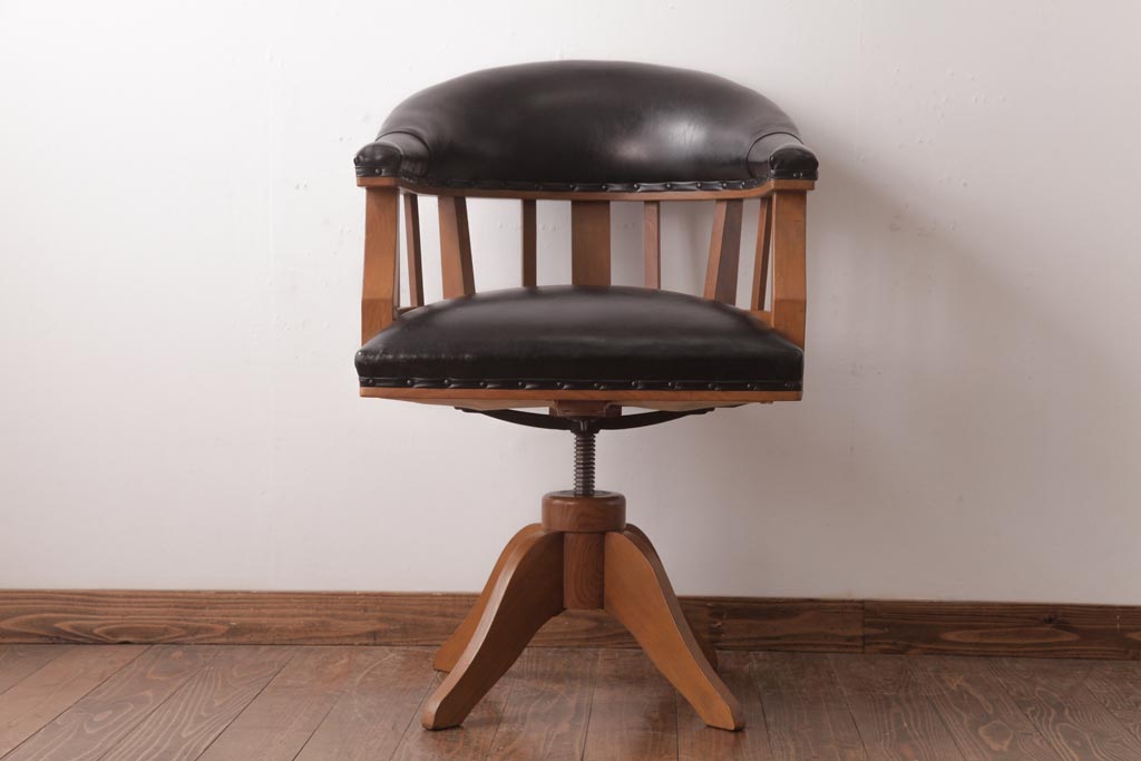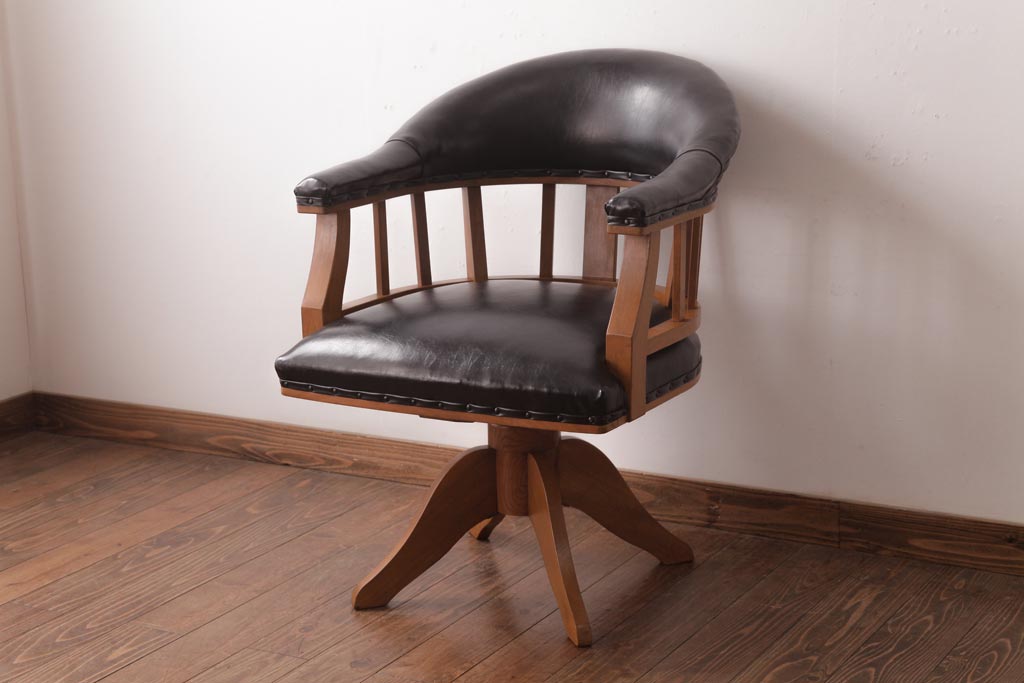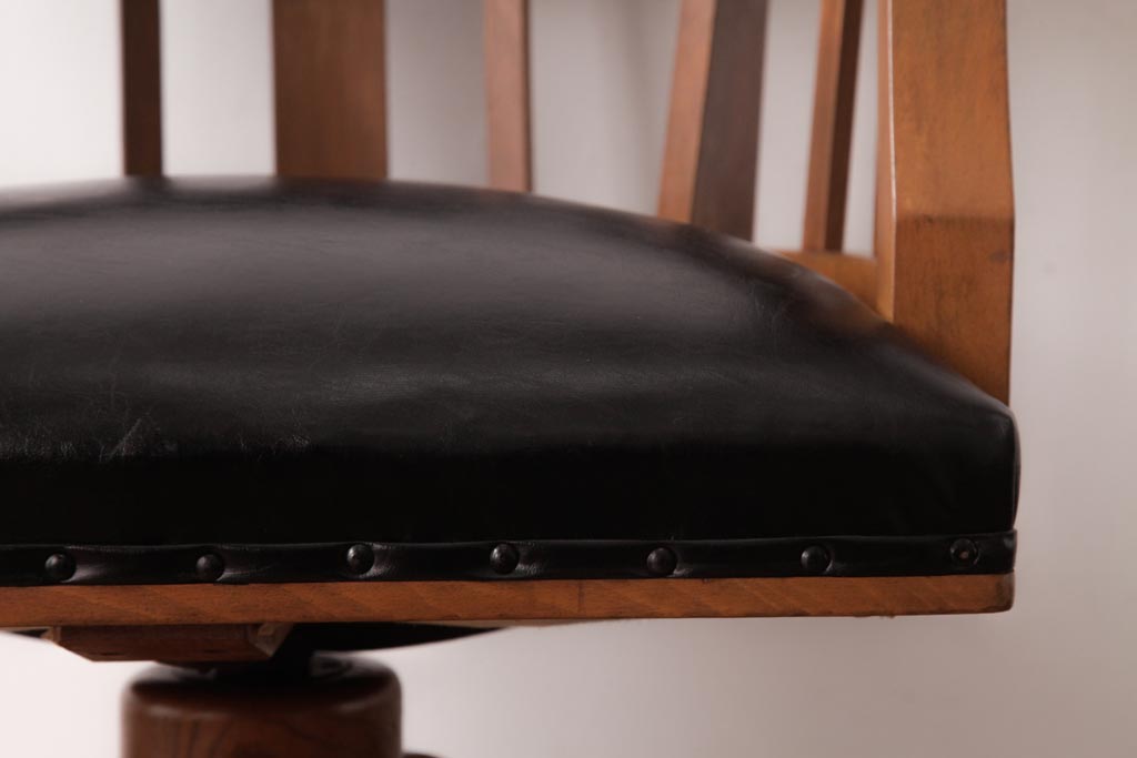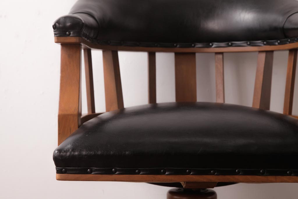 アンティーク家具 ナラ材 黒いレザーと木色のコントラストがお洒落なドクターチェア(回転椅子、アームチェア)