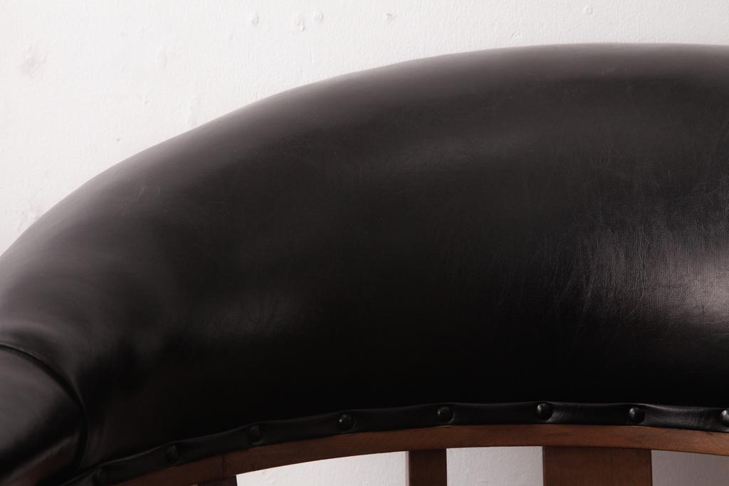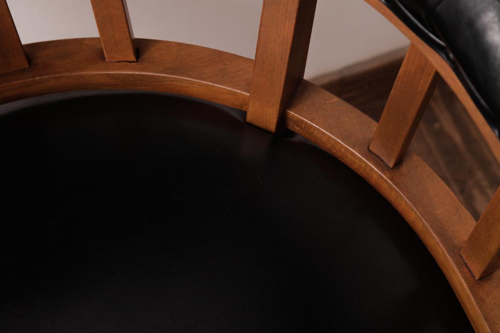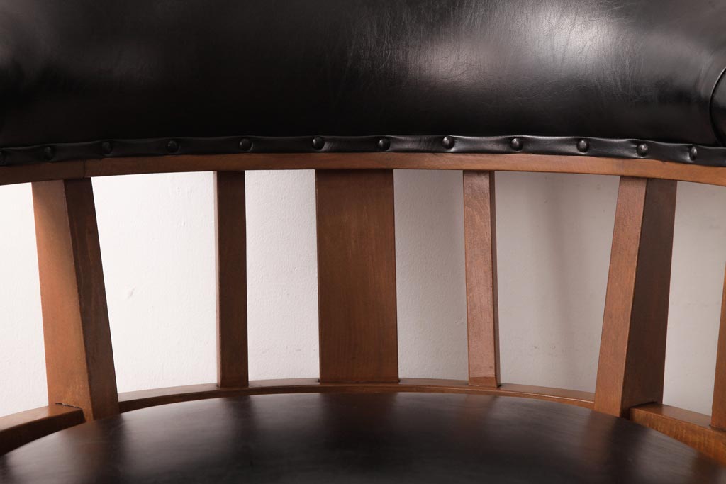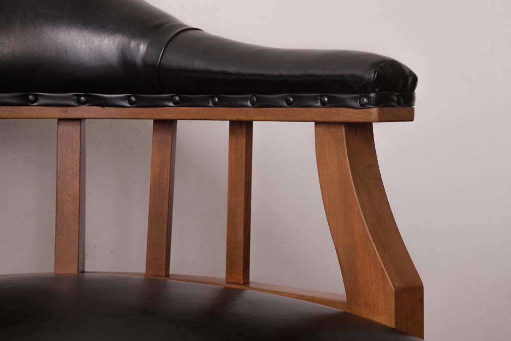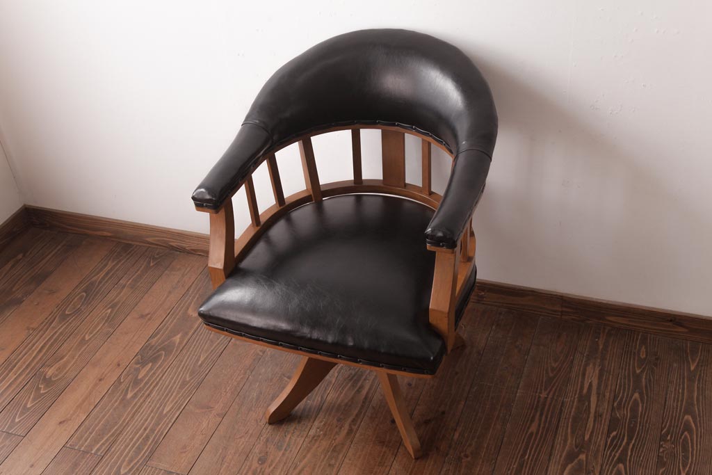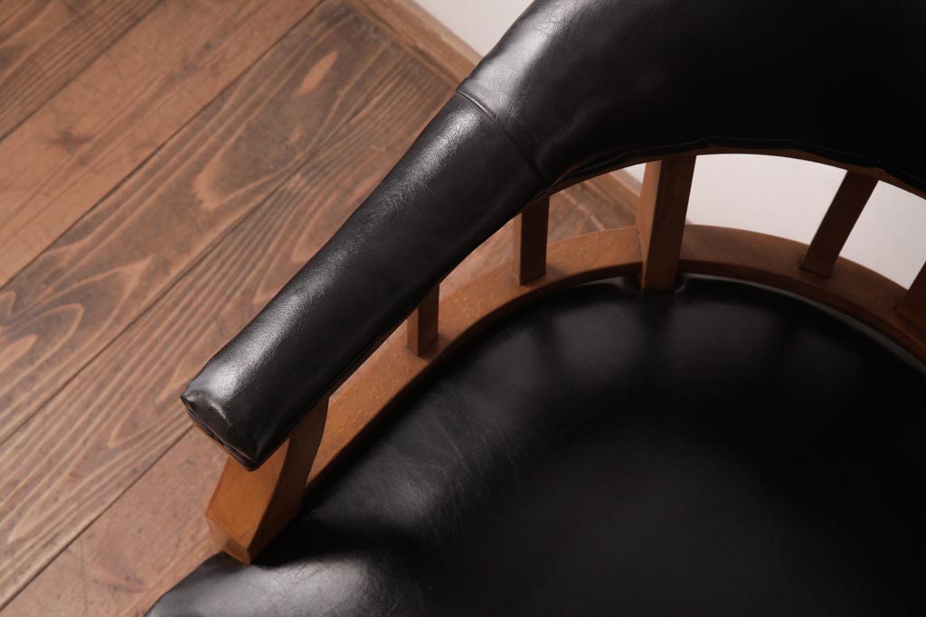 アンティーク家具 ナラ材 黒いレザーと木色のコントラストがお洒落なドクターチェア(回転椅子、アームチェア)です。