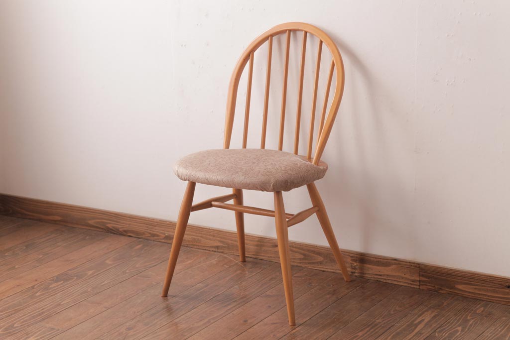 ヴィンテージ家具 イギリスビンテージ ERCOL(アーコール) フープバック 布張り座面のウィンザーチェア(ダイニングチェア、ワークチェア、椅子)(1)です。