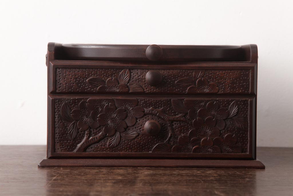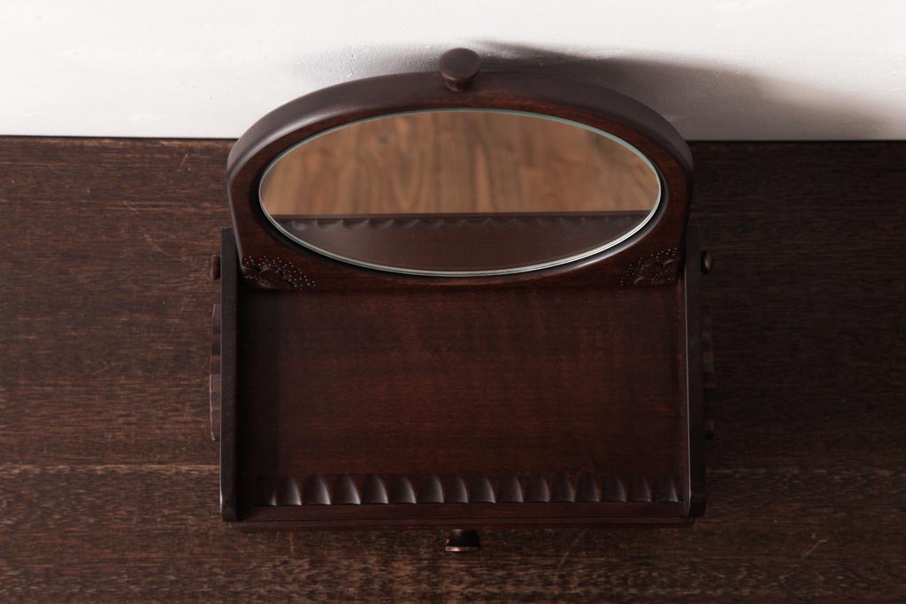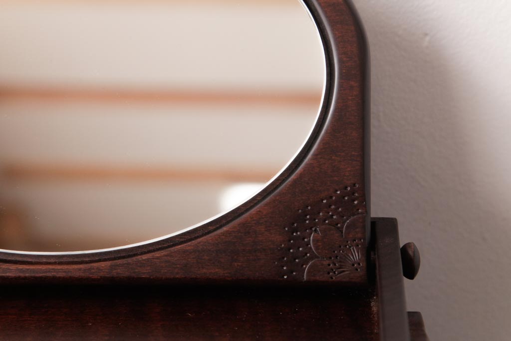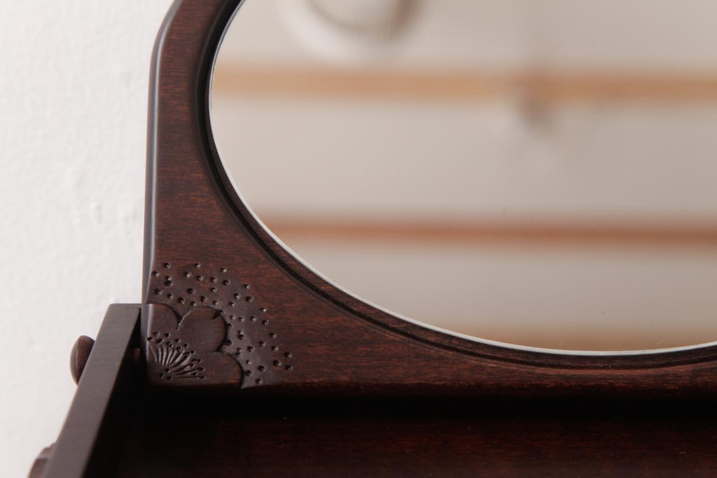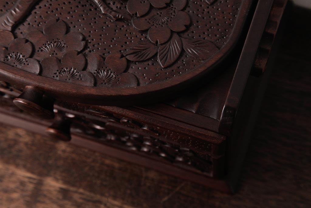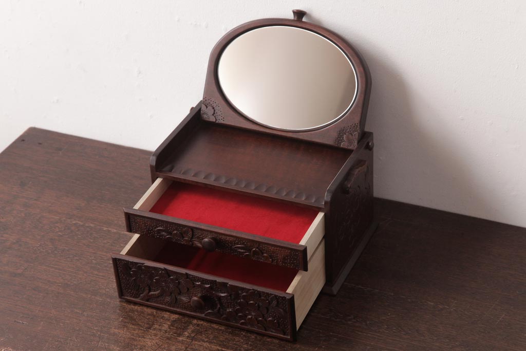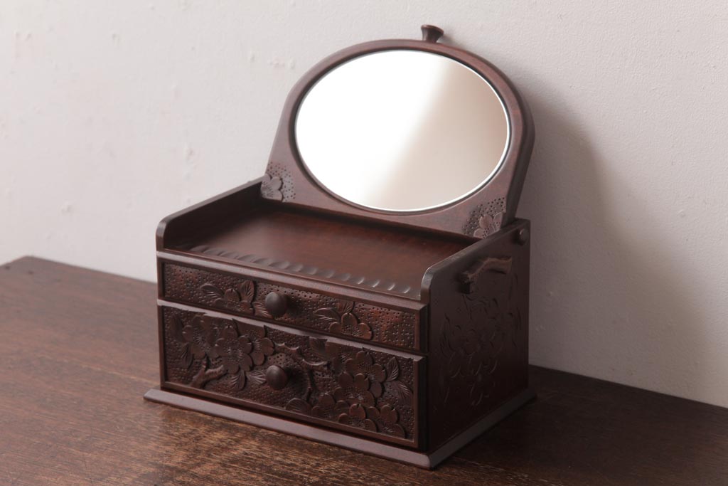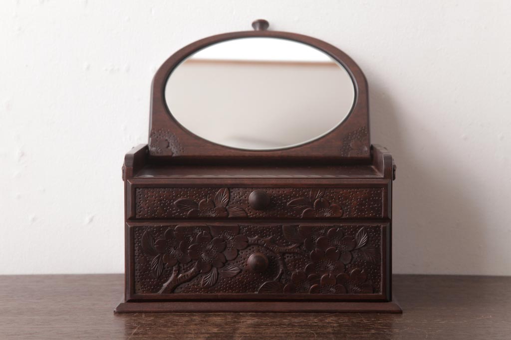 中古 軽井沢彫り 大阪屋家具店 桜の彫刻が美しい姫鏡台(卓上ドレッサー、メイクボックス)