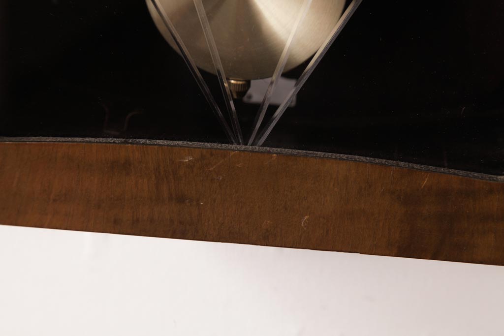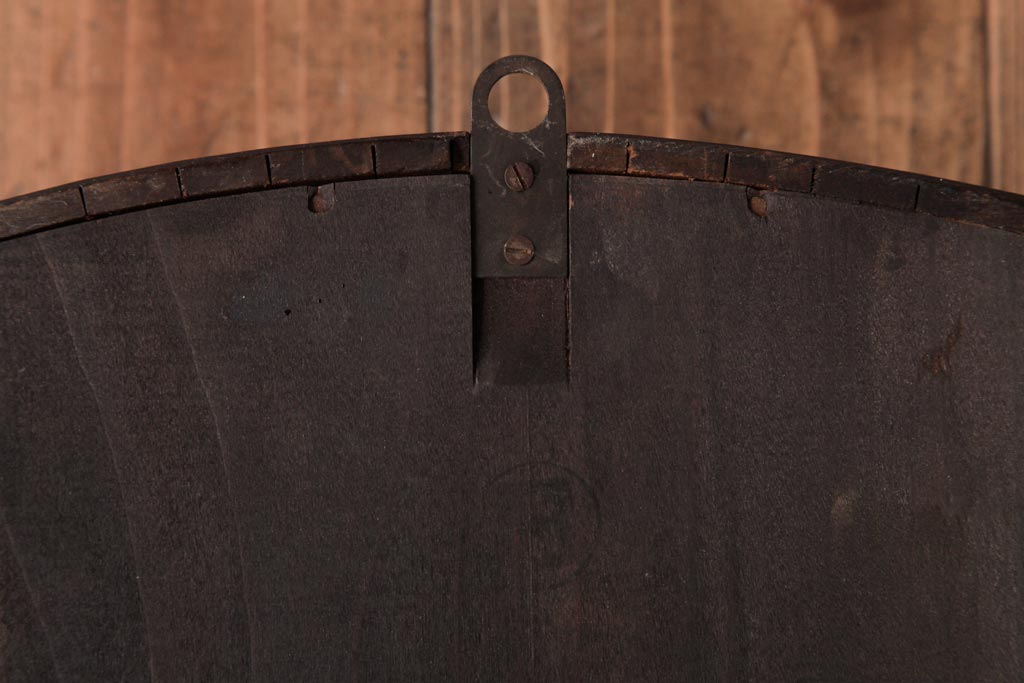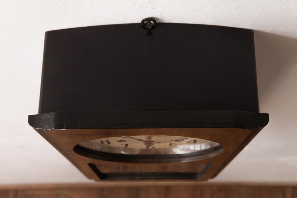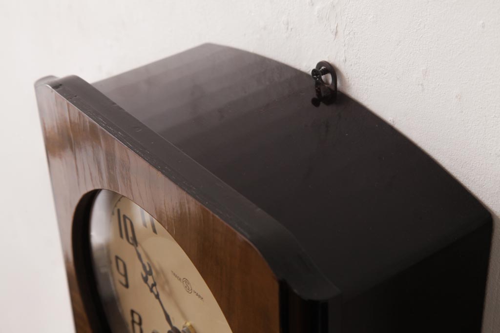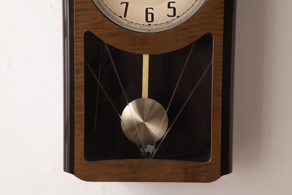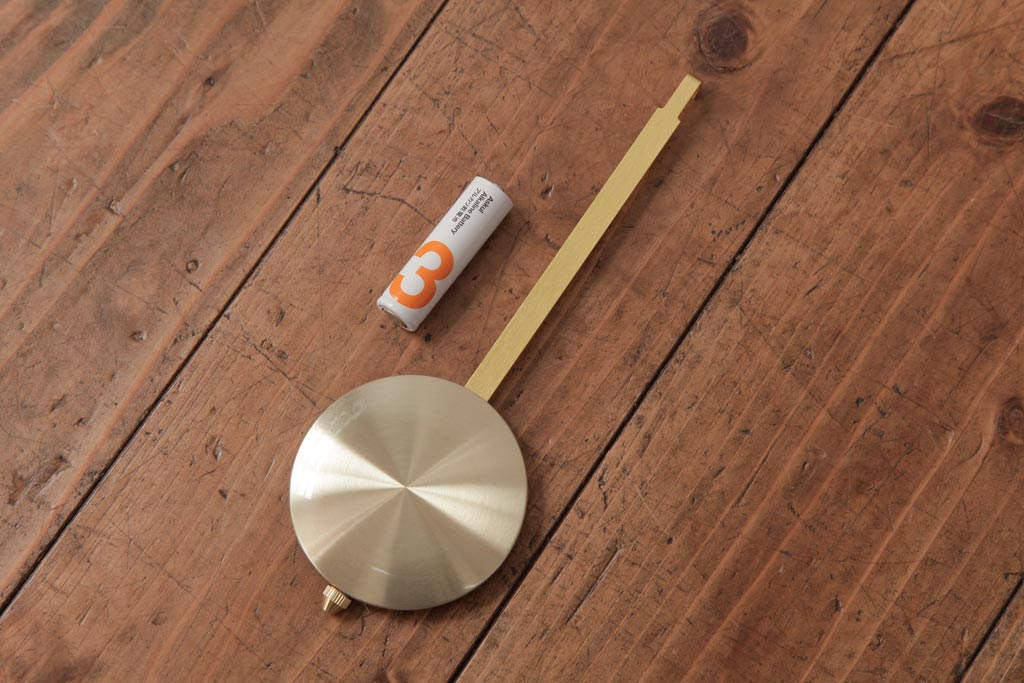 ムーブメントは新品の電池式に交換してあります。乾電池が付属します。振り子は飾りで、動きますが針と連動はしていません。