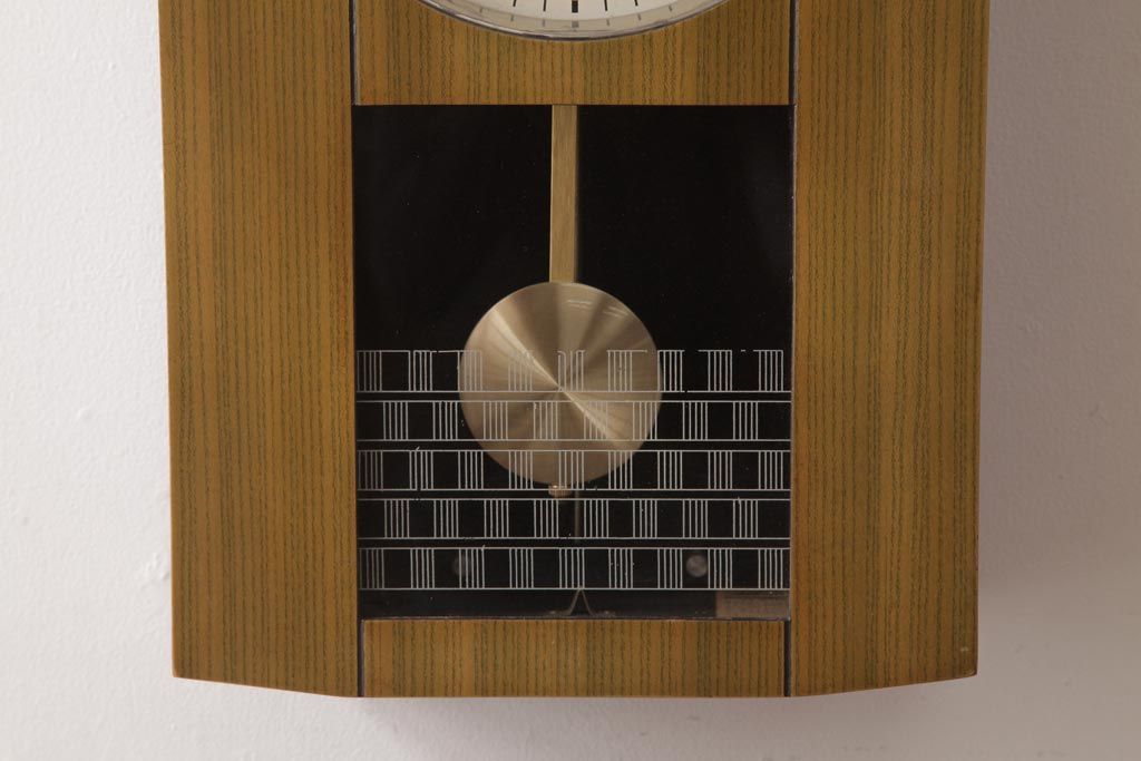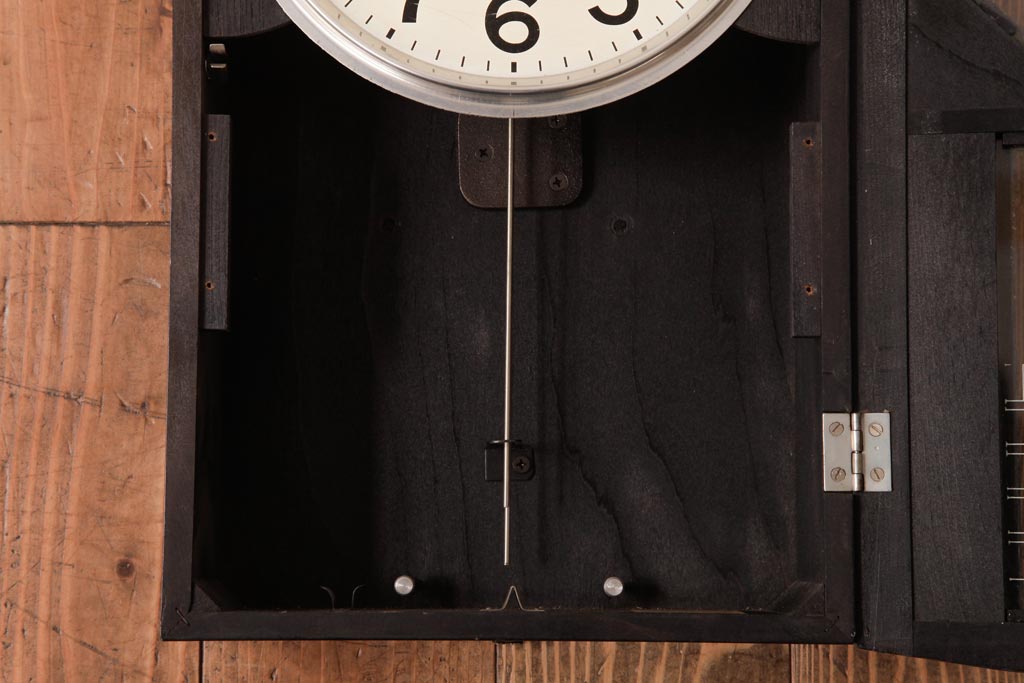 ムーブメントは新品の電池式に交換してあります。乾電池が付属します。振り子は飾りで、動きますが針と連動はしていません。