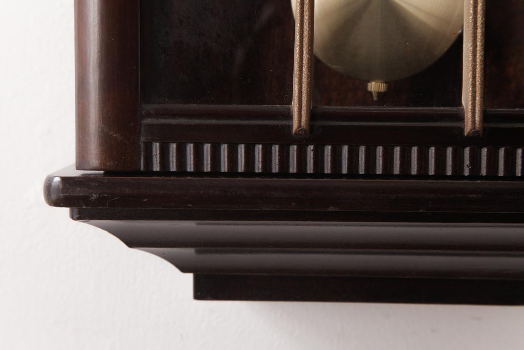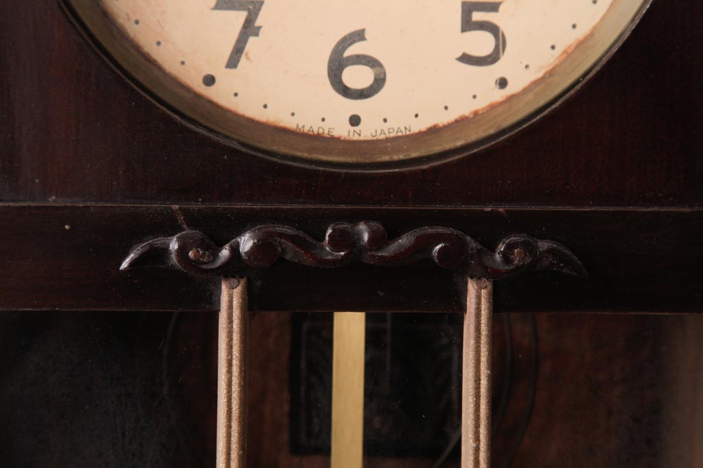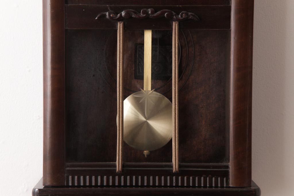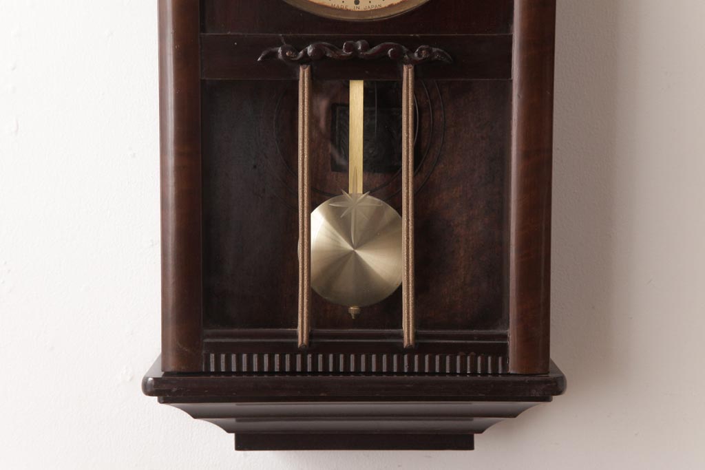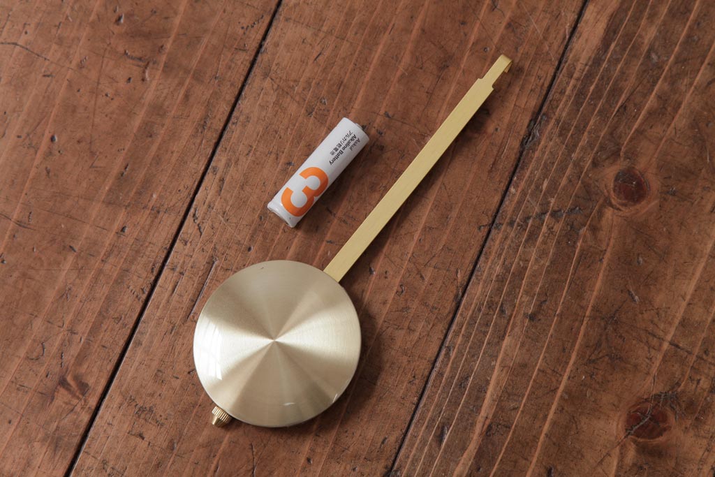 ムーブメントは新品の電池式に交換してあります。乾電池が付属します。振り子は飾りで、動きますが針と連動はしていません。
