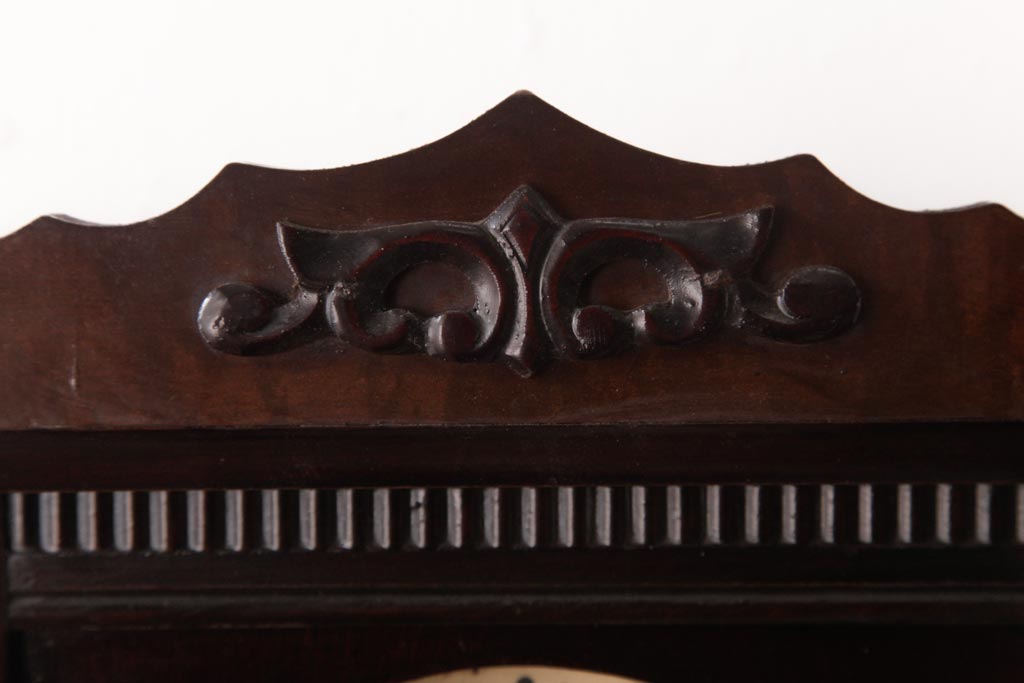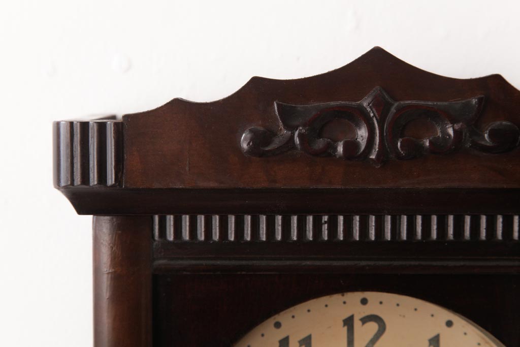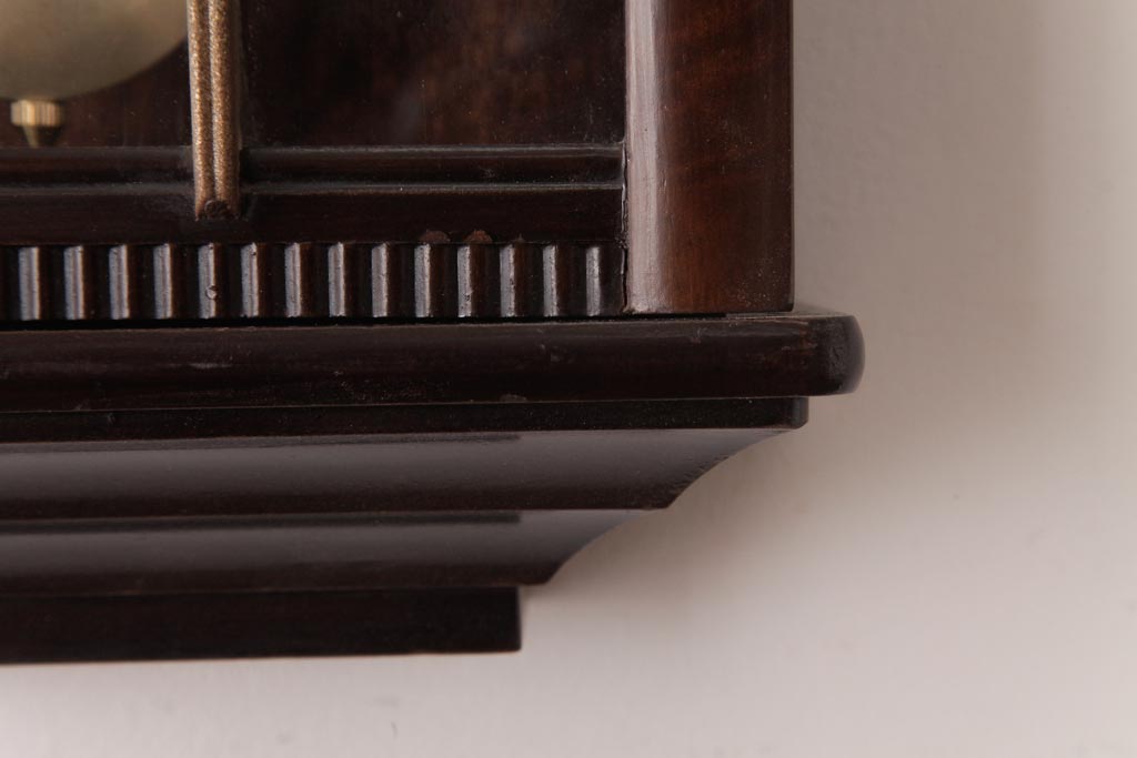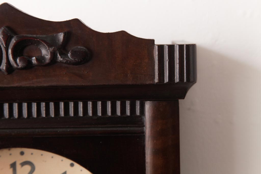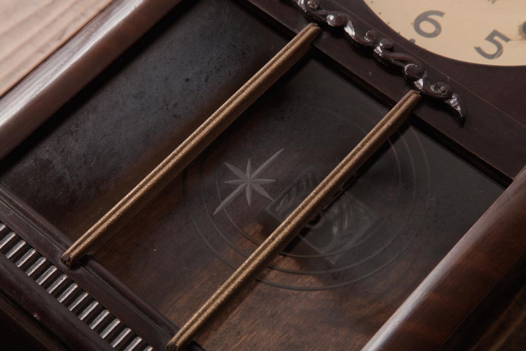 ムーブメントは新品の電池式に交換してあります。乾電池が付属します。振り子は飾りで、動きますが針と連動はしていません。