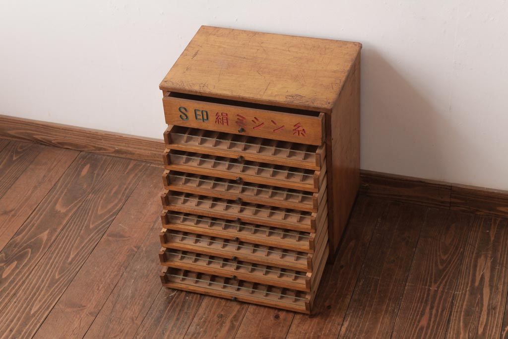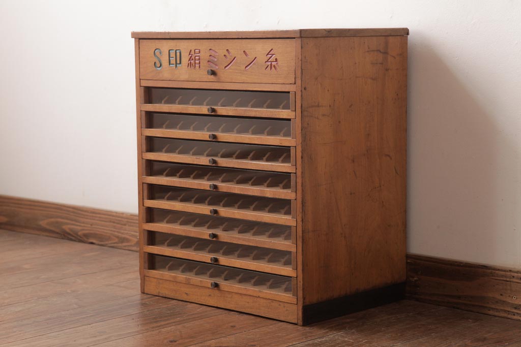 アンティーク雑貨 S印 昭和レトロな佇まいが魅力のミシン糸ケース(収納棚)です。