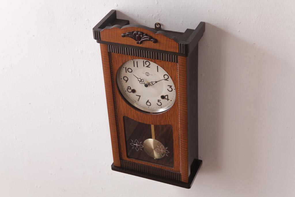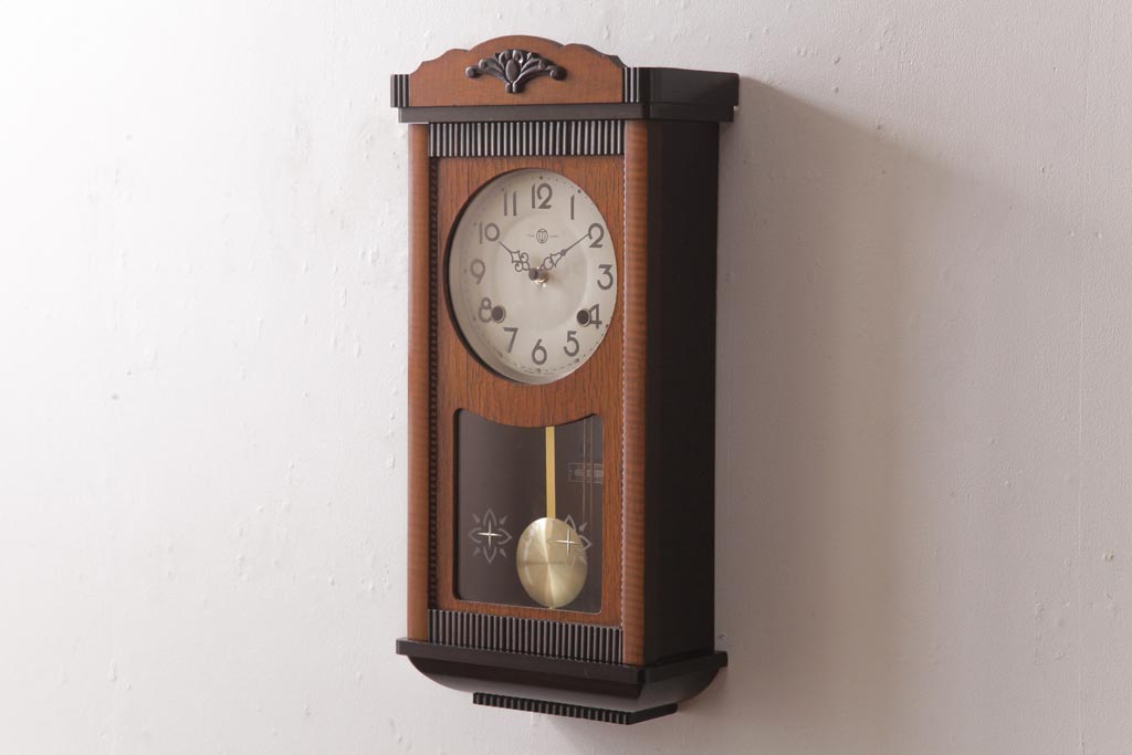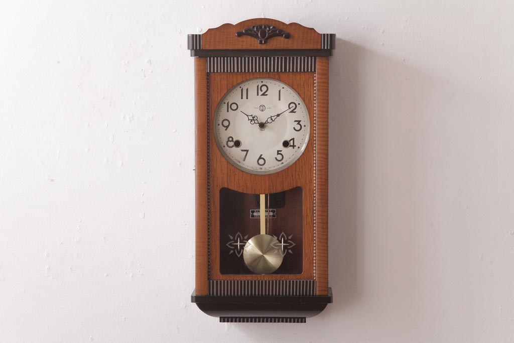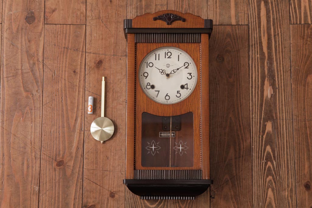 レトロ雑貨 つつみ時計店 内部交換済・電池式 明るい木色の柱時計(振り子時計、壁掛け時計)
