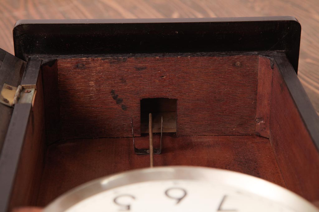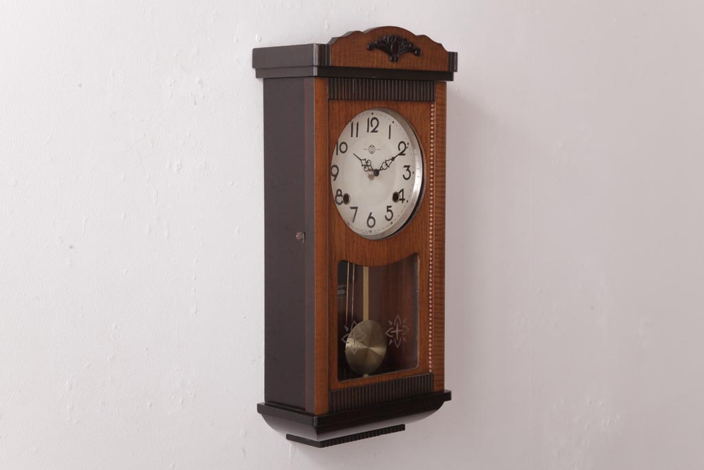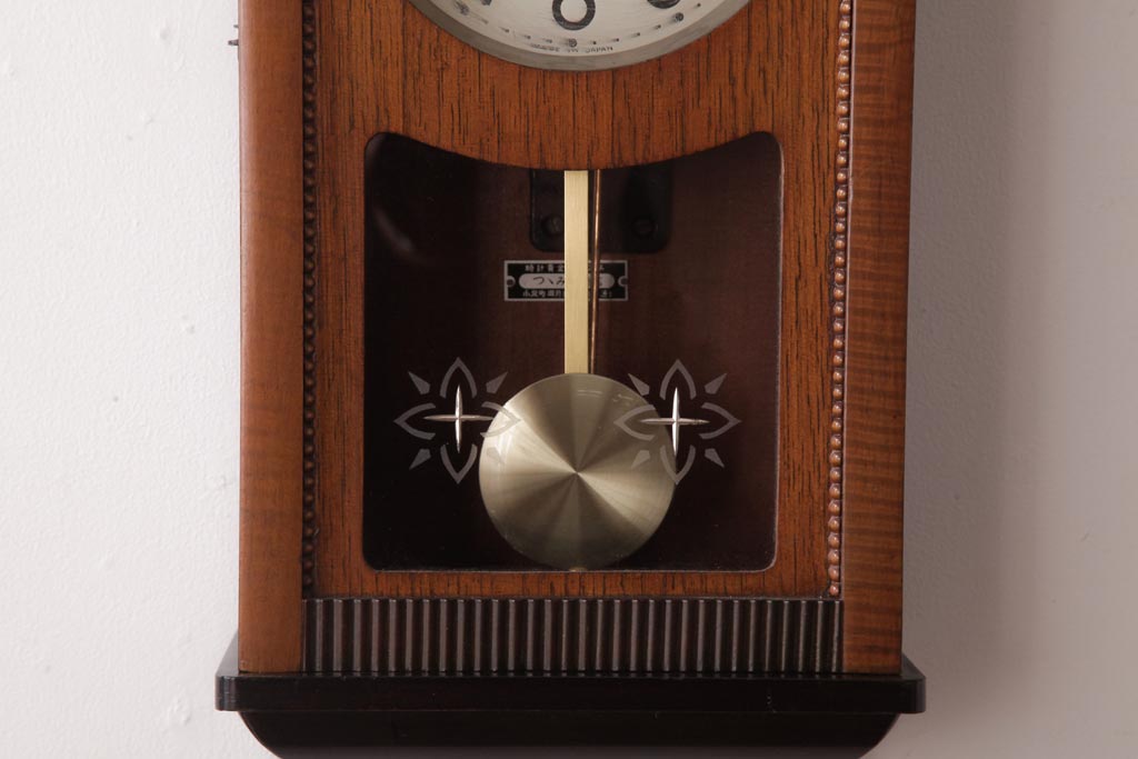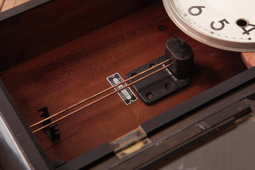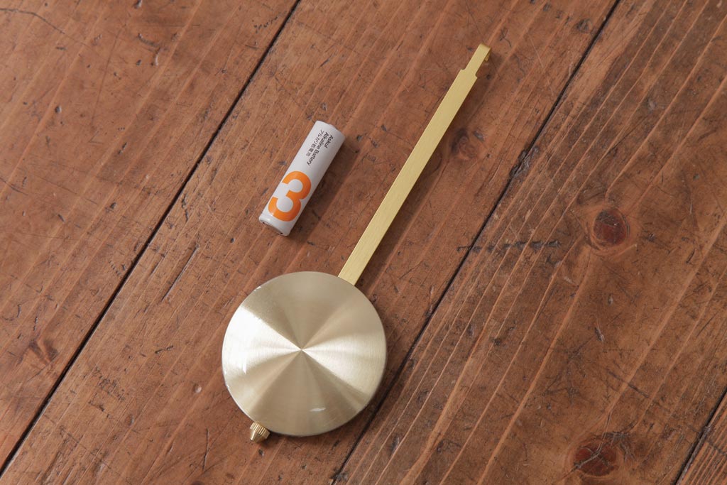 ムーブメントは新品の電池式に交換してあります。乾電池が付属します。振り子は飾りで、動きますが針と連動はしていません。