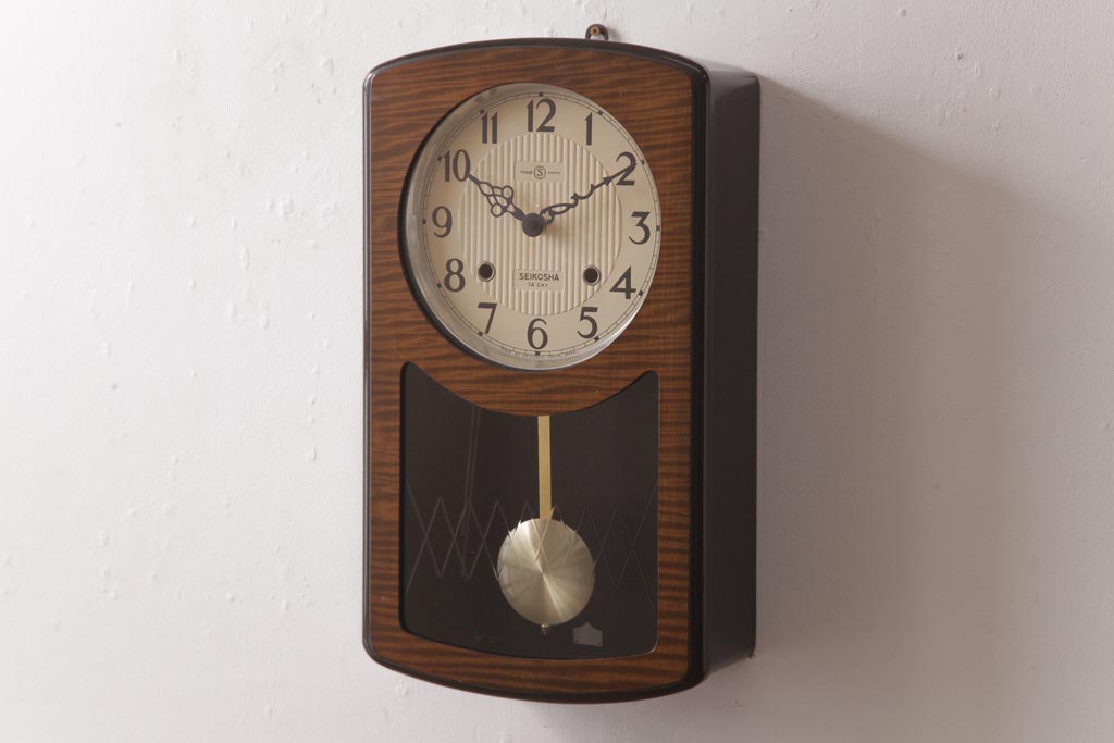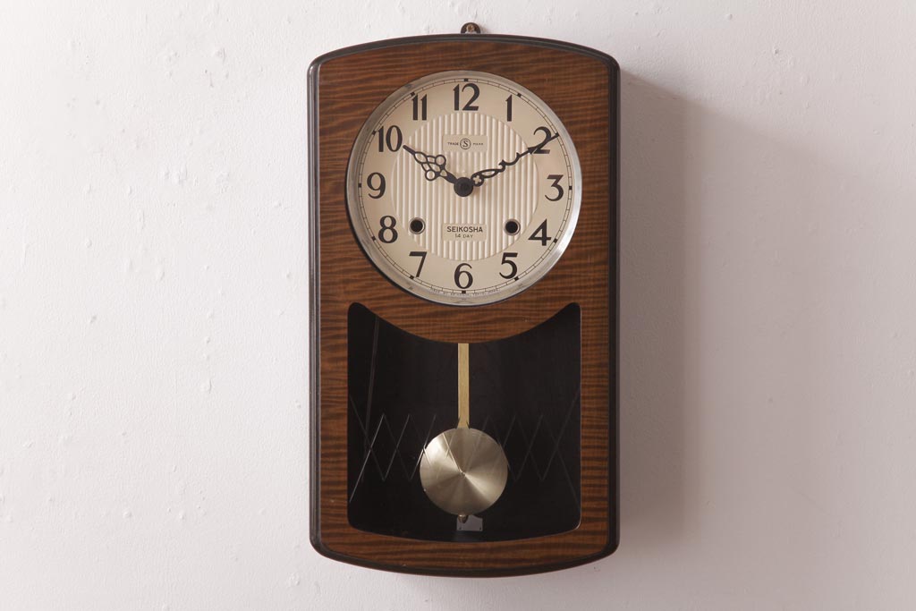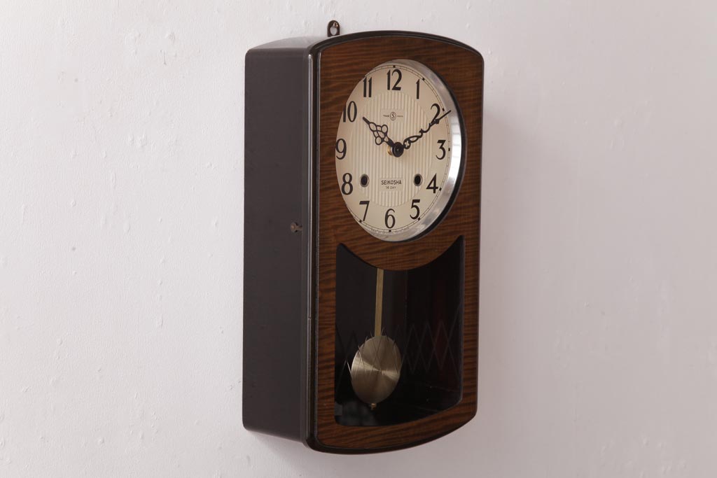 アンティーク雑貨 SEIKOSHA(精工舎、セイコー) 内部交換済・電池式 14DAY 丸みのあるフォルムの掛時計(柱時計、振り子時計)(R-036558)です。