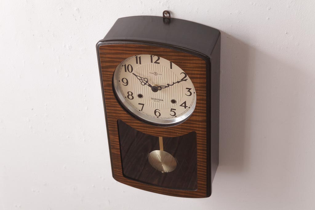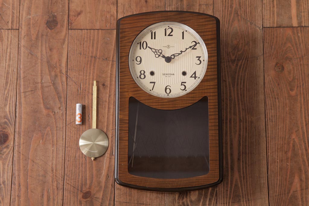 時計> 掛け時計 > アンティーク雑貨 SEIKOSHA(精工舎、セイコー) 内部交換済・電池式 14DAY 丸みのあるフォルムの掛時計(柱時計、振り子時計)(R-036558)
