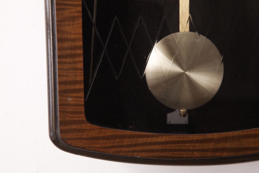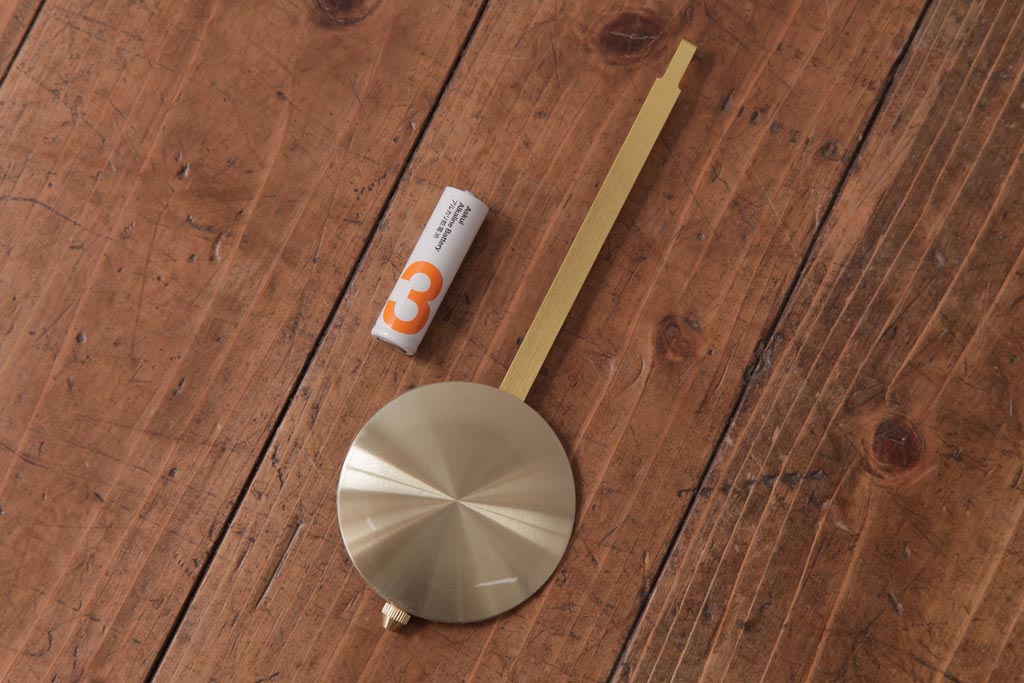 ムーブメントは新品の電池式に交換してあります。乾電池が付属します。振り子は飾りで、動きますが針と連動はしていません。