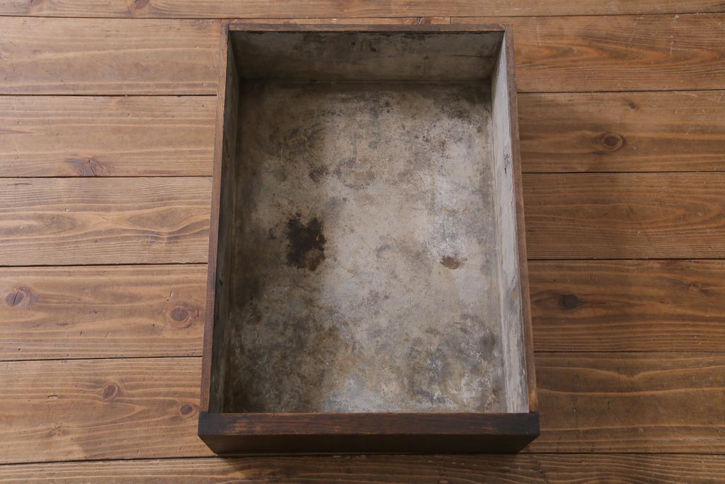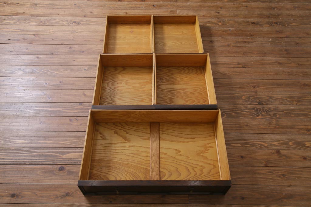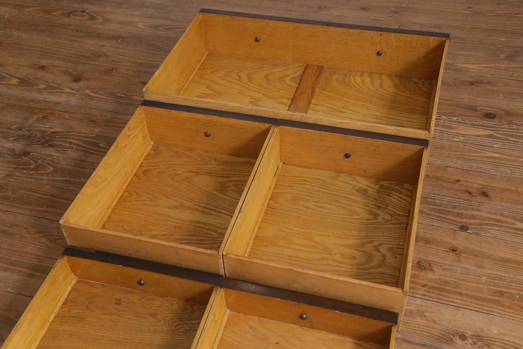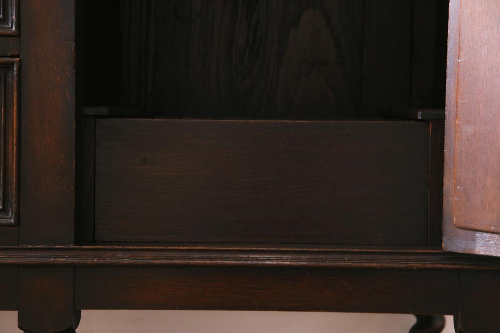 右側の戸棚の内部に備わっているトレイは汚れがございますが、隅々まで清掃していますので安心してお使いいただけます。ワインボトルや瓶類などの収納にいかがでしょうか。また引き出し内部も当店にて清掃済みです。11枚目の画像と併せてご確認をお願いします。