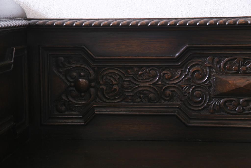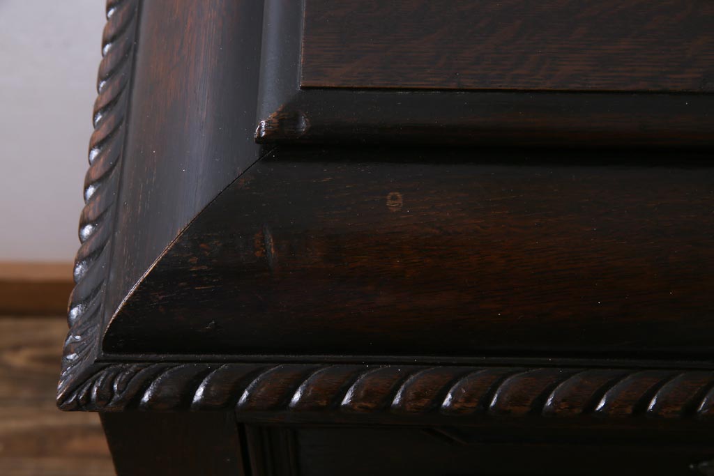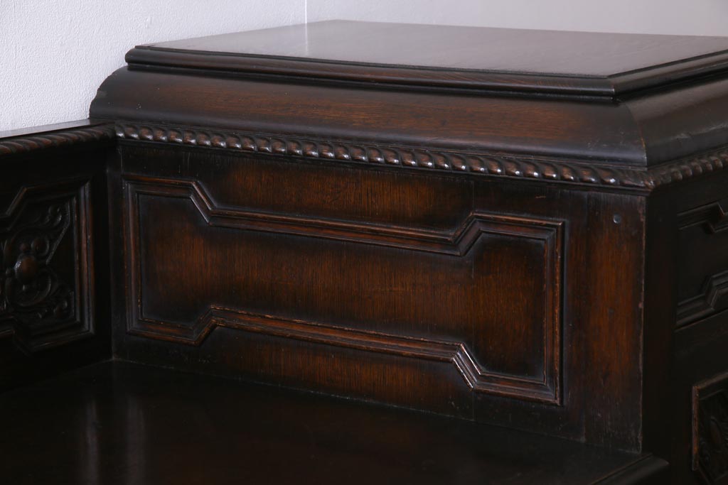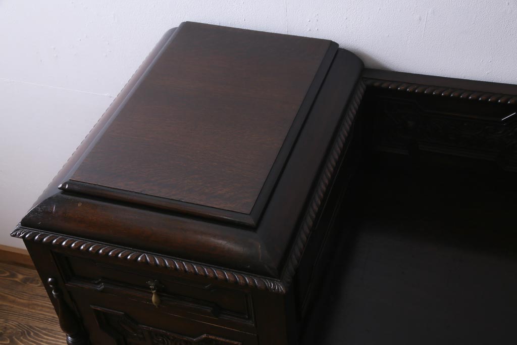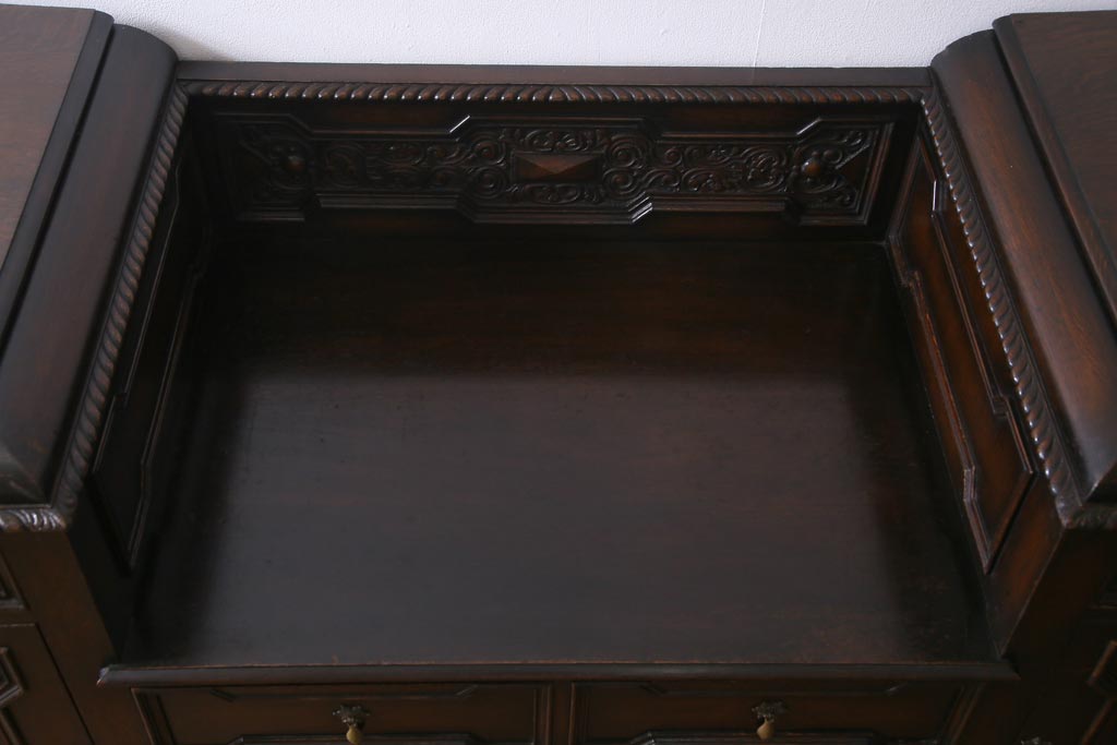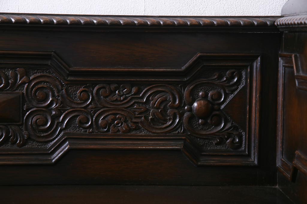堂々とした重厚感のある佇まいが魅力的なイギリスアンティークのサイドボードです。大振りなサイズに迫力のある彫刻が目を引きます。その他にも天板周りや脚、取っ手など、どこを見ても作り手のこだわりが感じられる逸品です。左右と中央で高さの違う天板は、花瓶やキャンドルを乗せるだけでも画になりそうですね。本格アンティークスタイルにいかがでしょうか。