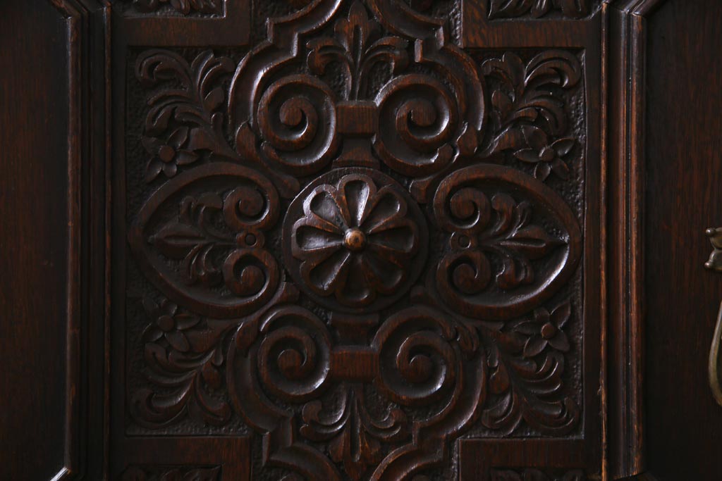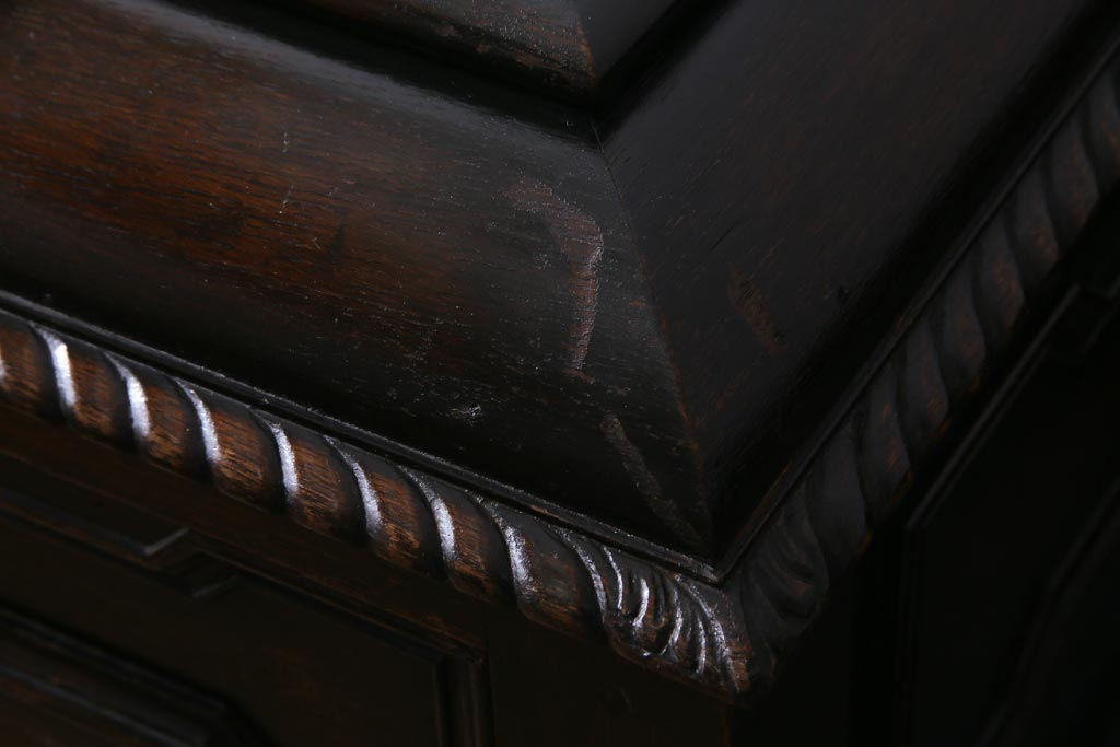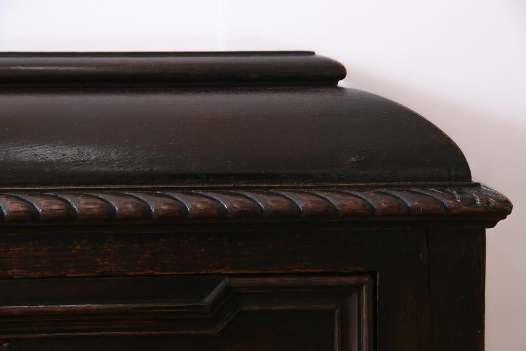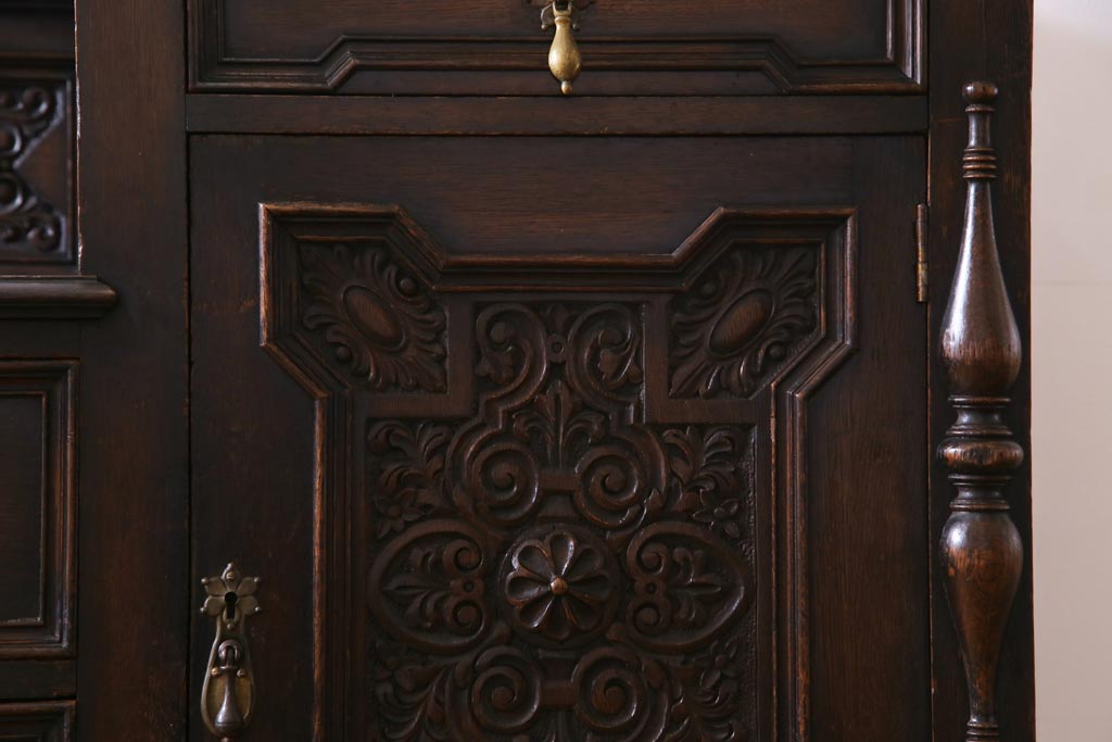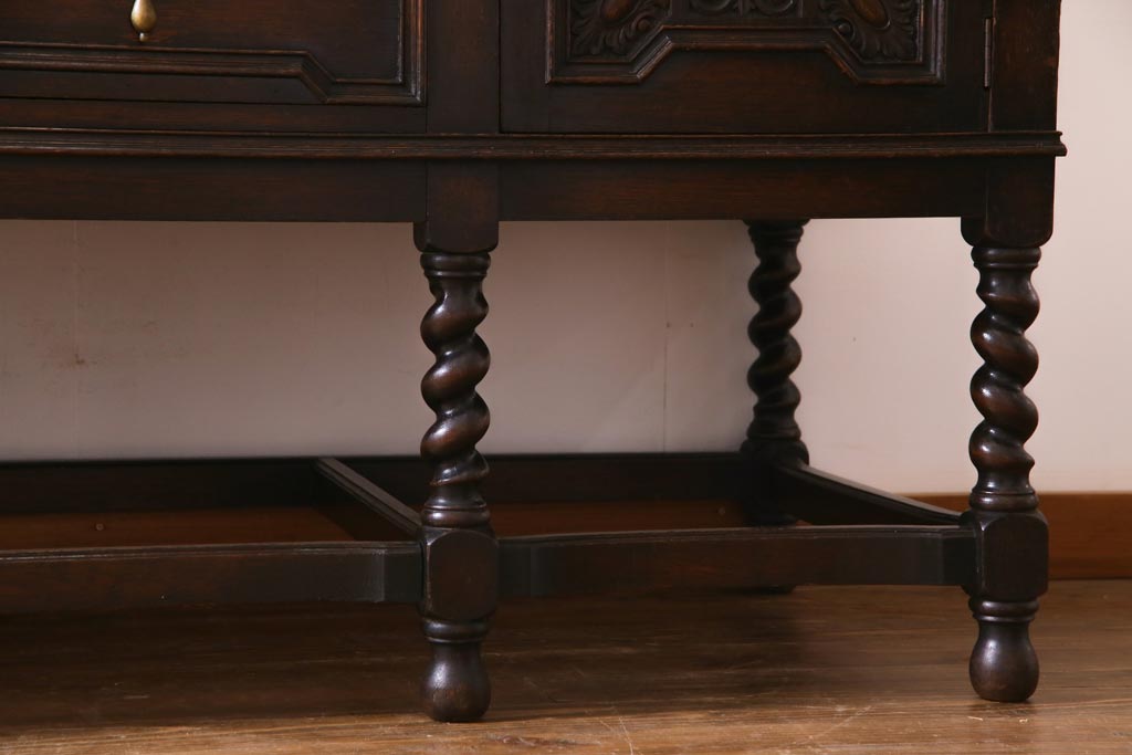 - 扉と天板周りに見られる見事な彫り装飾に、螺旋(らせん)状が美しさを放つツイスト状の脚、そして垂れ下がるように付いた取っ手。重厚感の中に見られる繊細なデザインが目を惹き、華やかさのあるお品です。その数々の装飾はヨーロッパらしい優美さを演出し、凛とした強さと美しさが感じられますね。お部屋にもエレガントさを演出してくれますよ。