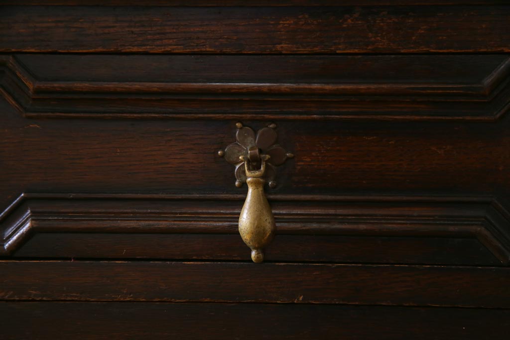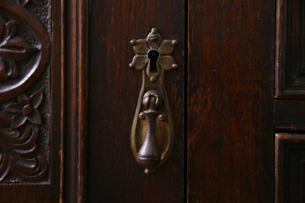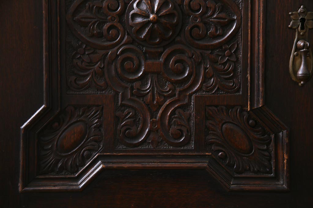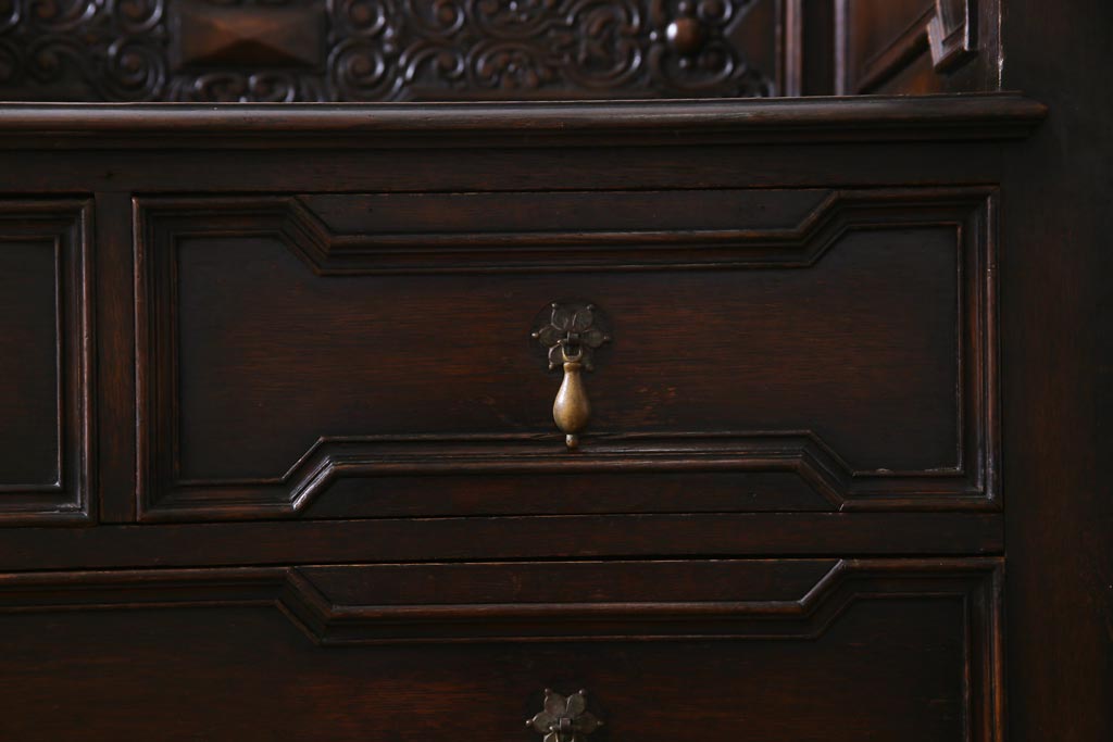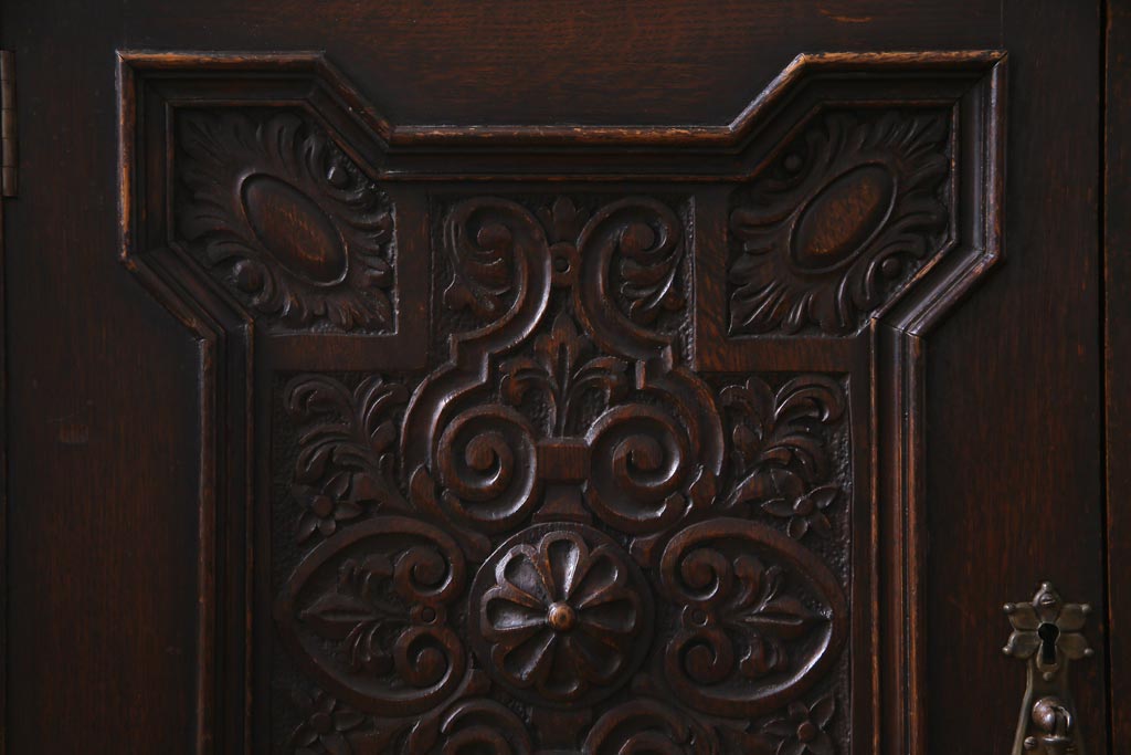 - 扉と天板周りに見られる見事な彫り装飾に、螺旋(らせん)状が美しさを放つツイスト状の脚、そして垂れ下がるように付いた取っ手。重厚感の中に見られる繊細なデザインが目を惹き、華やかさのあるお品です。その数々の装飾はヨーロッパらしい優美さを演出し、凛とした強さと美しさが感じられますね。お部屋にもエレガントさを演出してくれますよ。