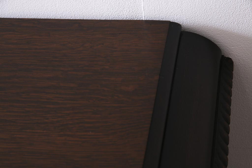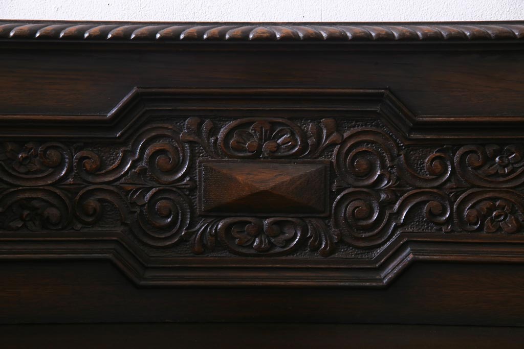 扉や中央の天板周りに見られる見事な装飾は思わず見とれてしまう美しさです。立体的で、お部屋にゴージャスな雰囲気を演出してくれますよ。 当店で天板にクリア塗装を施しております。