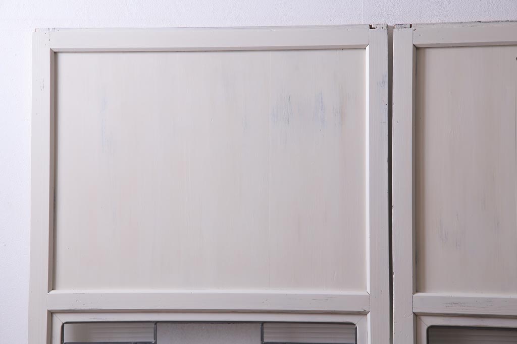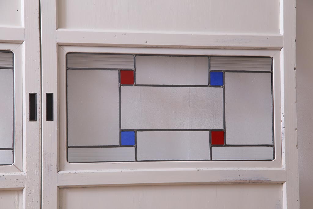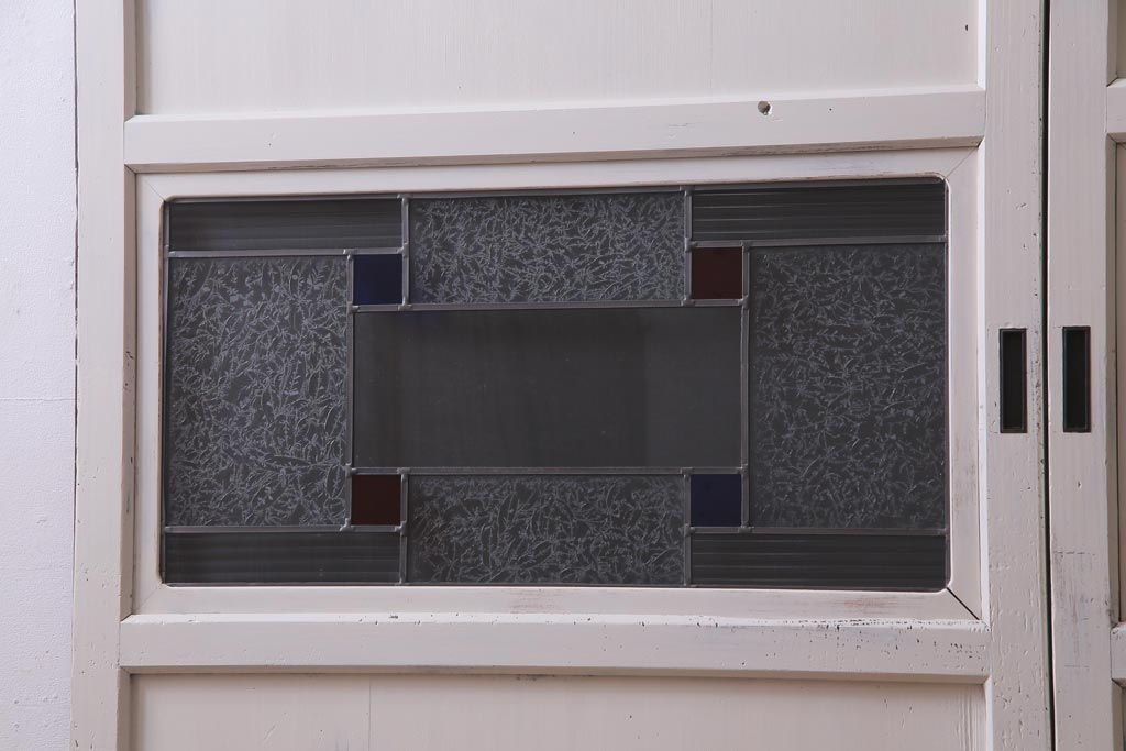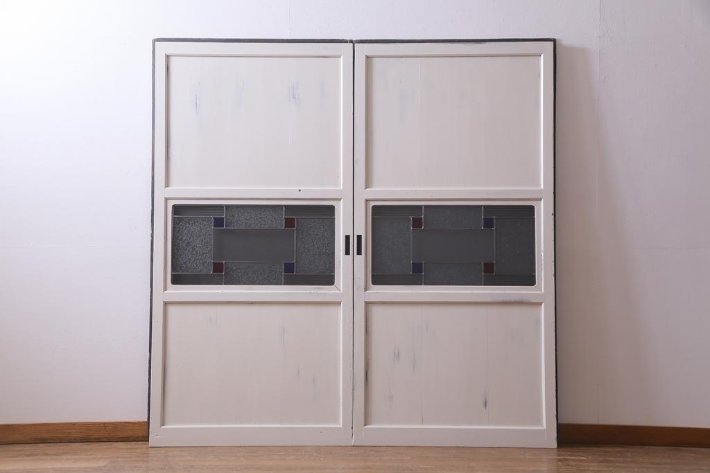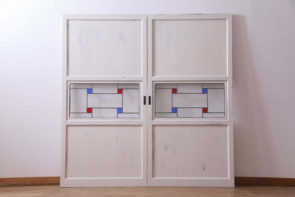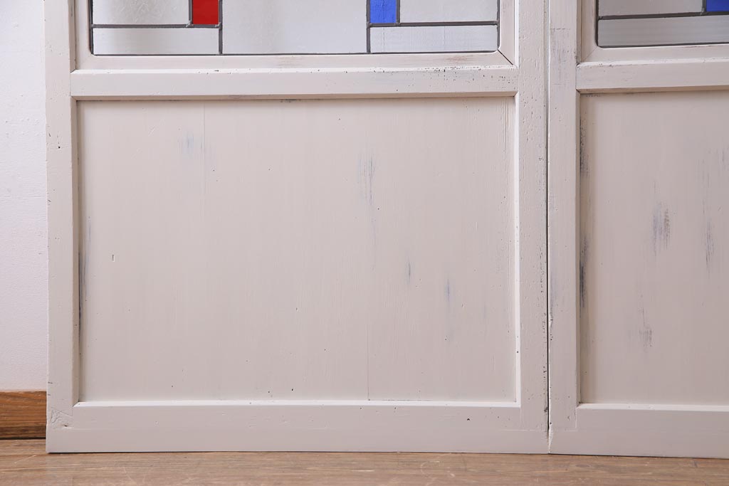 ラフジュ工房> ドア・建具> 色ガラス・ステンド入り建具 > アンティーク建具 ラフジュ工房オリジナルステンドグラス 結霜ガラス・モールガラス入り アンティークペイントに色ガラスが映える板戸2枚セット(建具、引き戸、ガラス帯戸)(R-036742)