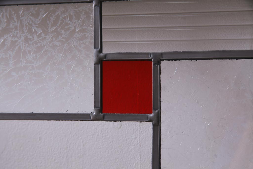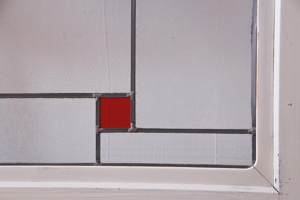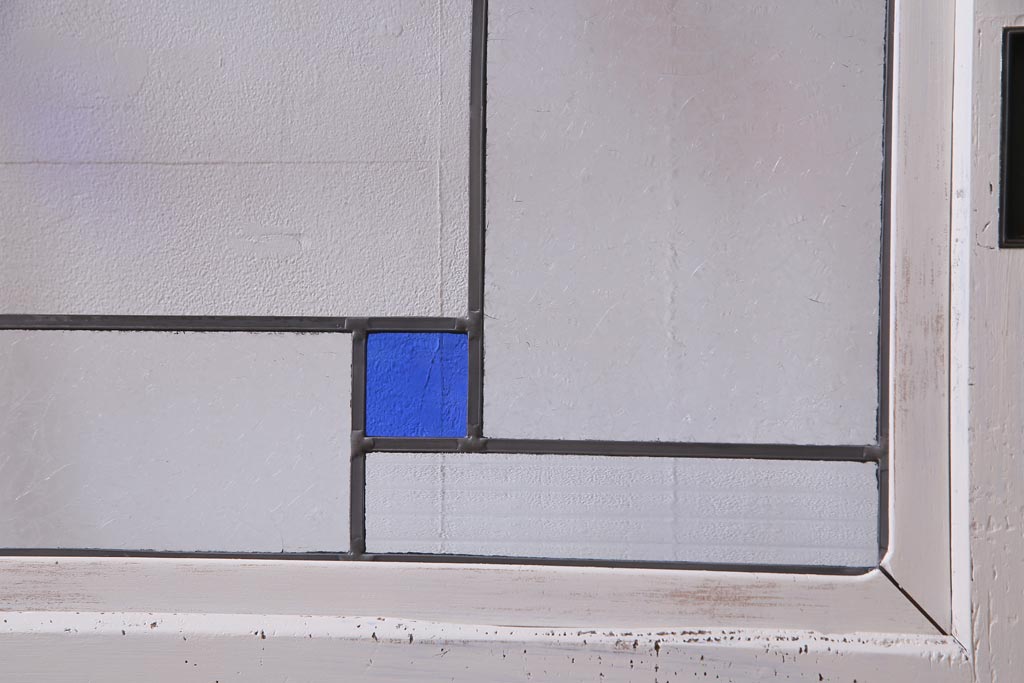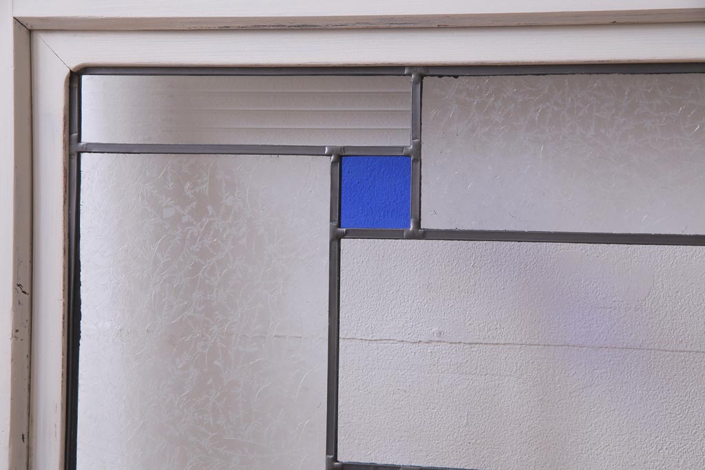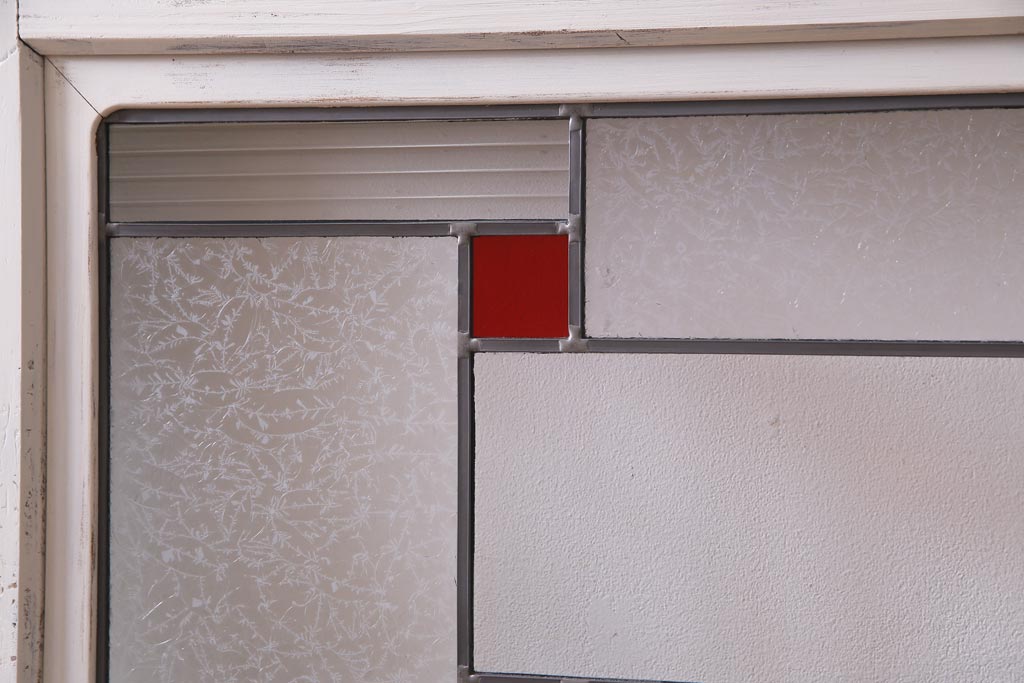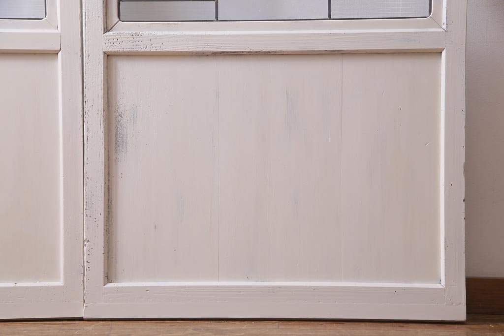 ラフジュ工房> ドア・建具> 色ガラス・ステンド入り建具 > アンティーク建具 ラフジュ工房オリジナルステンドグラス 結霜ガラス・モールガラス入り アンティークペイントに色ガラスが映える板戸2枚セット(建具、引き戸、ガラス帯戸)(R-036742)