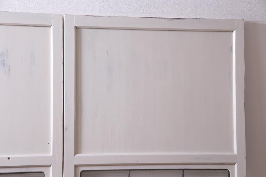 ラフジュ工房> ドア・建具> 板戸・帯戸 > アンティーク建具 ラフジュ工房オリジナルステンドグラス 結霜ガラス・モールガラス入り アンティークペイントに色ガラスが映える板戸2枚セット(建具、引き戸、ガラス帯戸)(R-036742)
