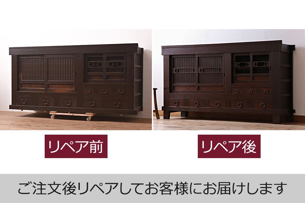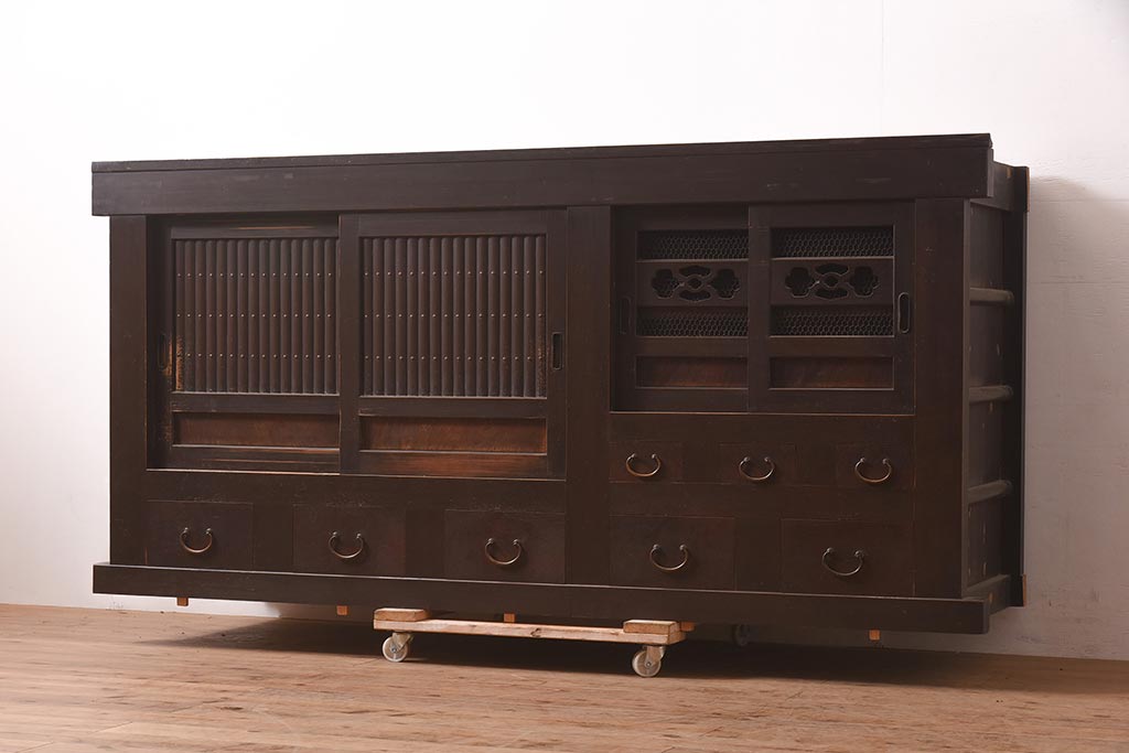 アンティーク家具 明治期 丸桟 銅金具 上手物の近江水屋箪笥キャビネット(収納棚、サイドボード、テレビ台)(R-036313)です。