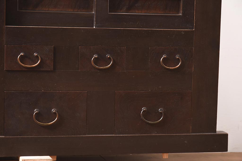 アンティーク家具 明治期 丸桟 銅金具 上手物の近江水屋箪笥キャビネット(収納棚、サイドボード、テレビ台)(R-036313)